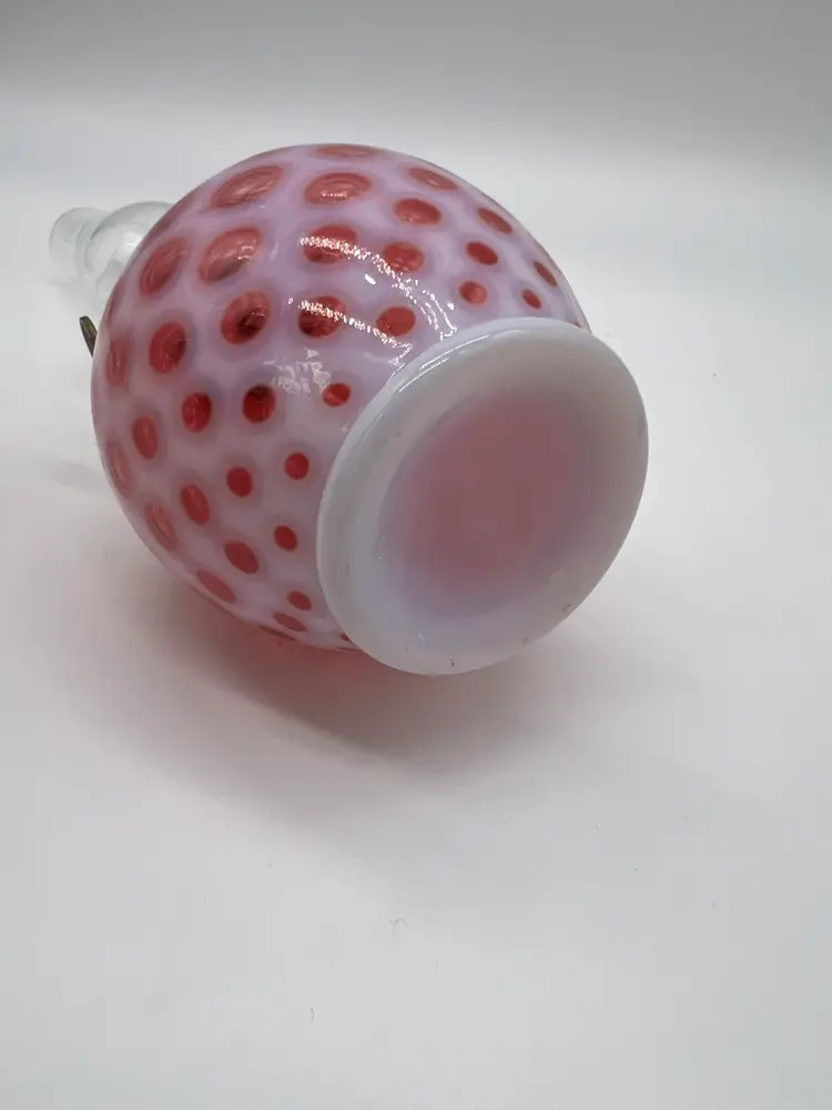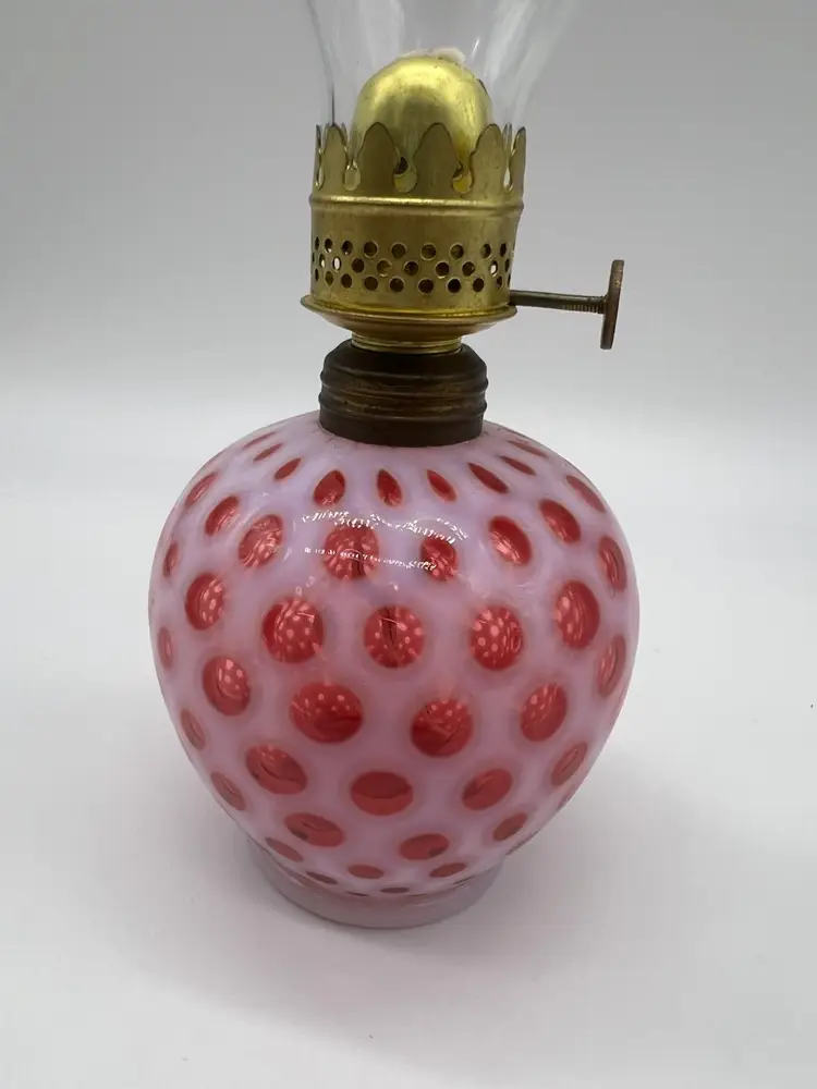 This exquisite Fenton Cranberry Opalescent Glass Coin Dot Mini Miniature Oil Lamp is a stunning example of craftsmanship. The rich cranberry coloration combined with the opalescent finish creates a beautiful visual effect, making it a perfect addition to any collection or home decor.