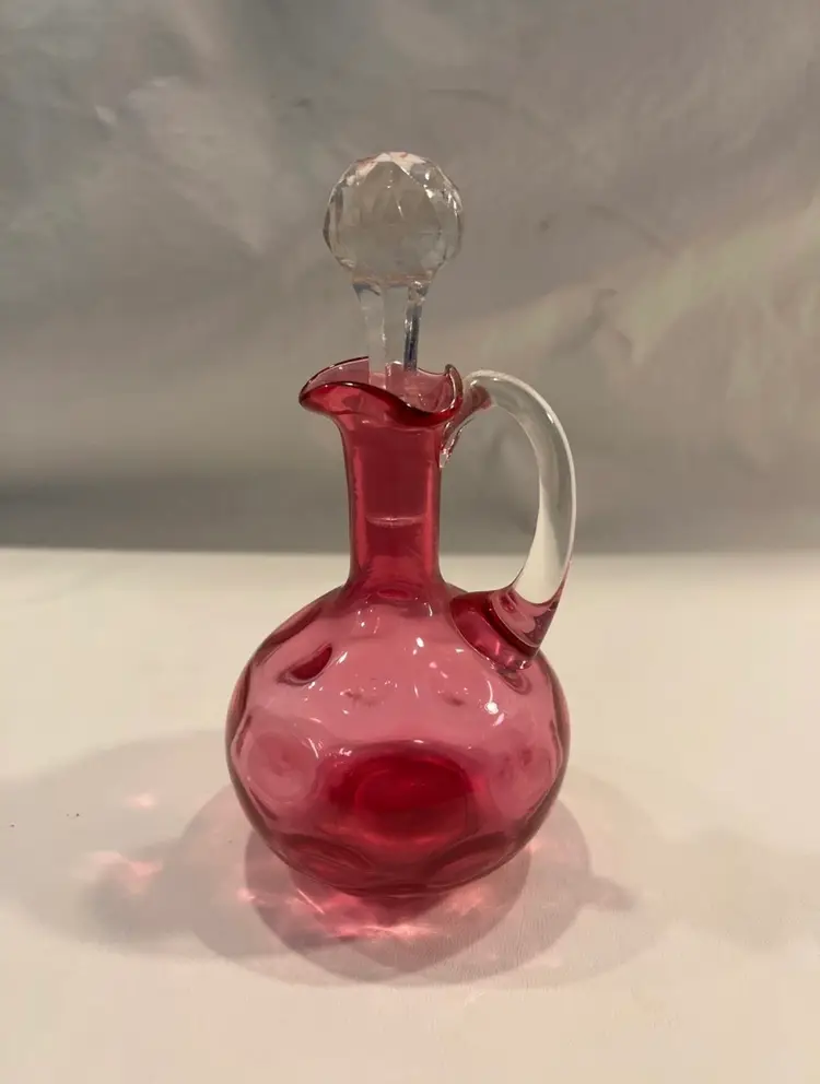 Beautiful vintage cranberry glass cruet, thumbprint optic pattern, cranberry glass cruet... this looks like Fenton though it's not marked. Cruet has no chips or cracks, the stopper does have a chip on the very bottom. Glass is cloudy where the stopper goes from the stopper.
