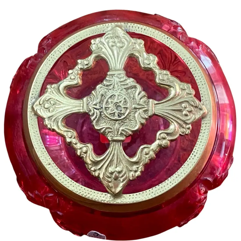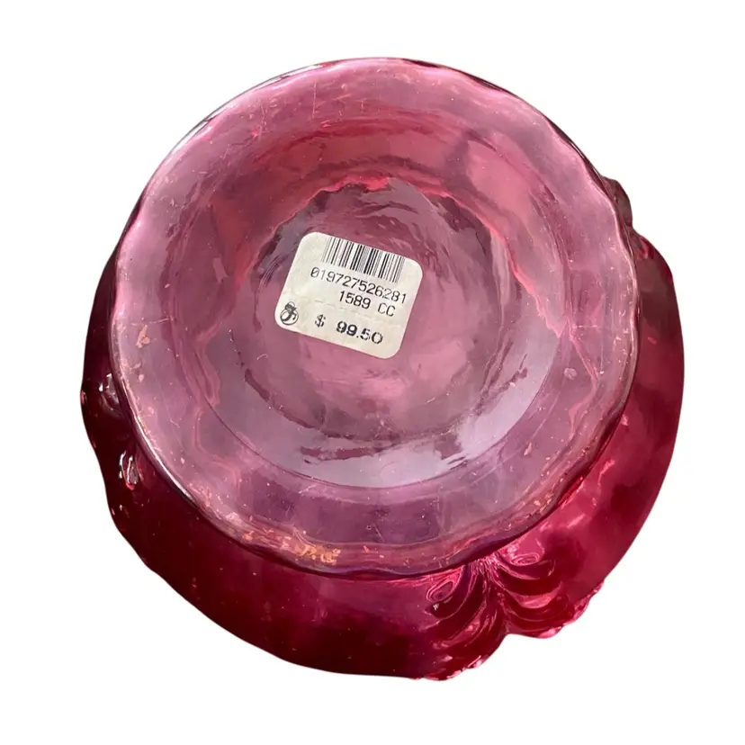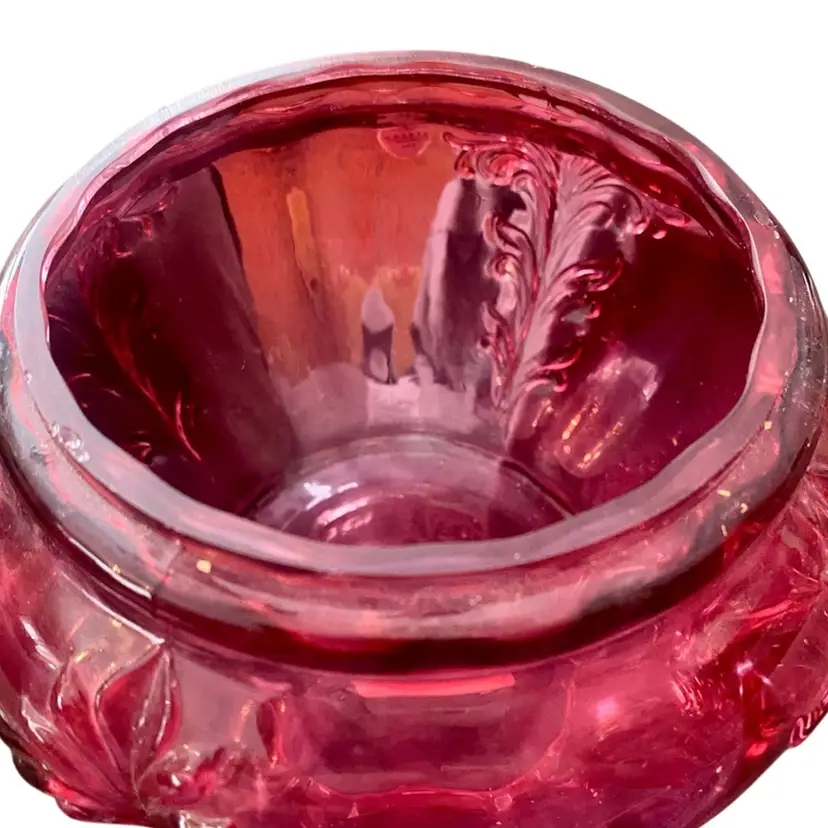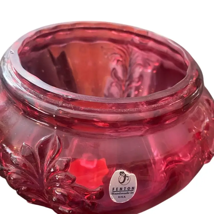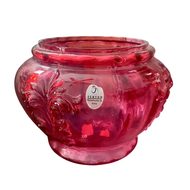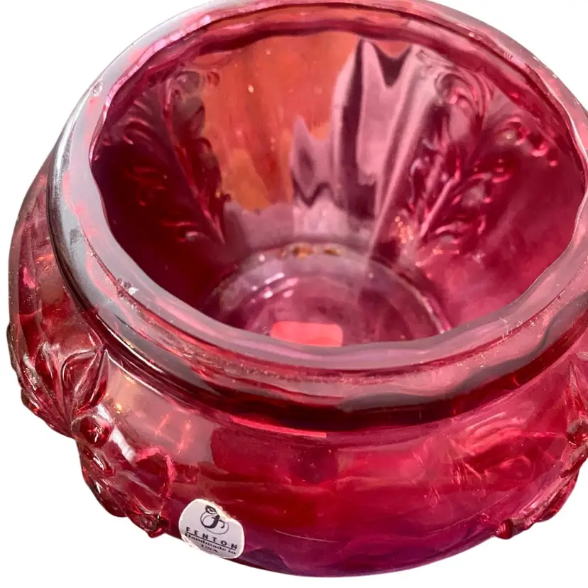 Fenton Glass Potpourri Jar with a Feather Pattern and Brass Top. Approximately 5.5” high and 6.5” wide. There are 3 small chips in the rim, but they aren't noticeable when the brass cover is on. Otherwise, condition is very good with no cracks or other chips. Fenton sticker remains on the jar and Fenton price sticker on the base.