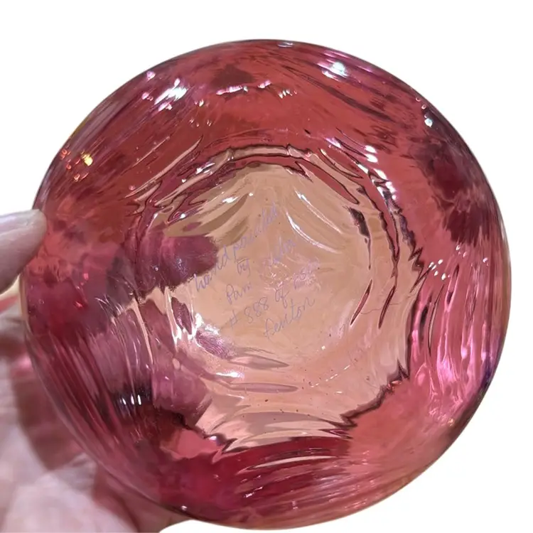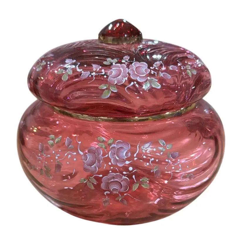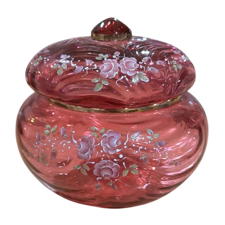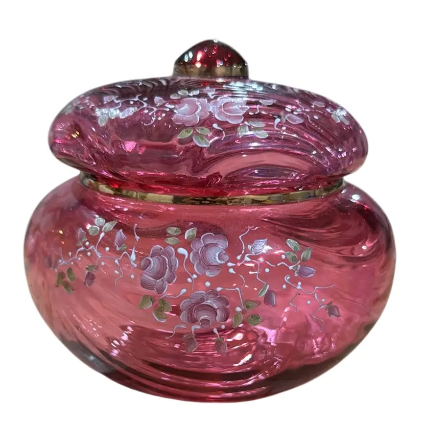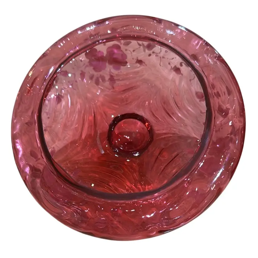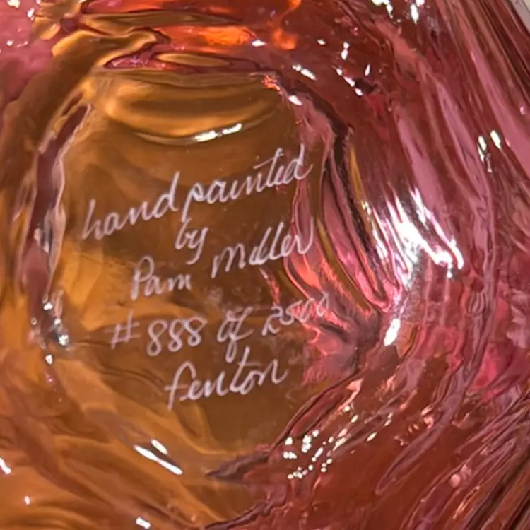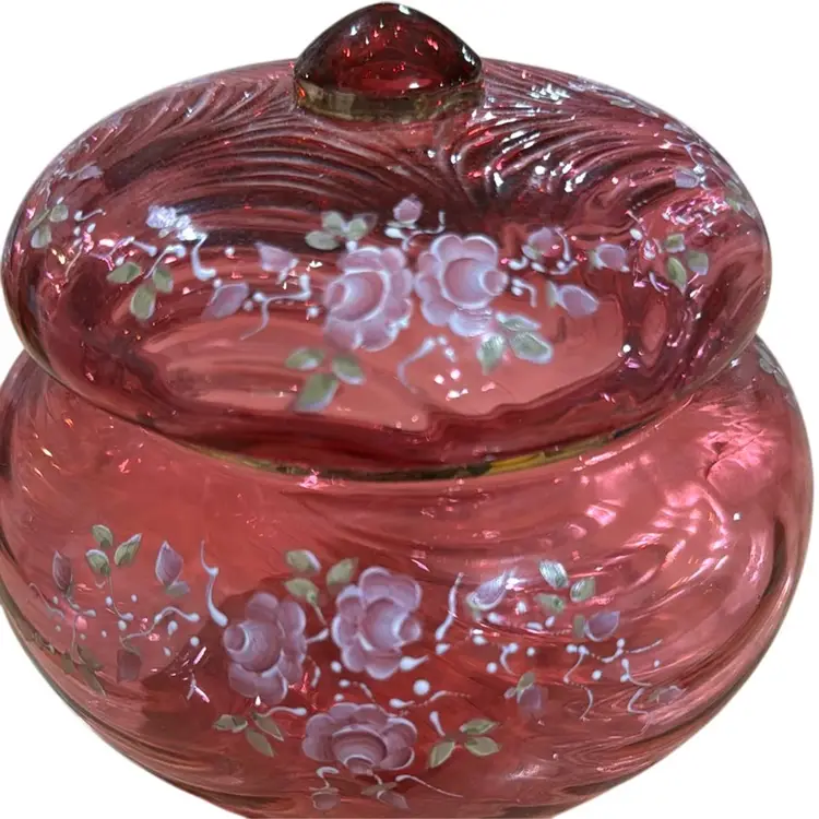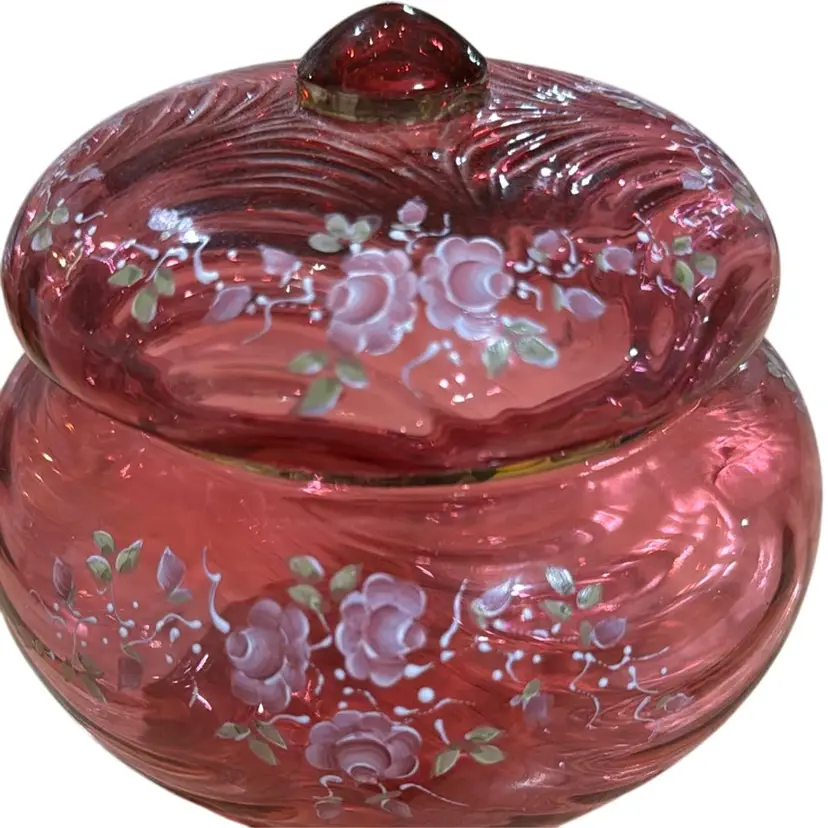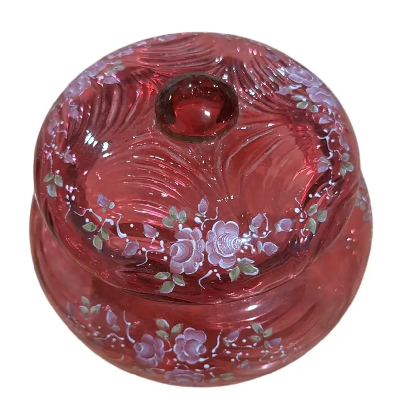 pretty Fenton cranberry glass powder jar with hand painted roses. There is a gold band around the top of the jar and around the knob on the lid. It is a limited edition #888 of 2500, hand painted by Pam Miller. It is excellent, no damage. It measures 4 1/2" high and 5 1/4" across.