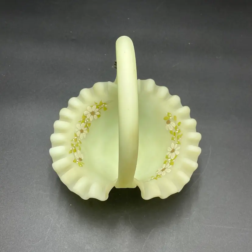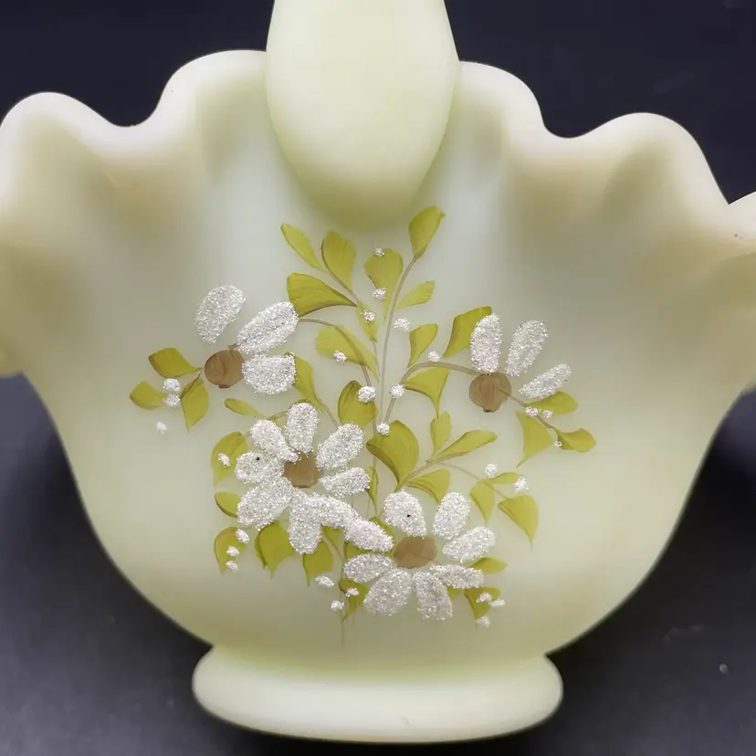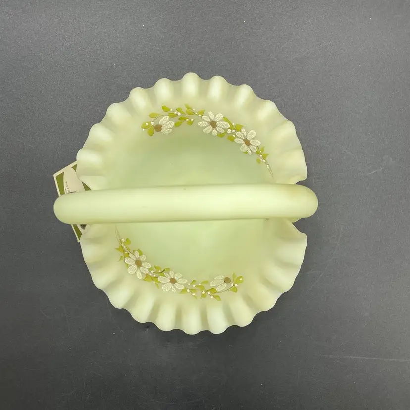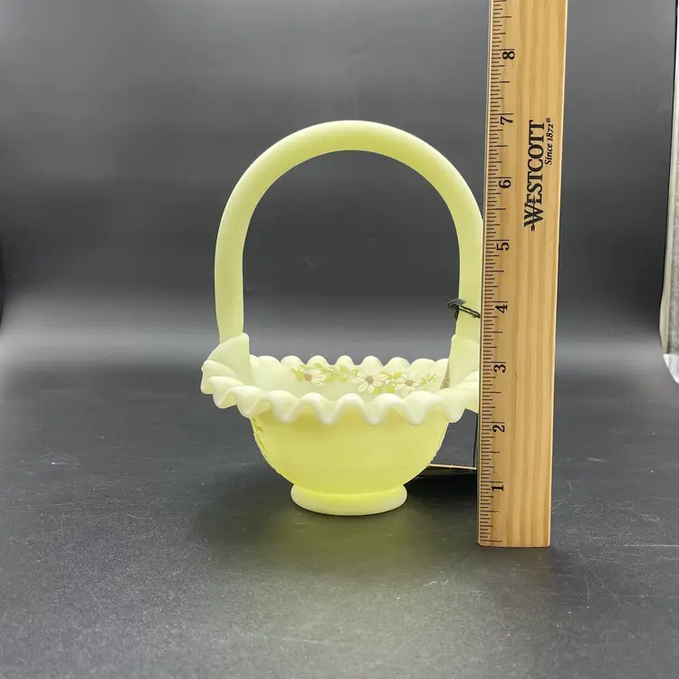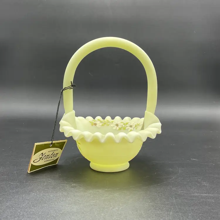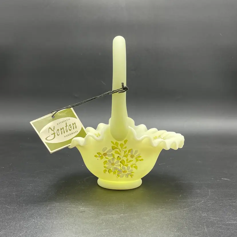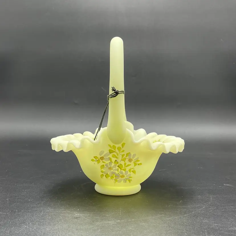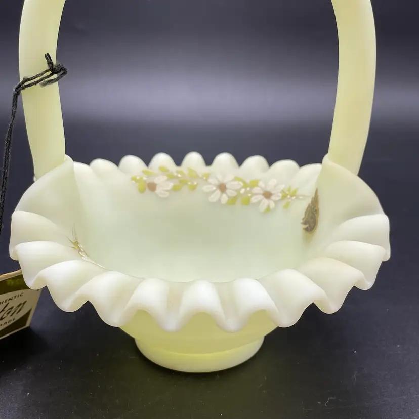 This is a vintage Fenton hand painted custard glass basket with a crimped ruffled edge. Still has its original tag and label. Glows under blacklight. Signed by artist and marked Fenton on the bottom. Measures approximately 7" tall x 6.5" across. No chips or cracks.