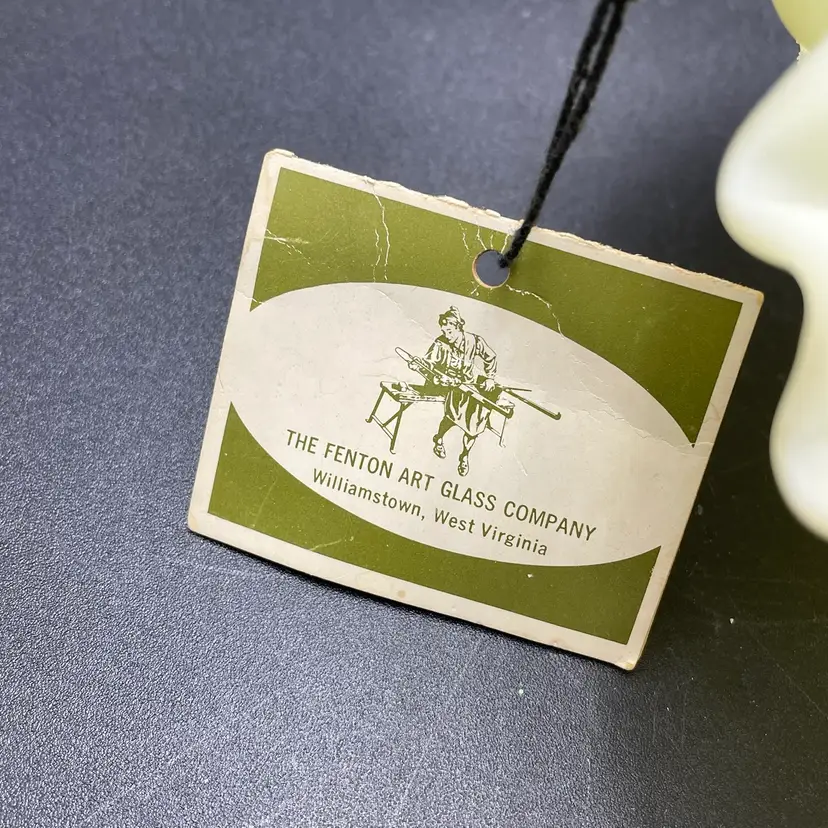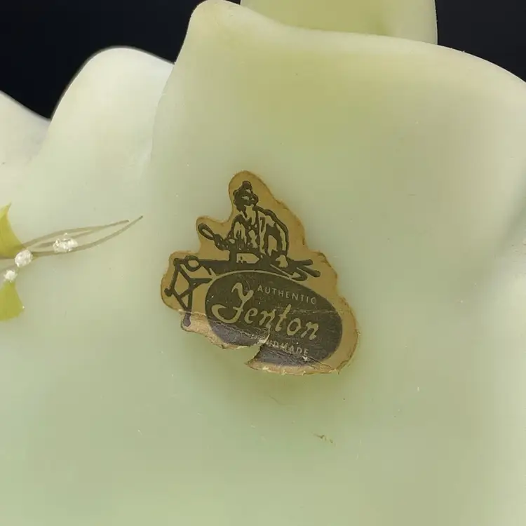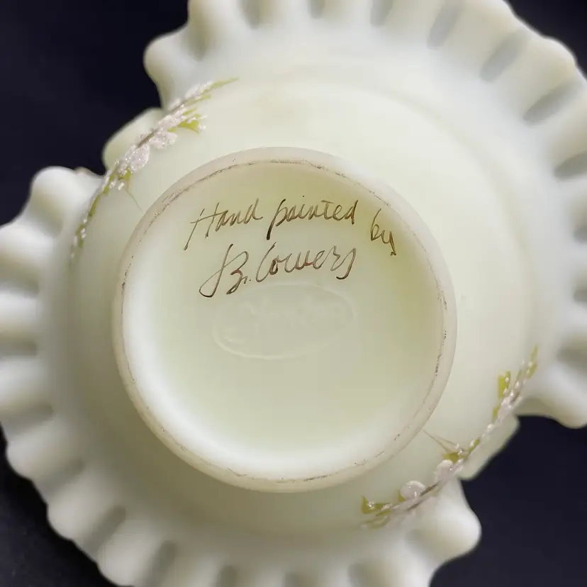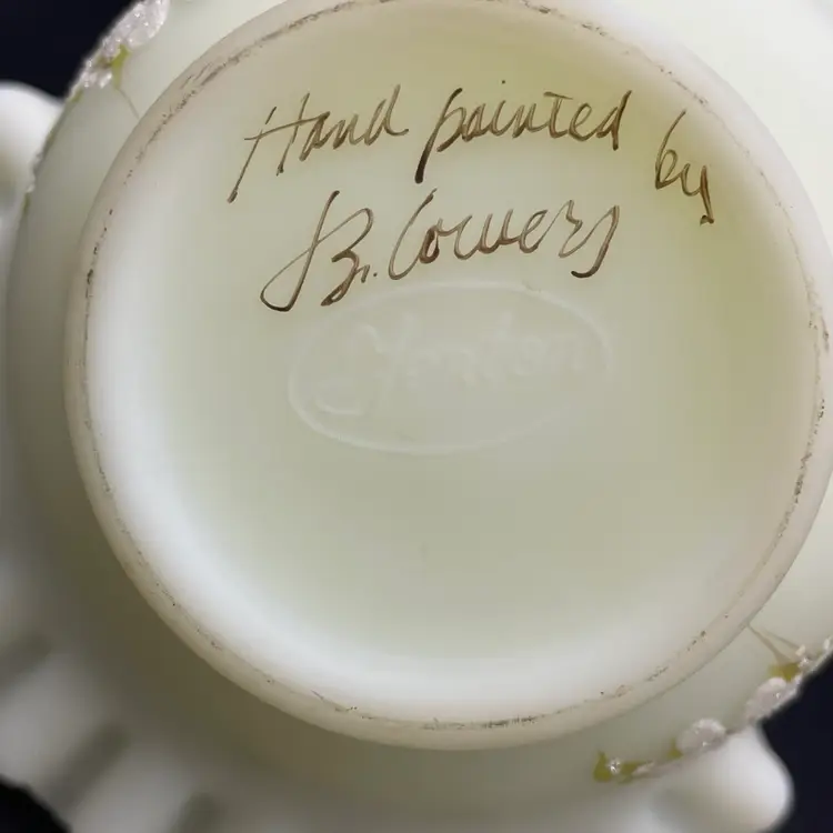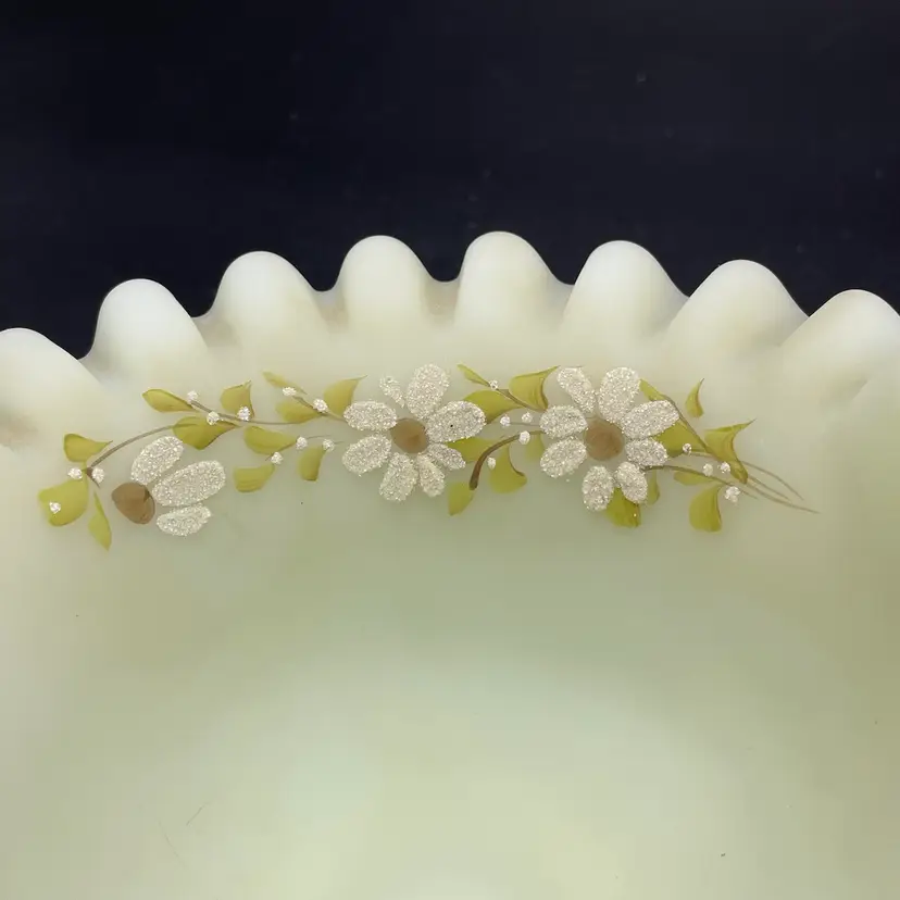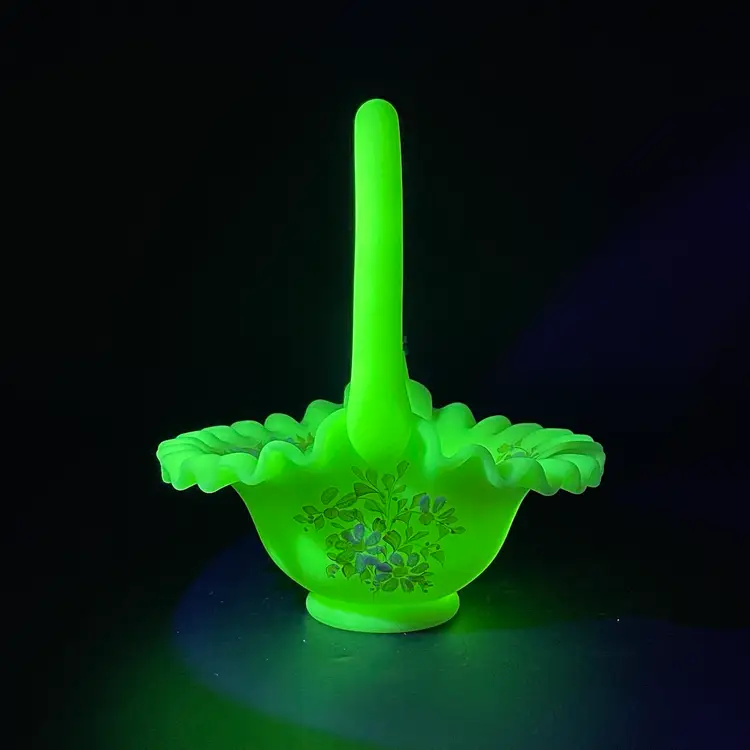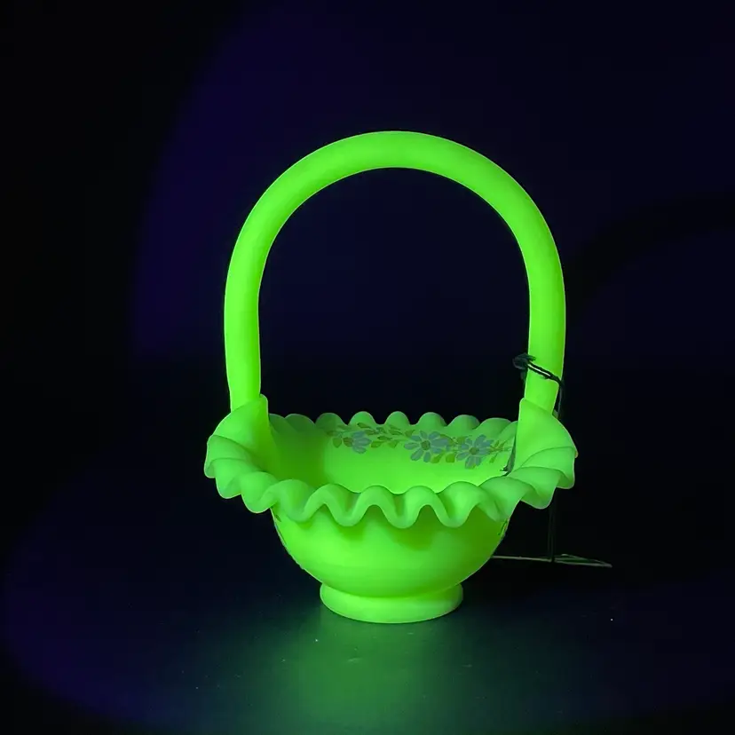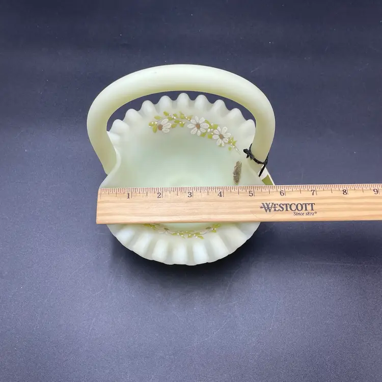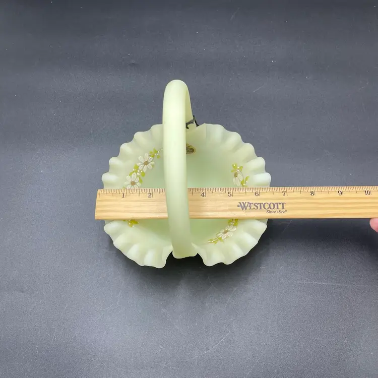 This is a vintage Fenton hand painted custard glass basket with a crimped ruffled edge. Still has its original tag and label. Glows under blacklight. Signed by artist and marked Fenton on the bottom. Measures approximately 7" tall x 6.5" across. No chips or cracks.