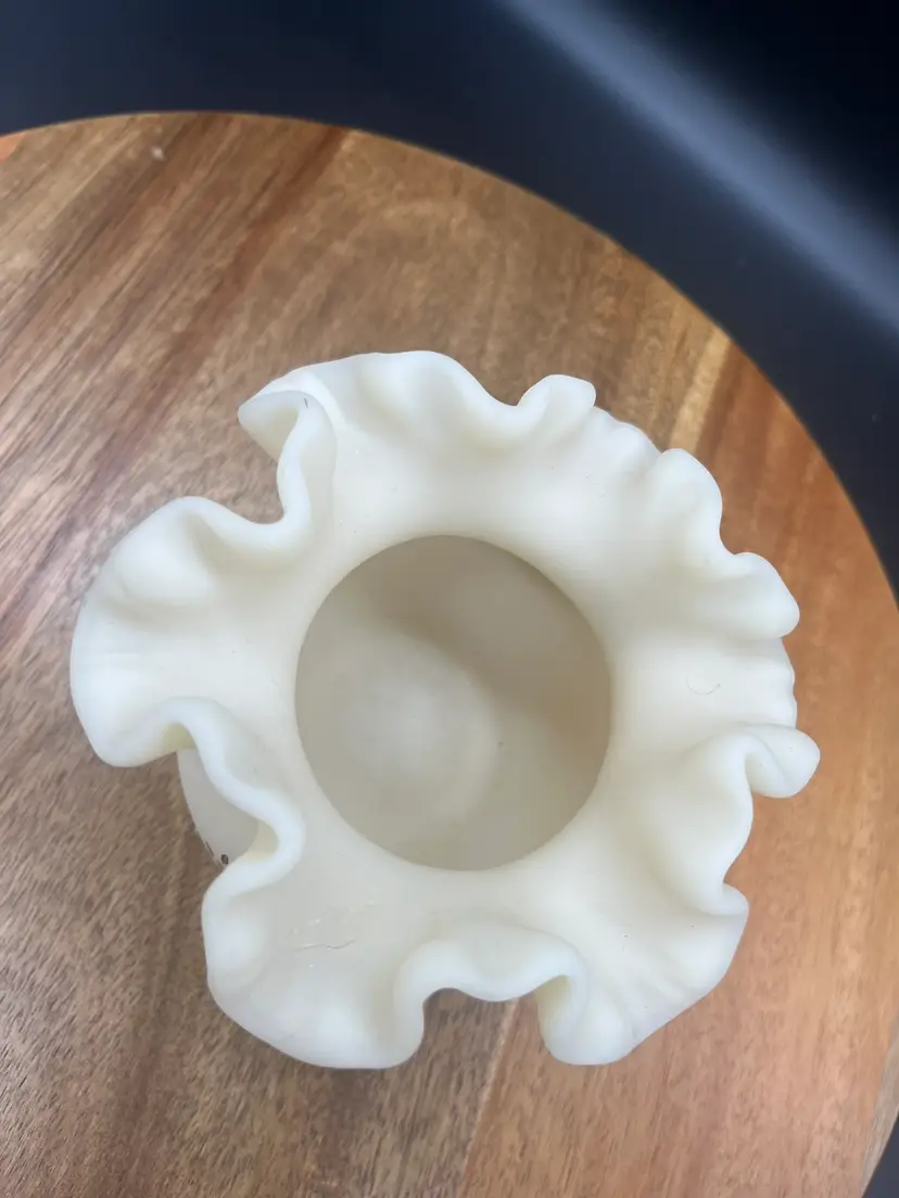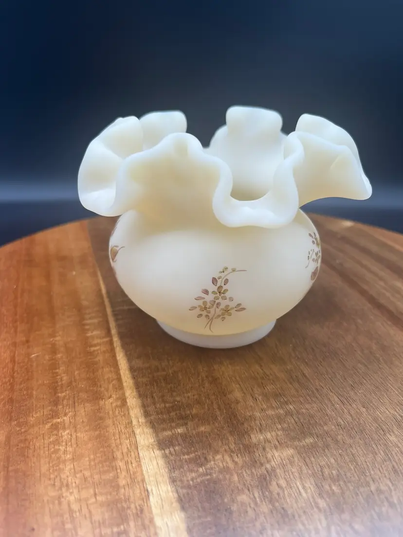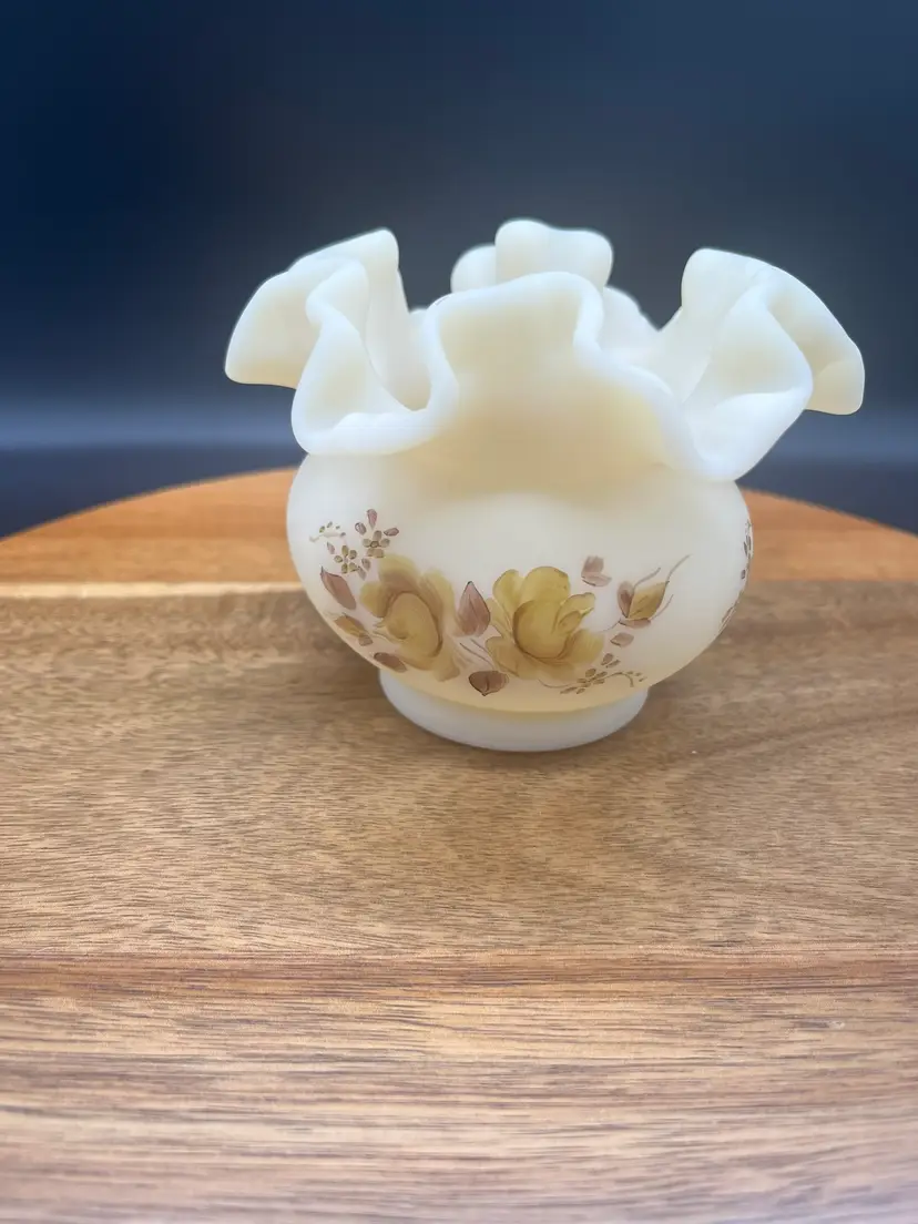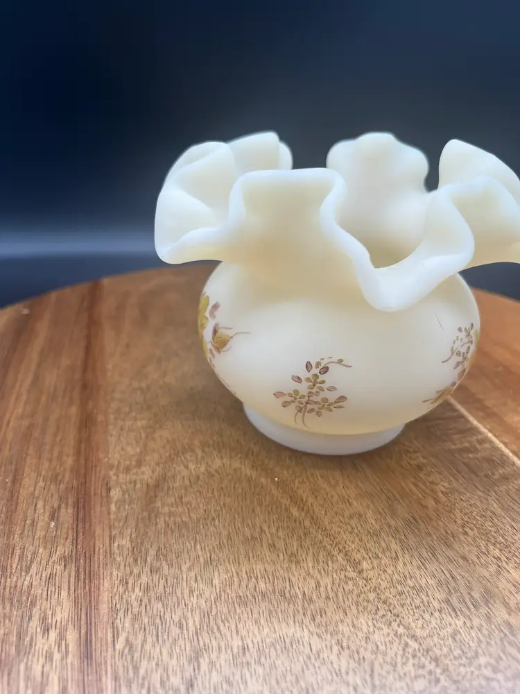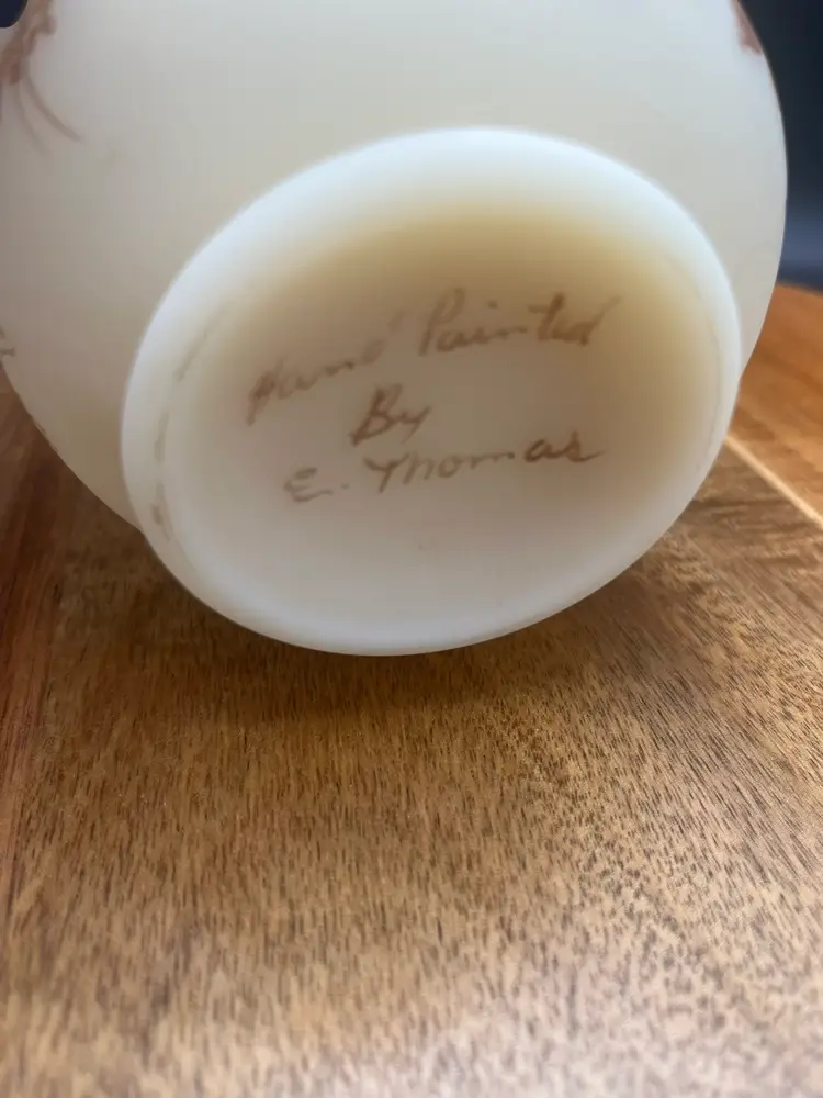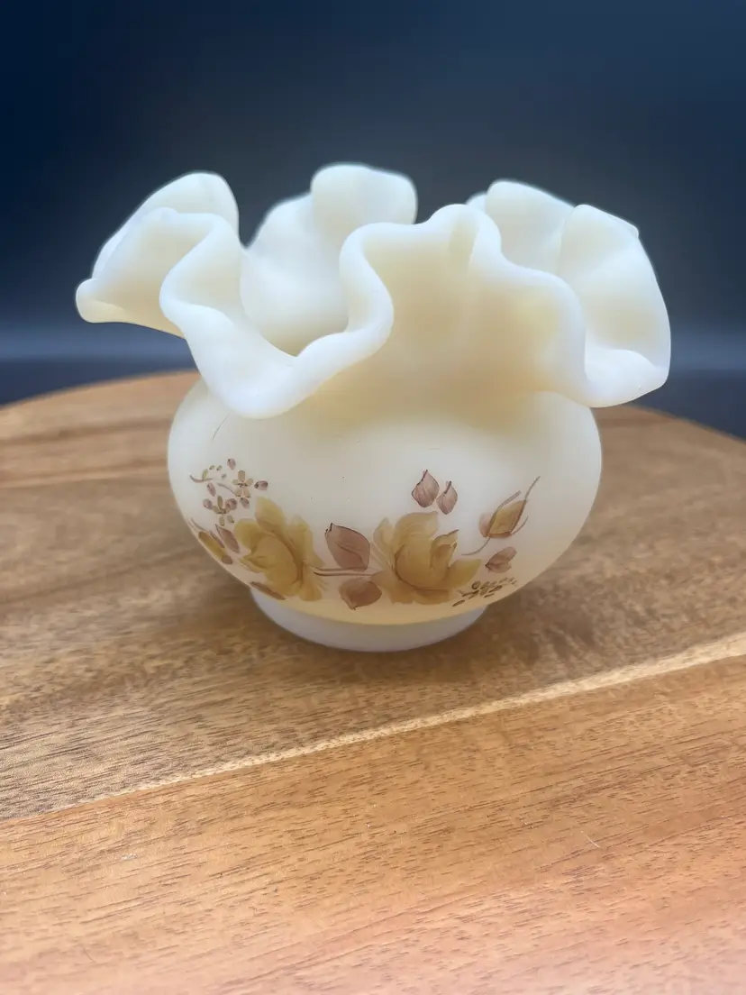 Fenton Custard Satin Glass Vase with Handpainted Roses and Ruffled Rim, Signed Cream colored with sepia handpainted flowers Signed on bottom "Hand painted by E. Thomas" Mid-20th century Excellent condition, no chips or cracks noted 4" tall, 5" wide