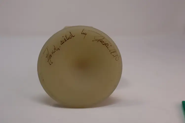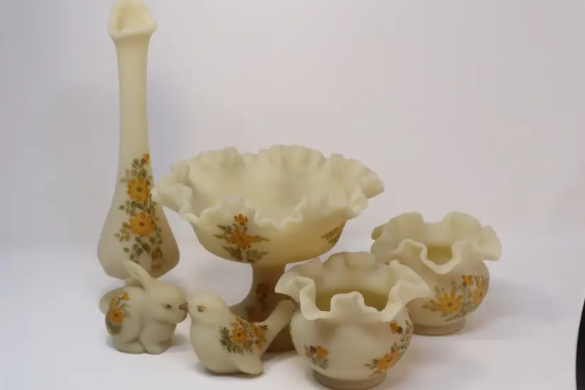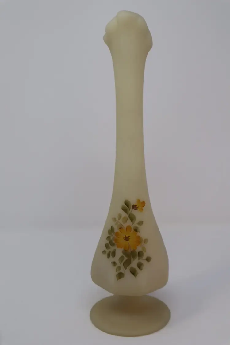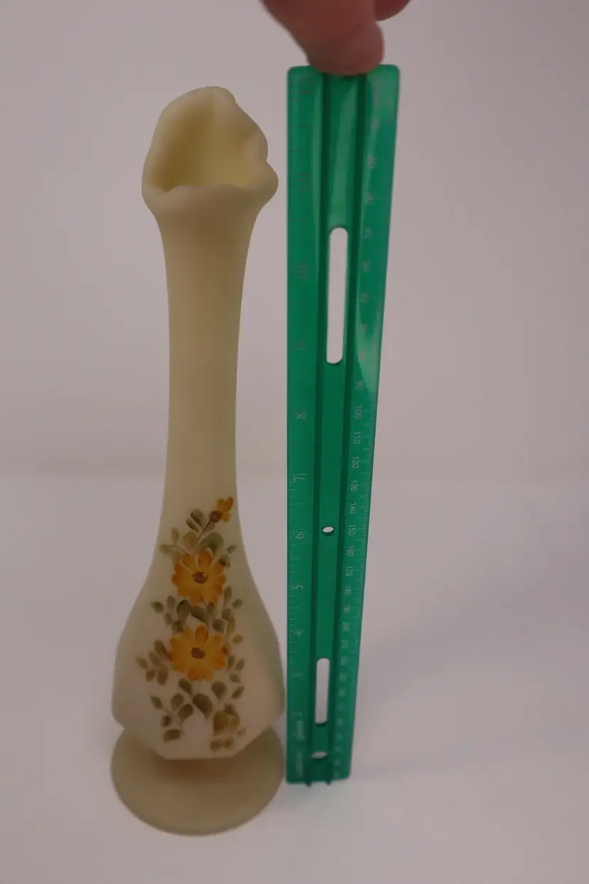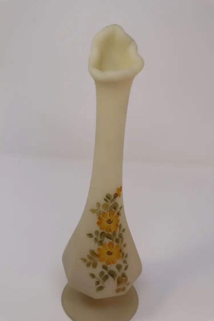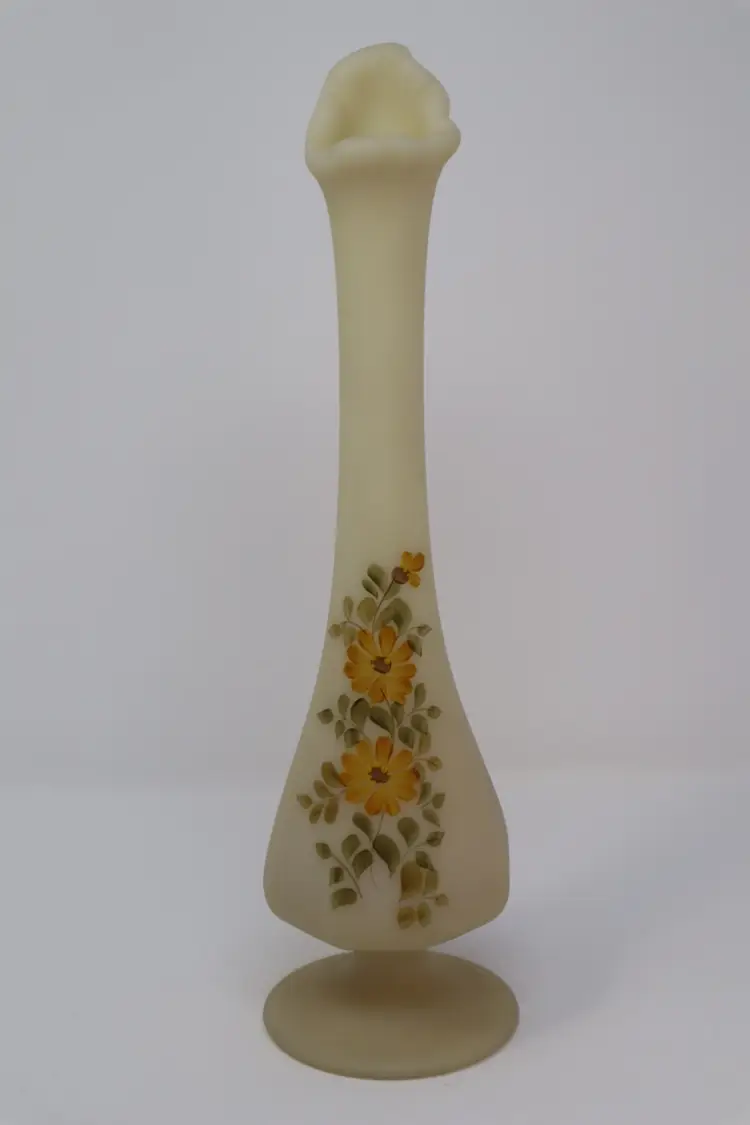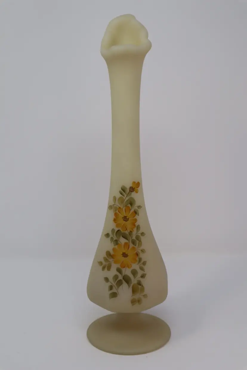 So special! Features hand painted yellow daisies on warm cameo custard. Signed by artist Jackie Delancy, this piece stands almost 12” inches tall and is in excellent condition, as shown in photos. Part of a beautiful collection of Fenton from a living estate. See my other listings for more.