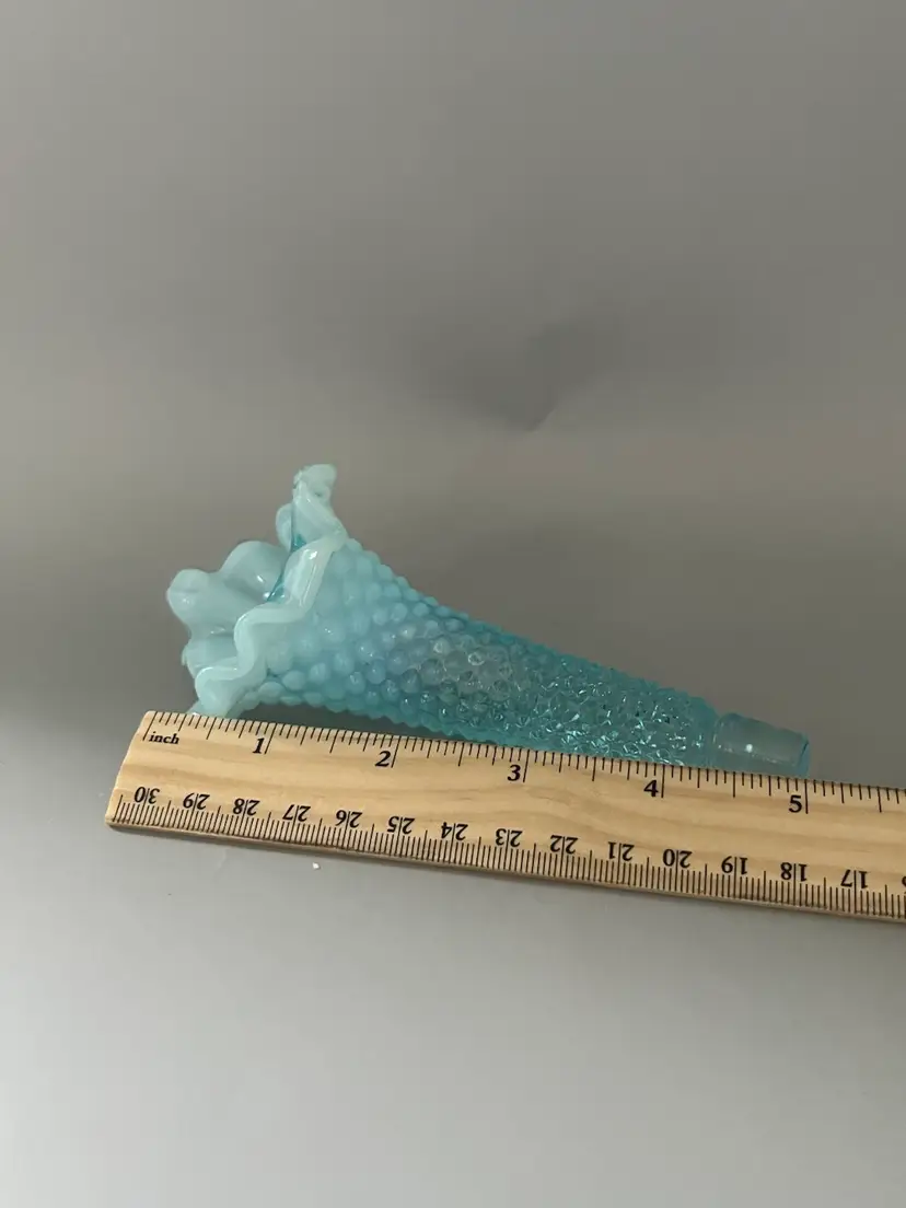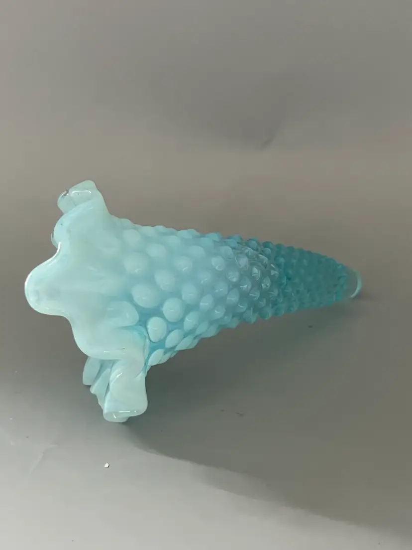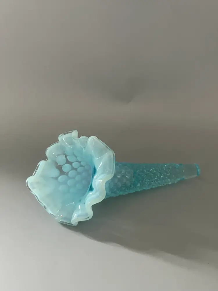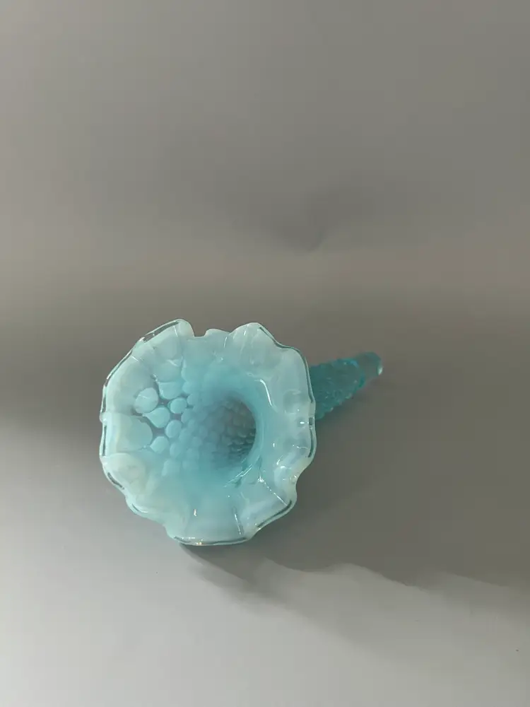 Fenton produced their Hobnail pattern in milk glass between 1952 and 1964. One of Fenton's popular pieces is an epergne set, a bowl which nests one or multiple horns rising from the center. This listing is for ONE SINGLE epergne horn. It is a perfect replacement piece if your epergne is missing the horns. The pattern features a raised diamond pattern with a single hobnail in the center of each diamond. The rim is ruffled, and a Jack in the Pulpit style in shape. The color is opalescent blue