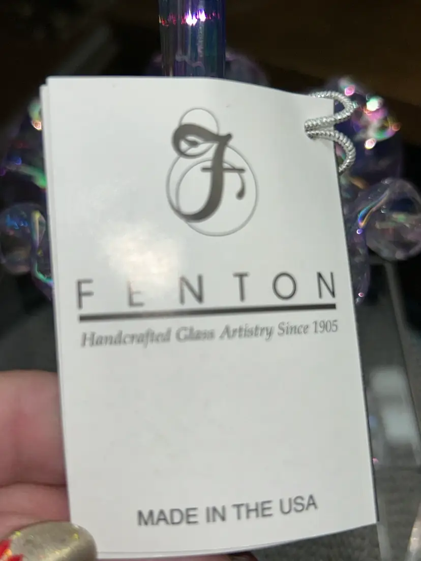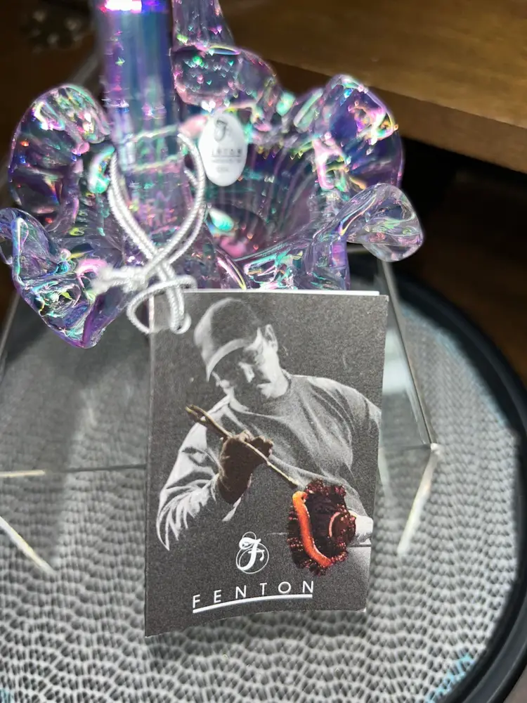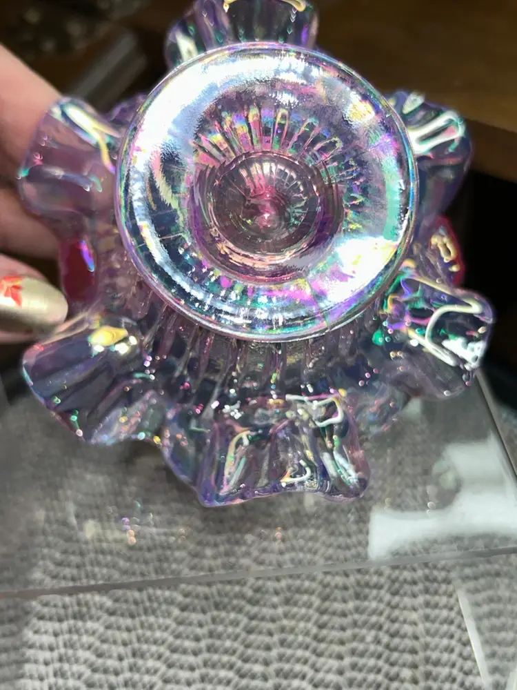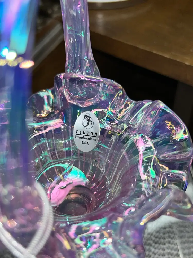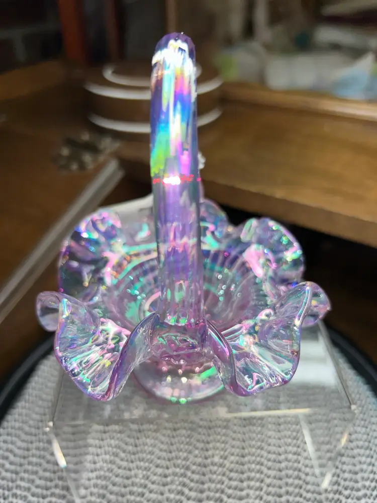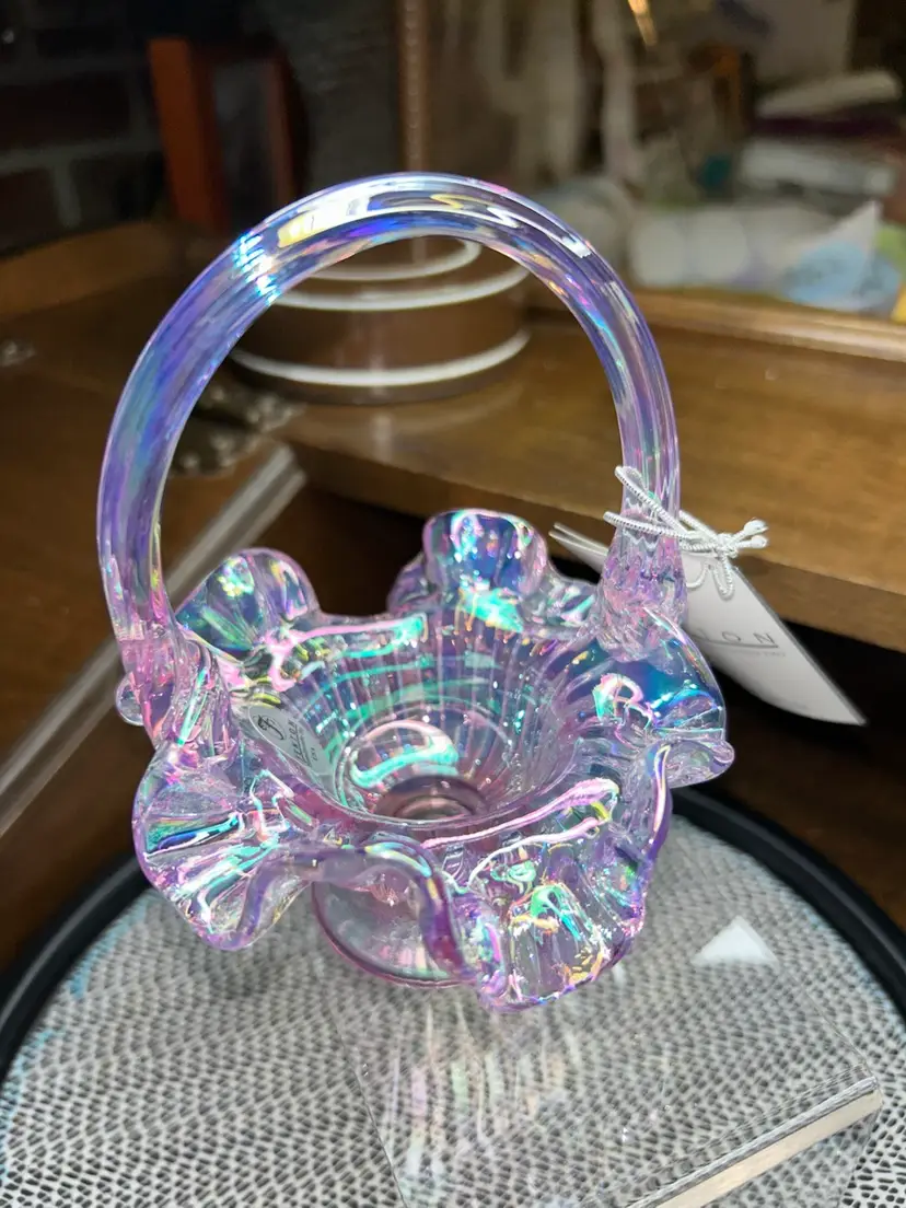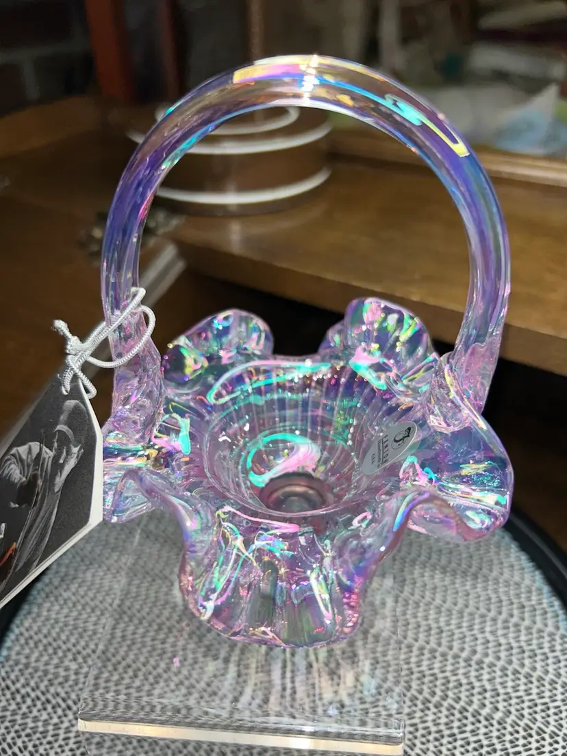 Fenton Iridized Empress Rose Faberge mini basket. Beautiful pink color with wonderful iridescence. Measures 5.25” tall. No chips or cracks. Original foil sticker, maker tag, and box. Pre-1972.