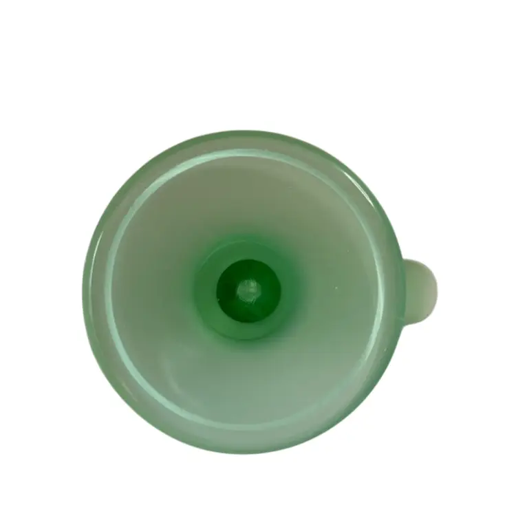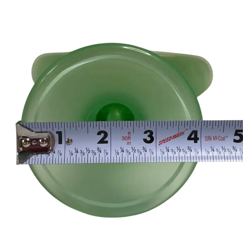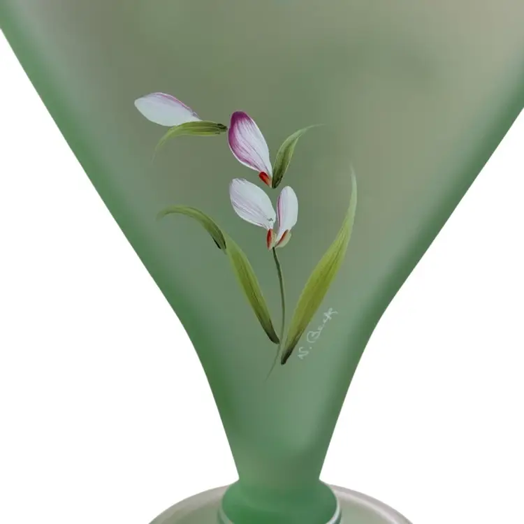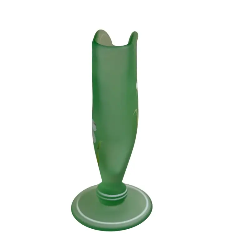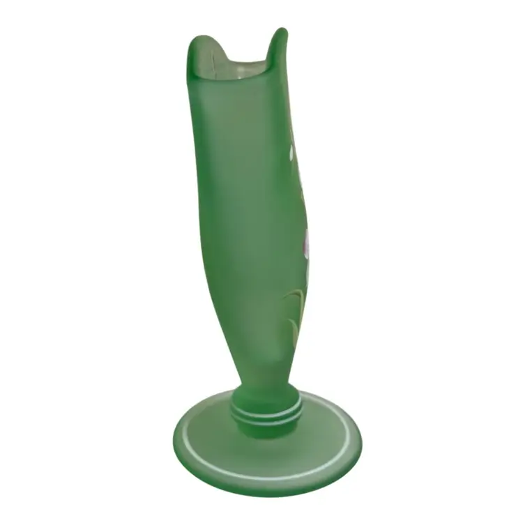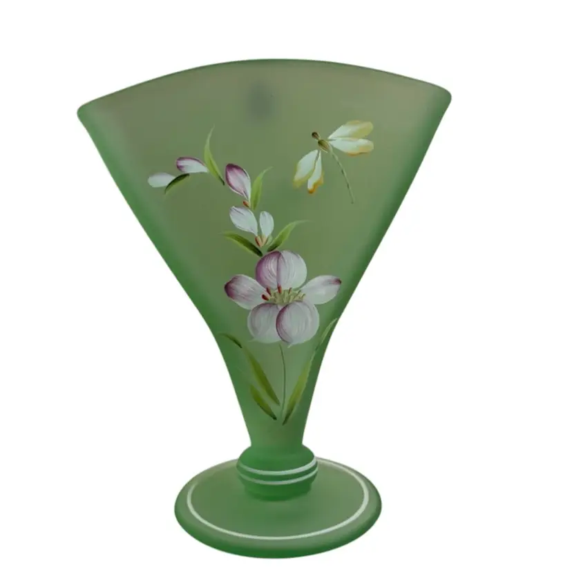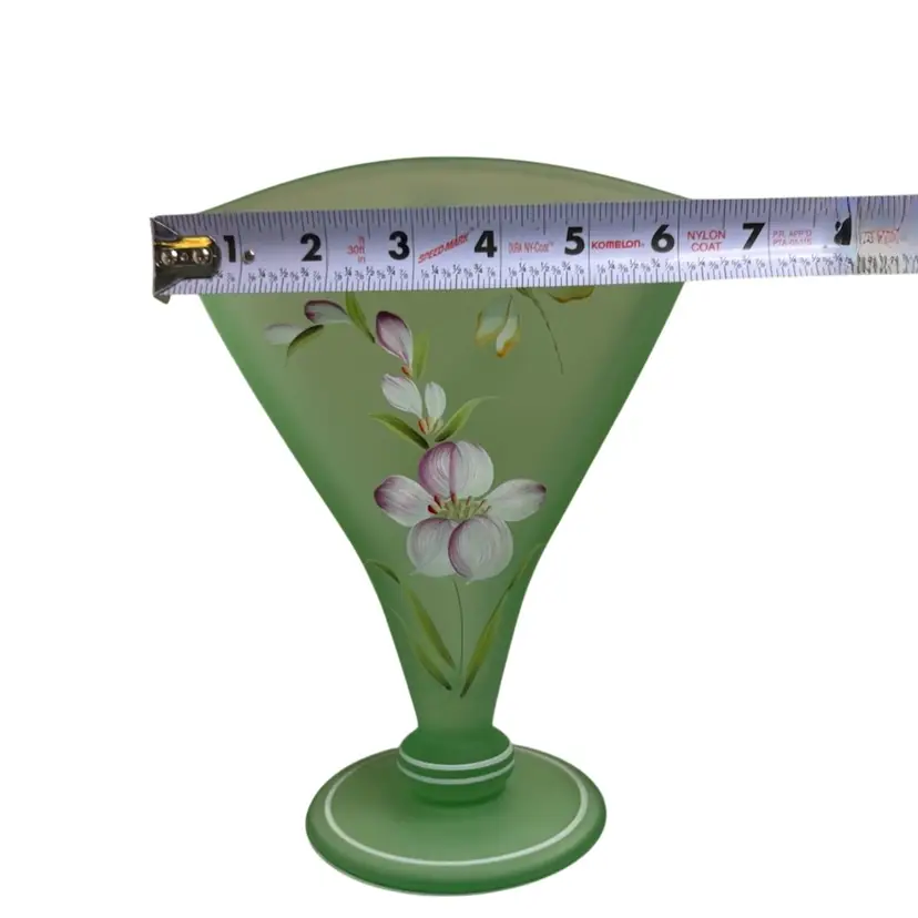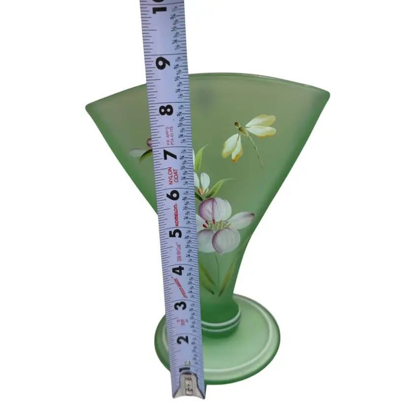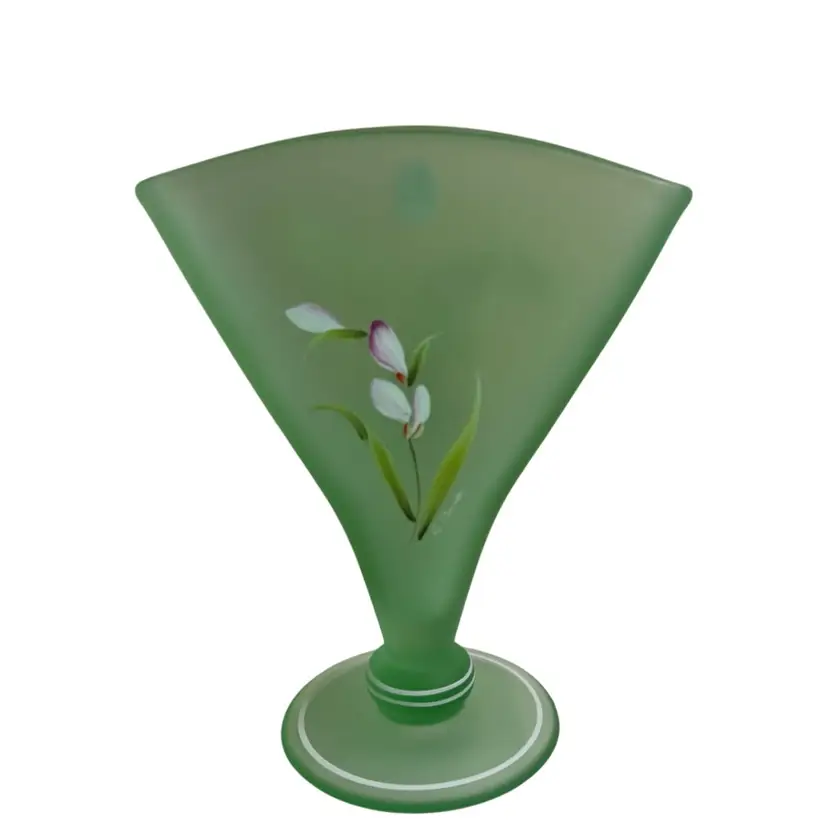 This stunning Fenton Glass vase is a must-have for any collector. It features a beautiful opaque satin green finish and is handcrafted with intricate details. The vase is signed by Artist. Glows with a 365 UV Light This fan vase is perfect for displaying flowers or as a standalone decorative piece. Condition: No condition issues noted. Measurements are approximate. Please see pictures for condition and measurements as they are a part of the description. S2-60 Thank you for looking!