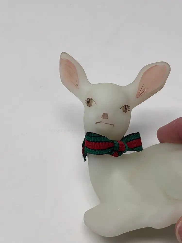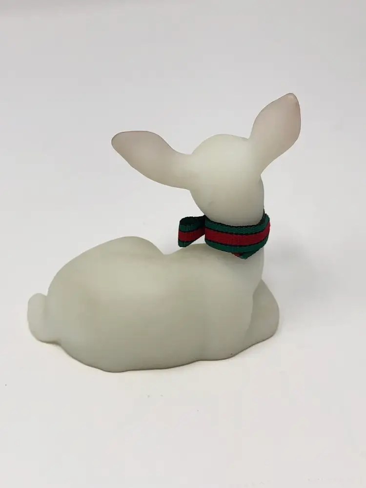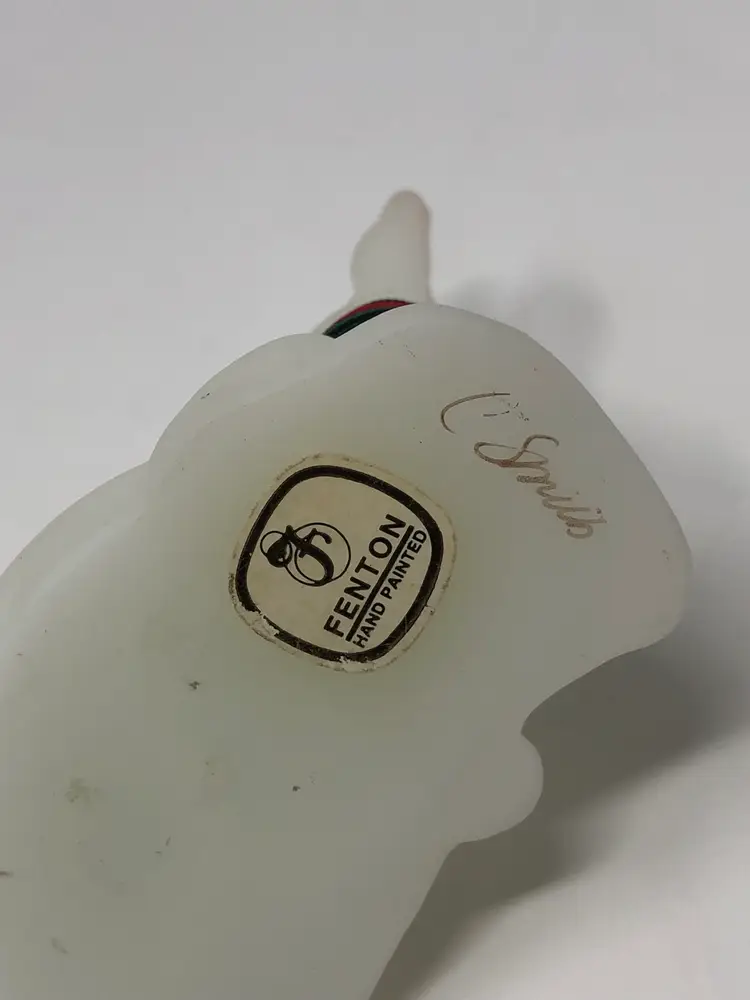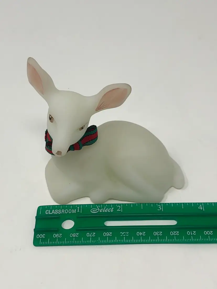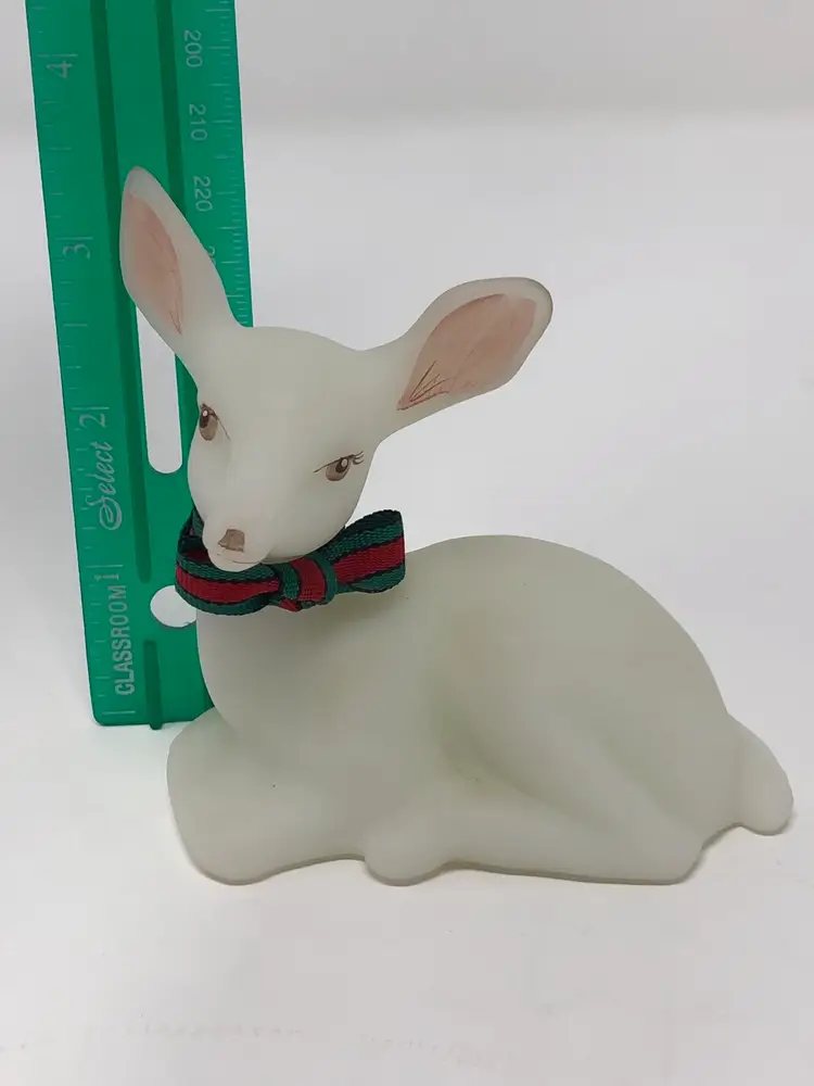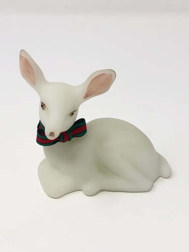 So peaceful! From the Fenton Glass Pets collection, this little fawn is about 3 1/2” high to the tip of her ear and about 3 1/2” long. Signed by artist C. Smith and sporting original Fenton paper sticker and a pretty ribbon collar. Excellent condition as shown in photos.