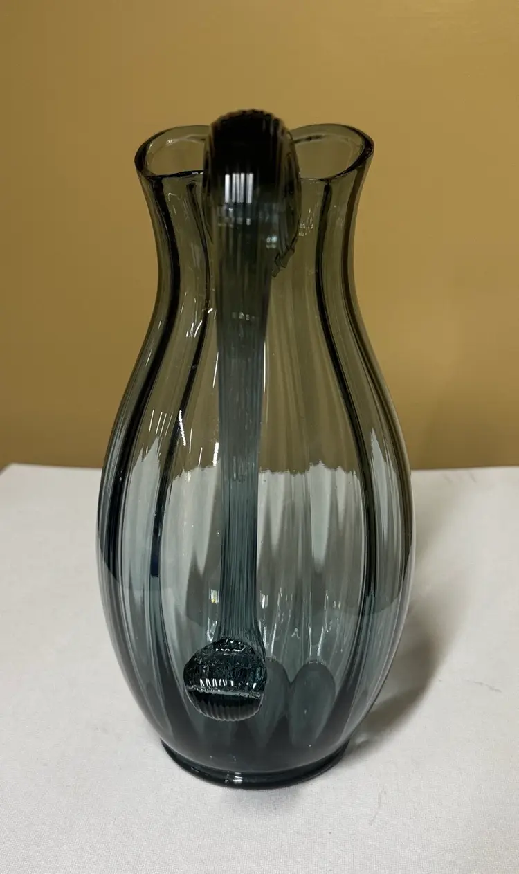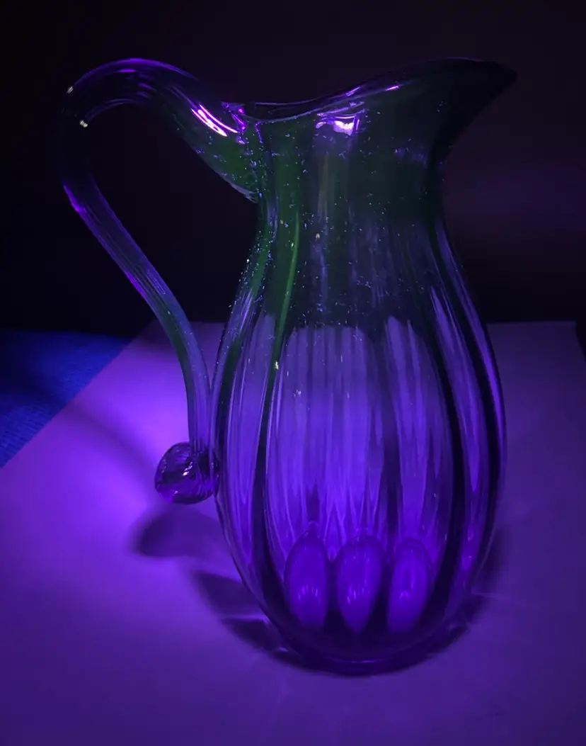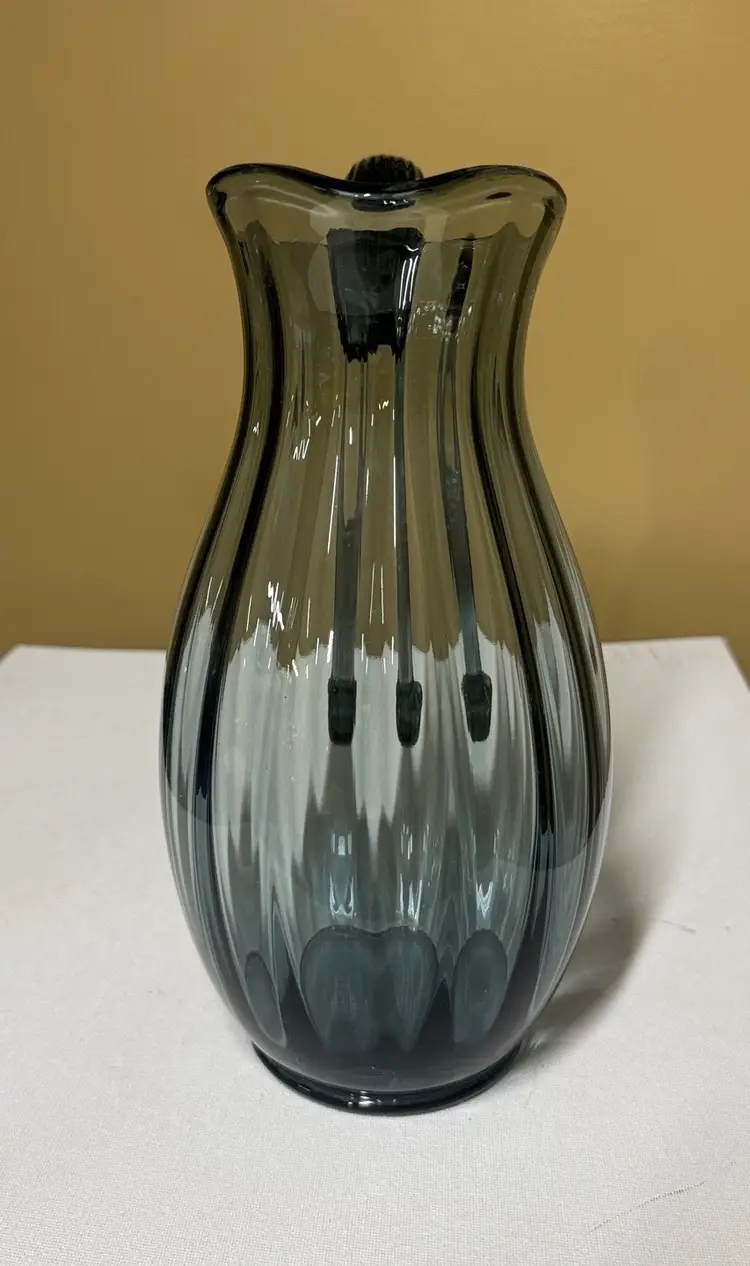 Fenton Federal Blue "American Legacy Collection" Ribbed Pitcher U.V. Reactive, glows green under black light, Unique Color Marked "Fenton" No chips, cracks Approx. 10.5” tall I also have a bowl from this same collection in the same color listed. Beautiful blue glass pitcher with a ribbed design. Perfect for serving or decoration. (12351182510)