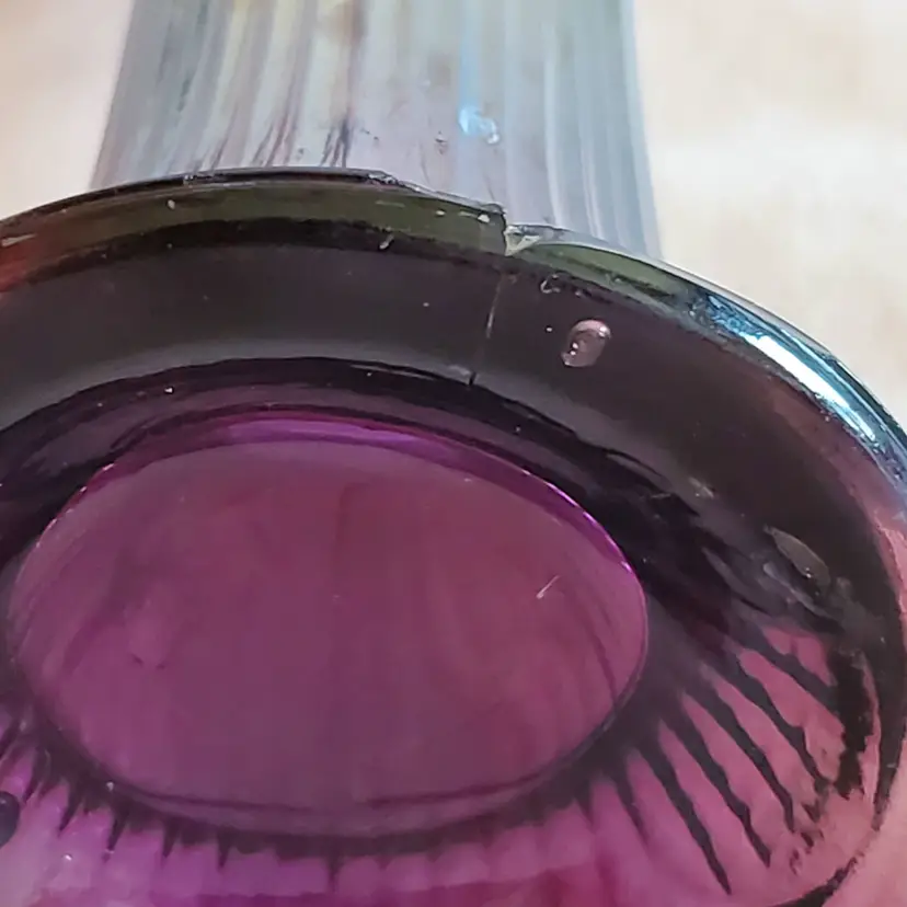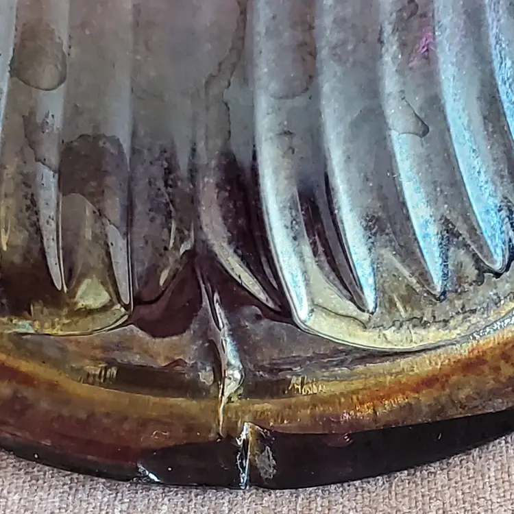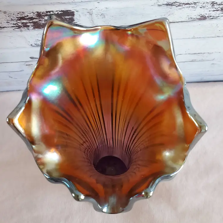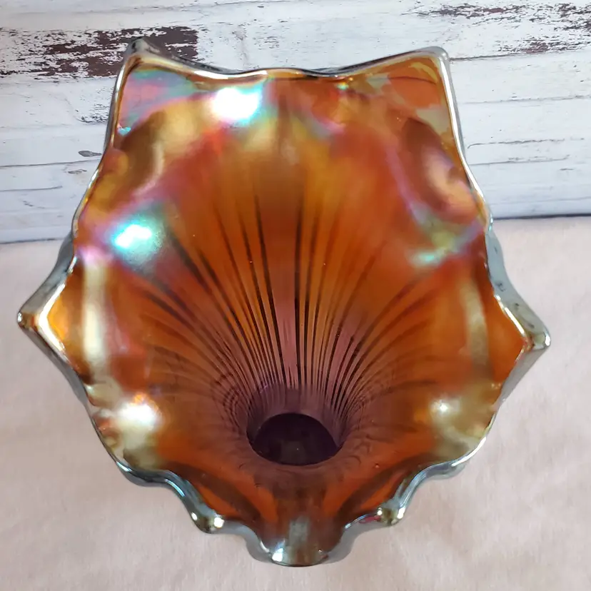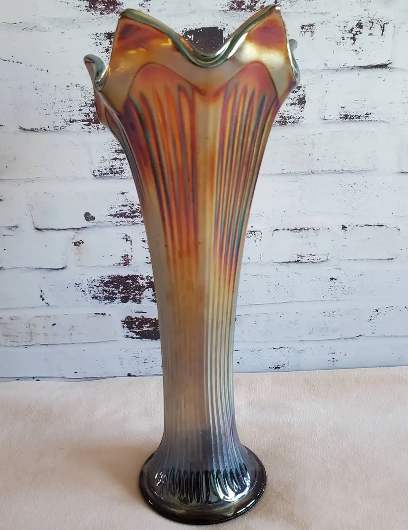 Fenton Fine Ribbed Carnival Glass Irridescent Swung Vase. It does have a chip in the base but it does not effect the functionality of the vase at all. It holds water and flowers beautifully!