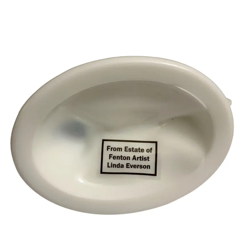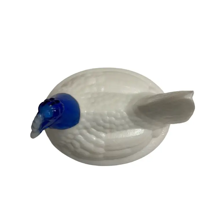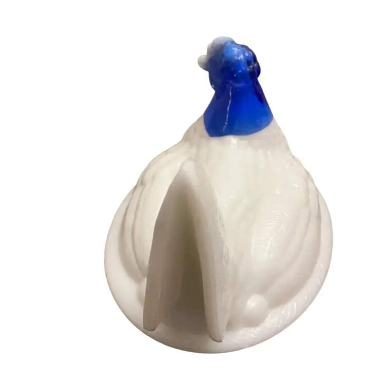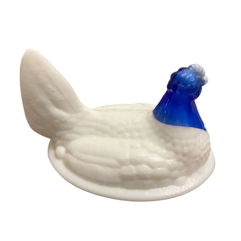 Stunning white milk glass pressed glass hen on nest top. The hen’s head is a deep cobalt blue with milk glass crown and beak. It also sports the split tail design that is highly collectible. This piece is marked with a sticker stating that it came from the Estate of Fenton artist Linda Everson. Unfortunately I do not have the nest base but this still looks lovely displayed by itself.