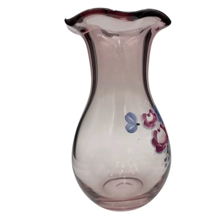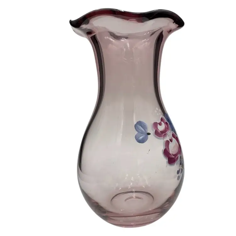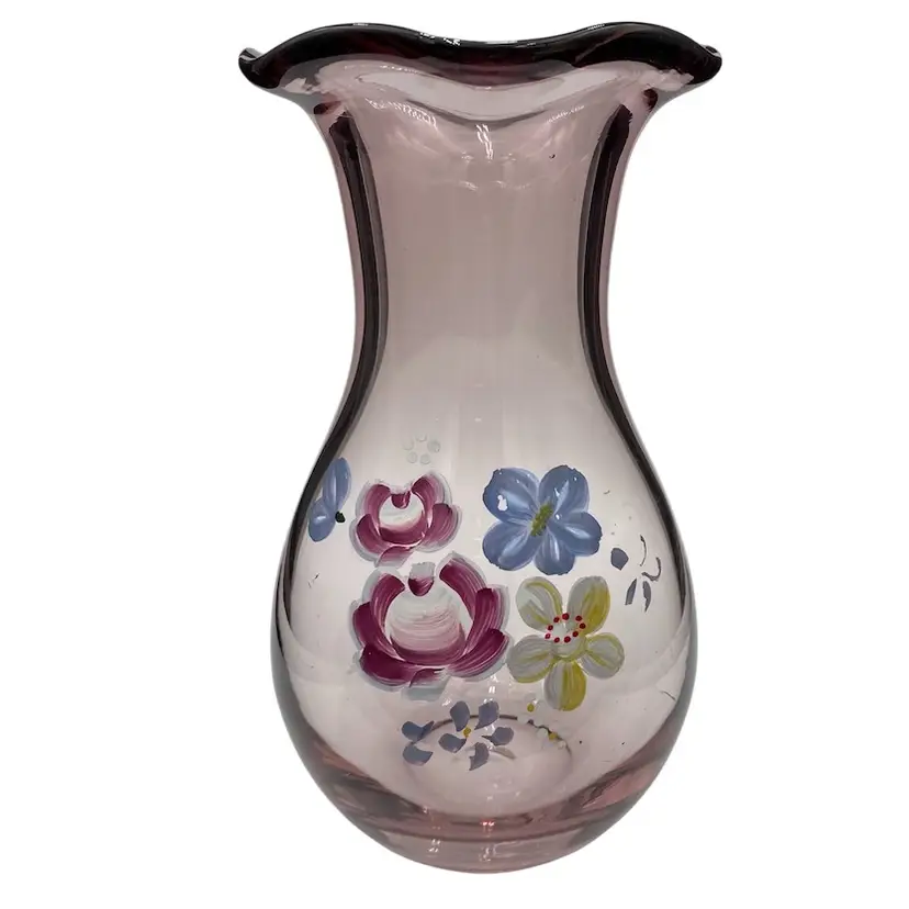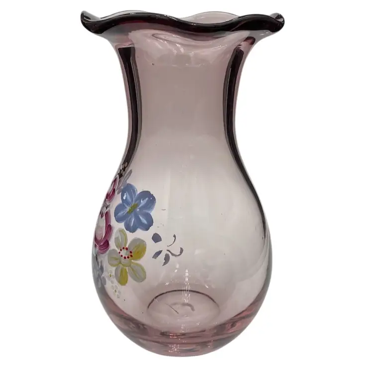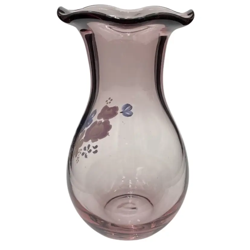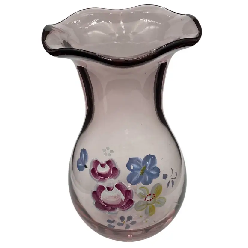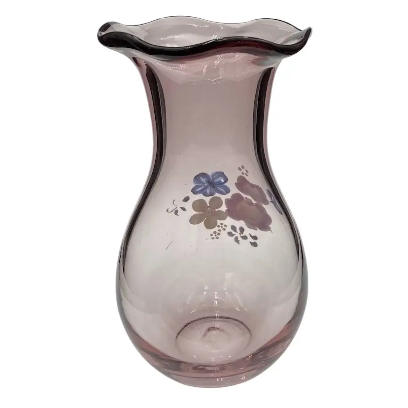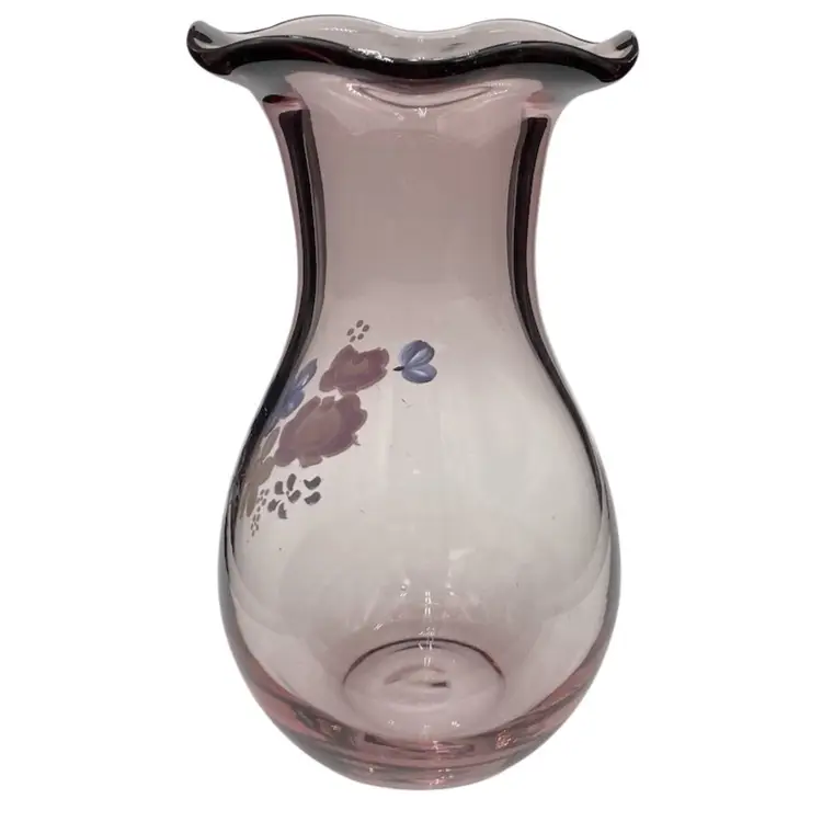 This Fenton for Teleflora ruffled-rim Vase is a vintage, hand-painted piece featuring a beautiful light purple color. This 8-inch vase is a lovely display for flowers, featuring a floral bouquet pattern and a glossy finish. Made in West Virginia by Fenton during the late 20th century, this original piece of art glass showcases intricate craftsmanship.