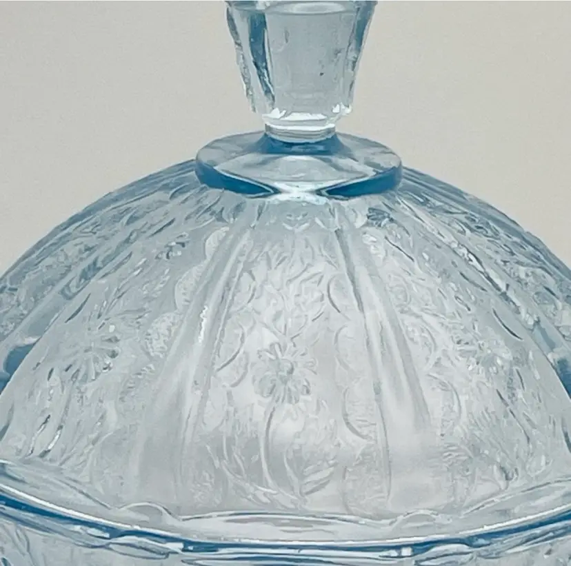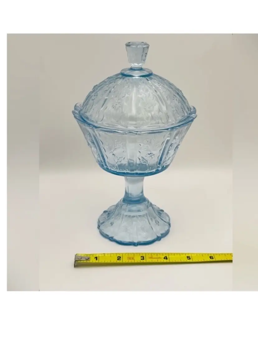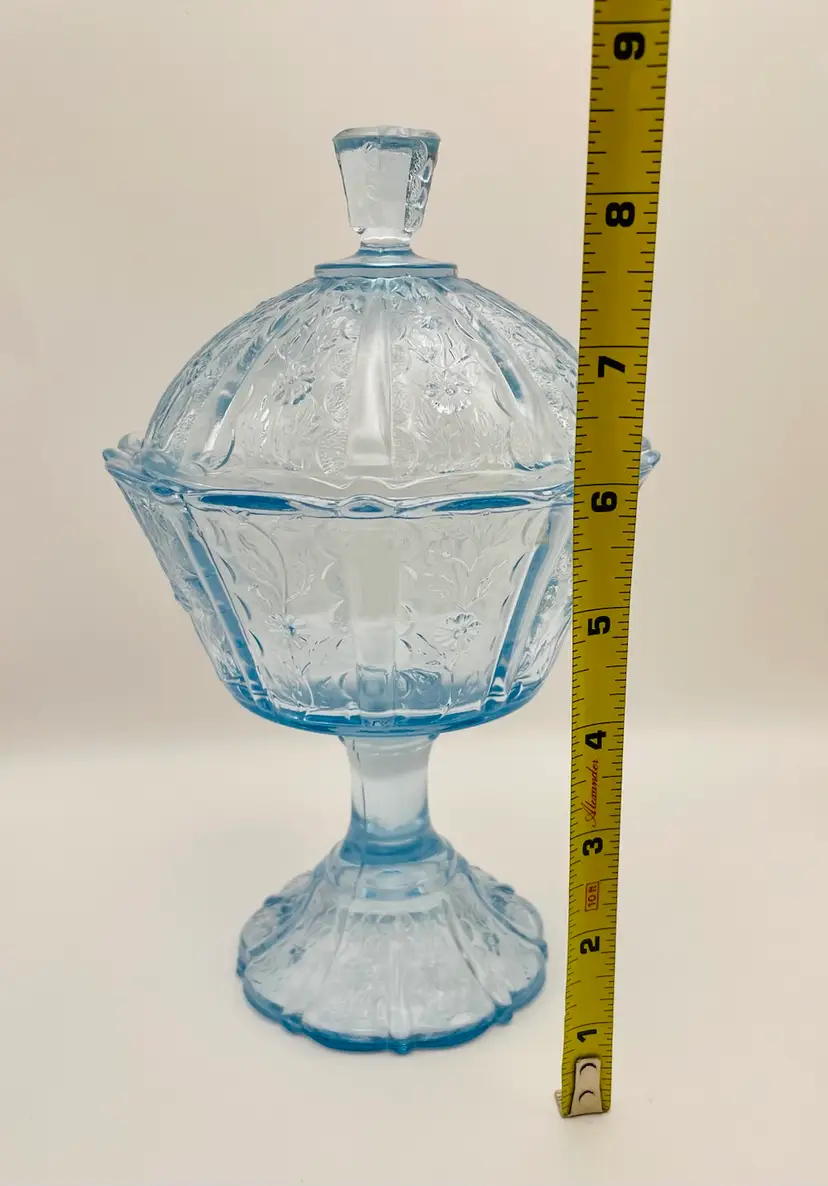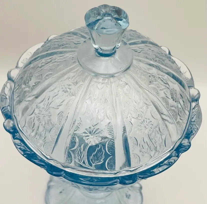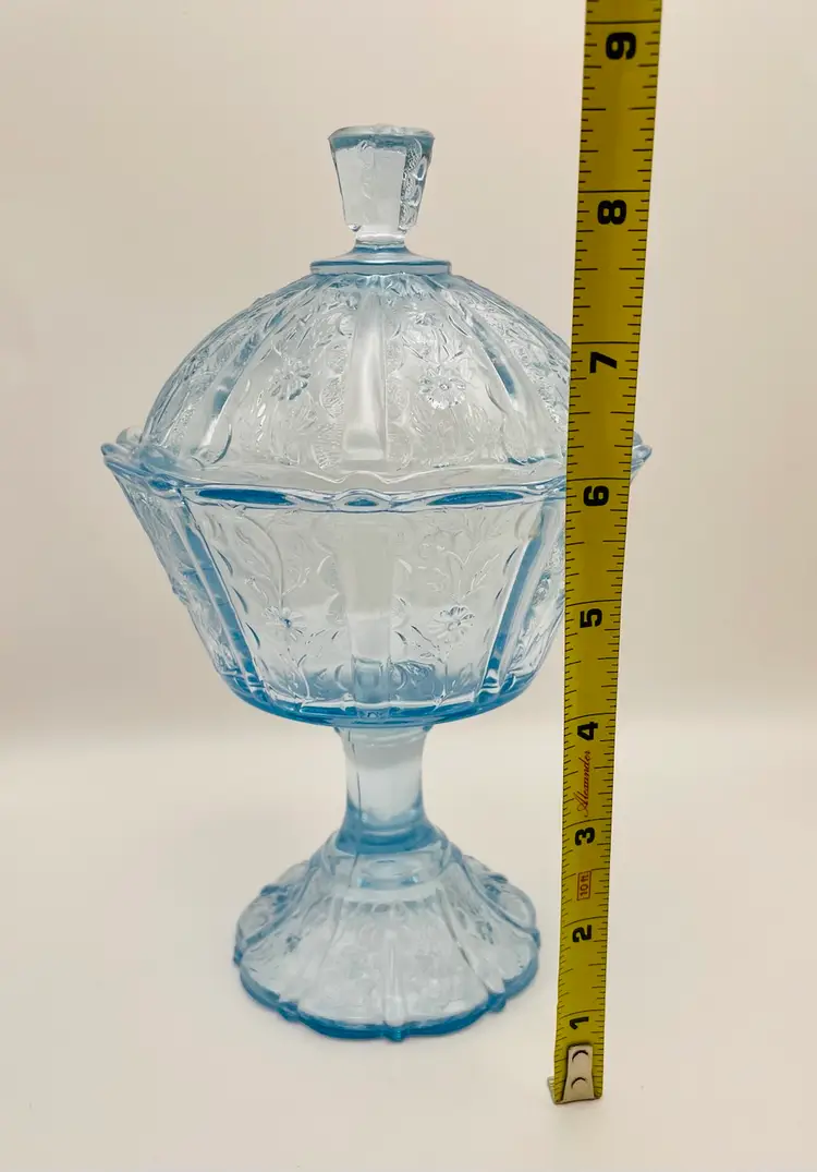 Fenton, Discontinued, Daisy, “Forget Me Not” Lt. Blue Glass, Pedestal, Paneled, Covered Candy Dish, Marked on bottom (TINY chip on top handle, as shown in last picture)