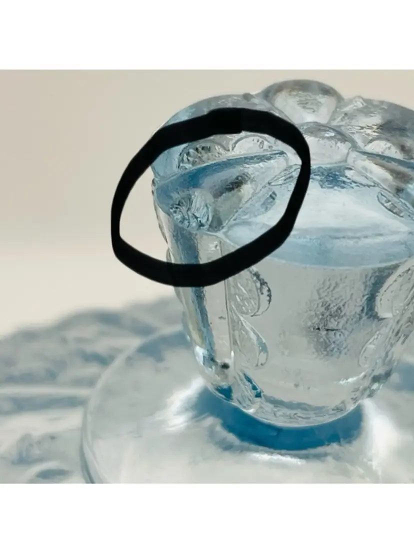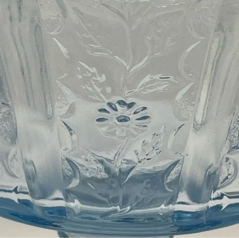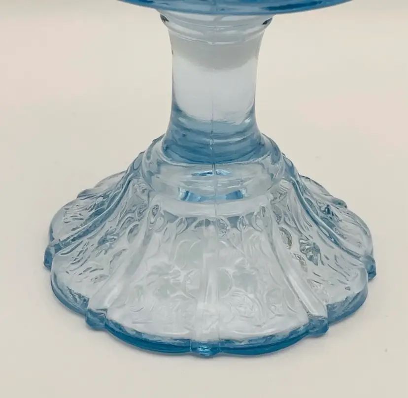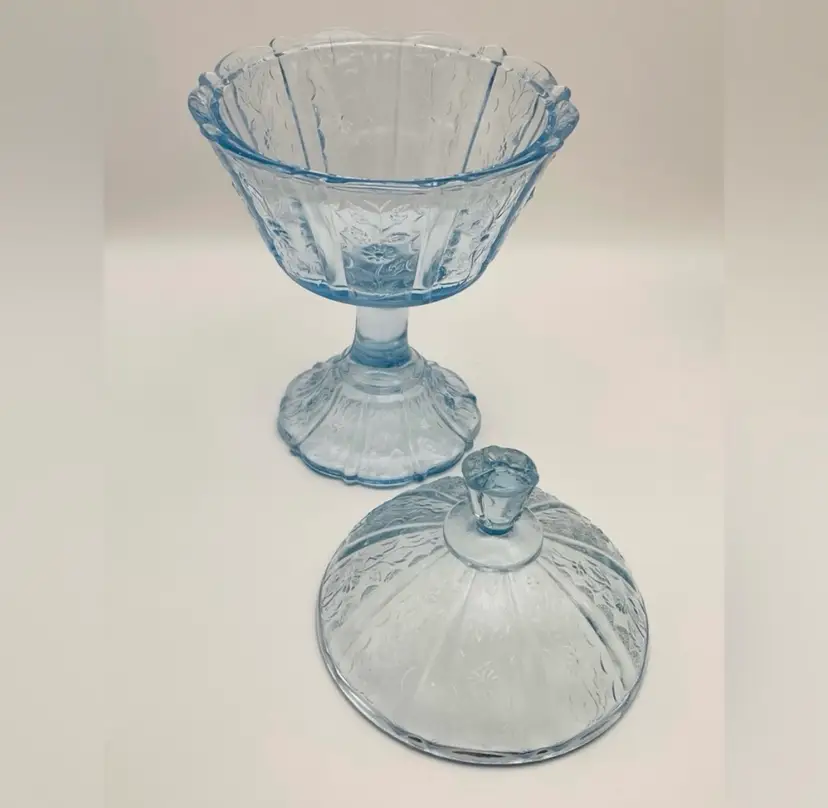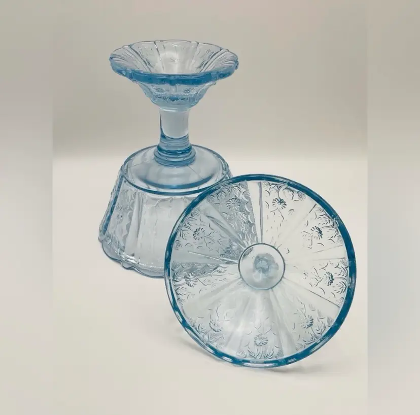 Fenton, Discontinued, Daisy, “Forget Me Not” Lt. Blue Glass, Pedestal, Paneled, Covered Candy Dish, Marked on bottom (TINY chip on top handle, as shown in last picture)