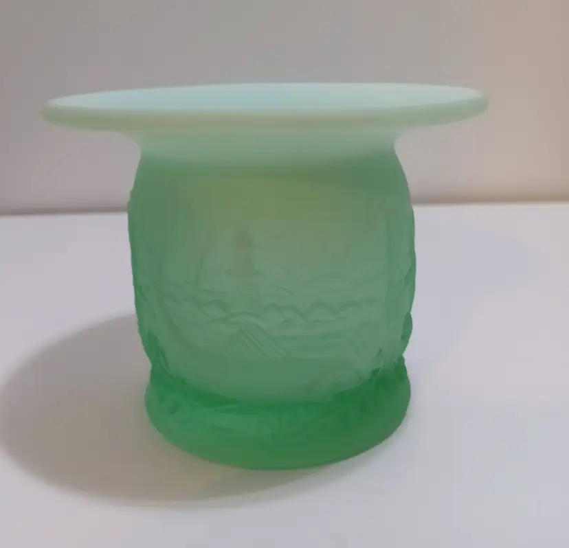 Fenton Limited Edition Piece Created for the American Carnival Glass Assoc.1996; A Very Unique Bi-Colored Sea Mist Green Frosted Glass; Spittoon Shape Embossed with Lighthouse Sea Coast Beach Scene Decor! Marked on Base ACGA; Columbus OH; A Splendid Creation! 4" T x 3" W x 5" Across Top; Excellent Condition; No chips or cracks or bruises!