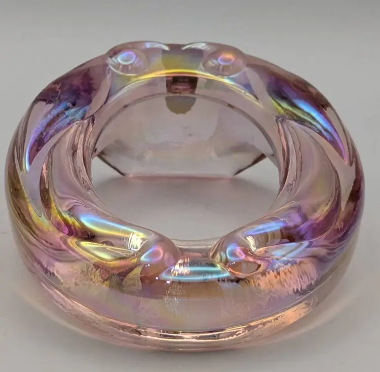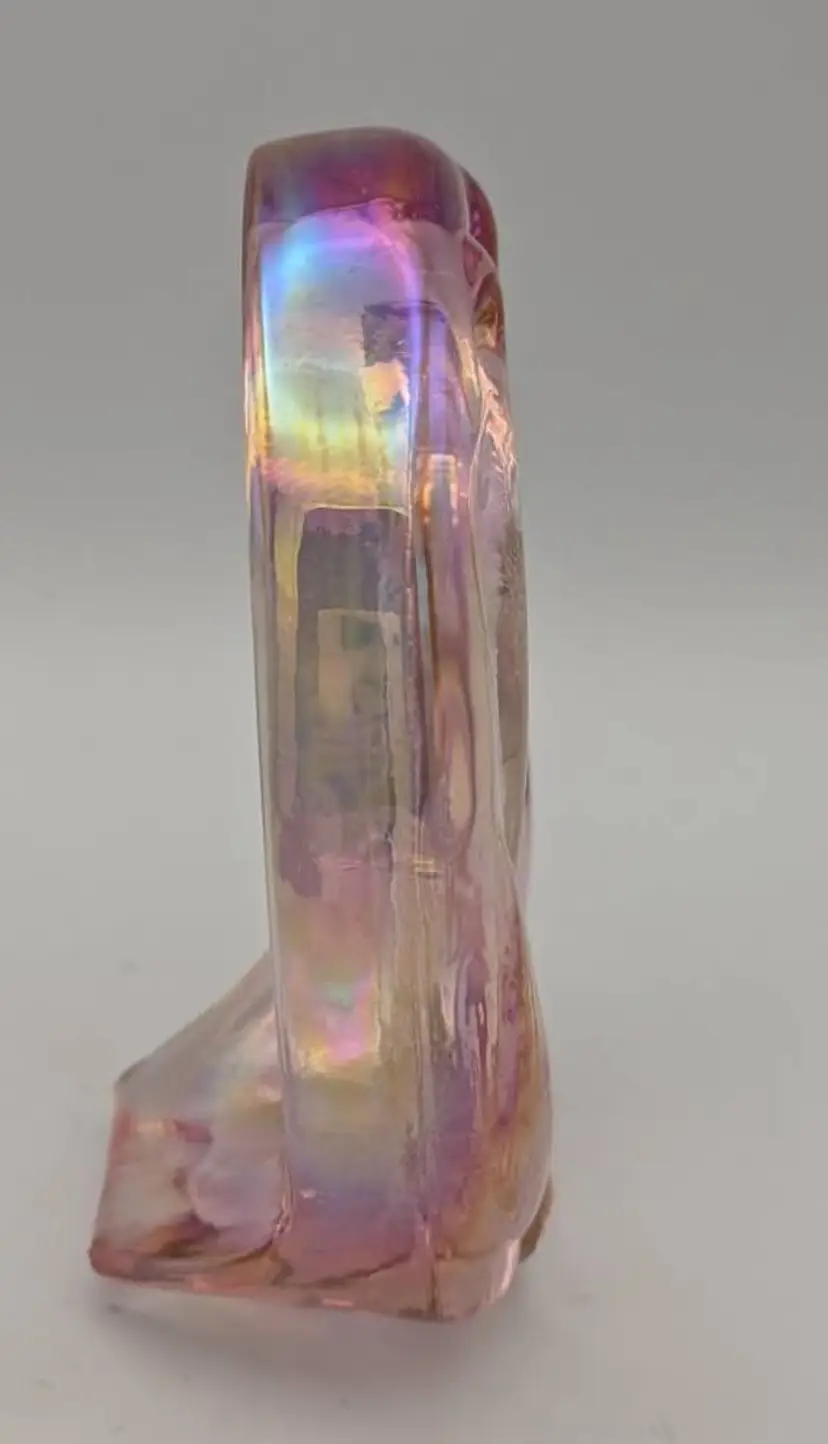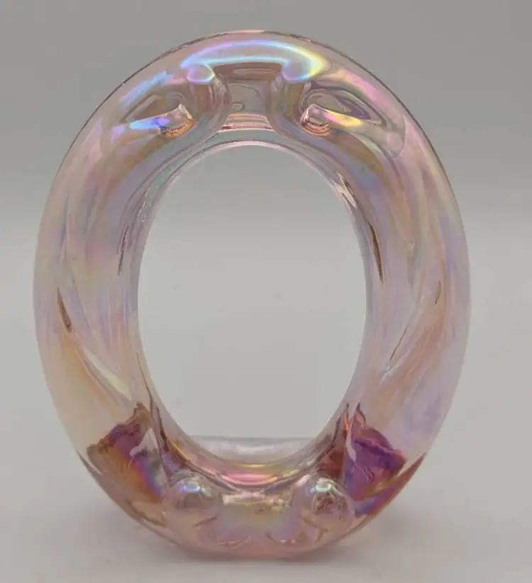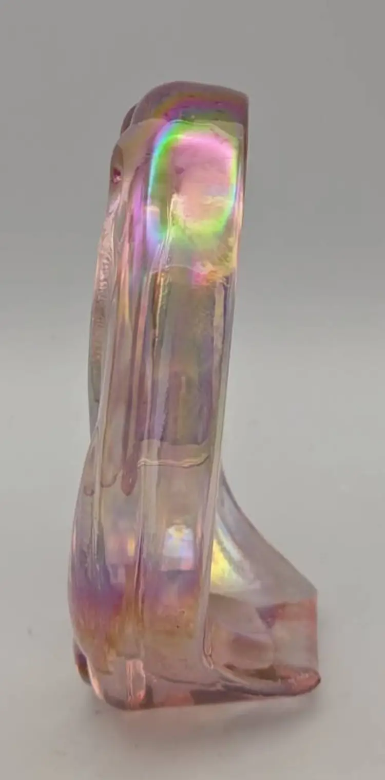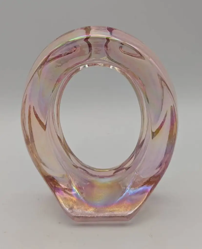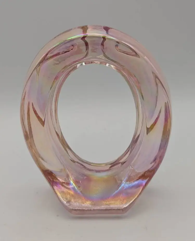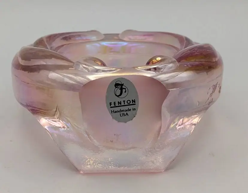 This is a seemingly rare Fenton Iridescent pink photo frame. The label is still attached. Its just beautiful! Stunning! It measures approx.: 4.5 inches tall,4 inches across, 1 inch in width. The opening will hold a 3 x 2.5 inch photo.