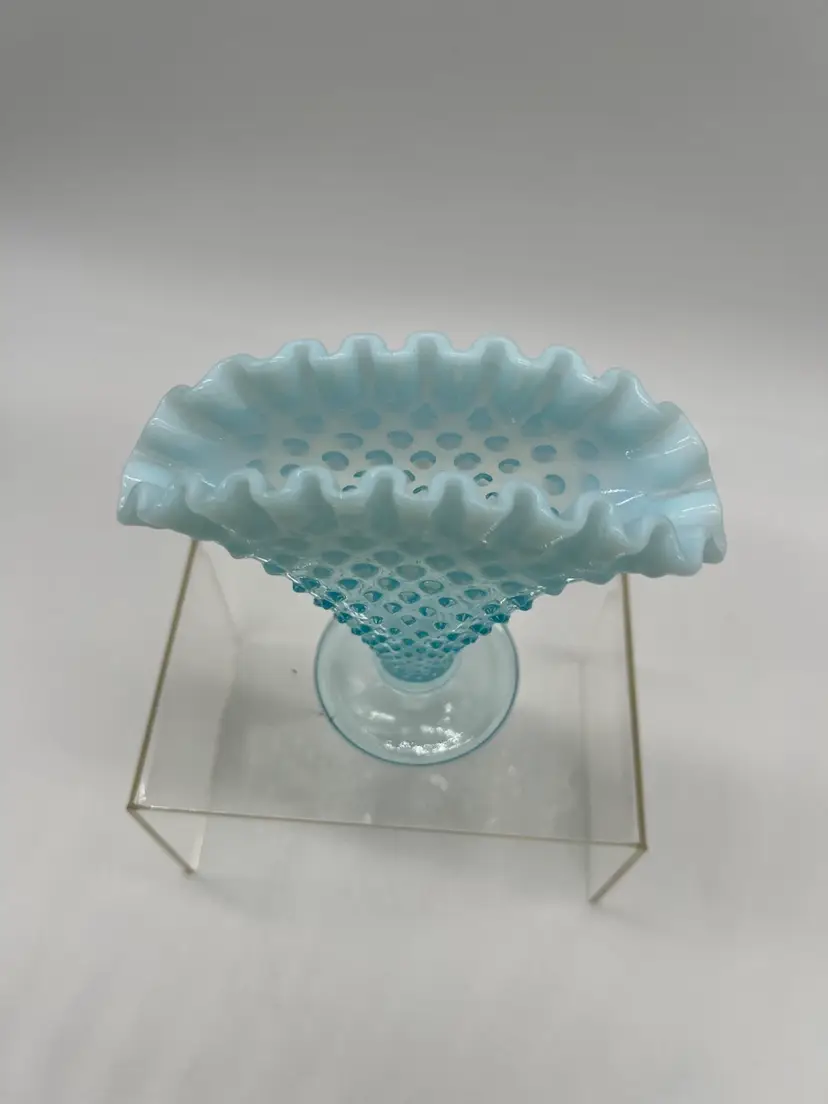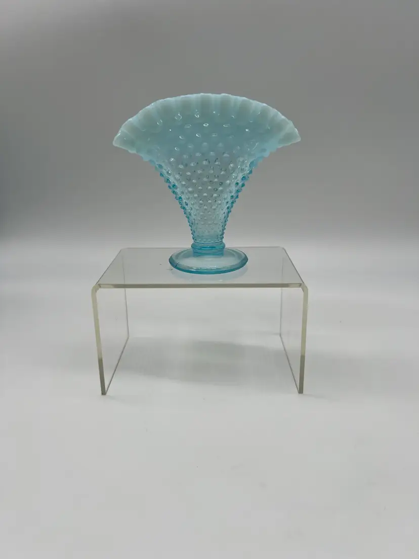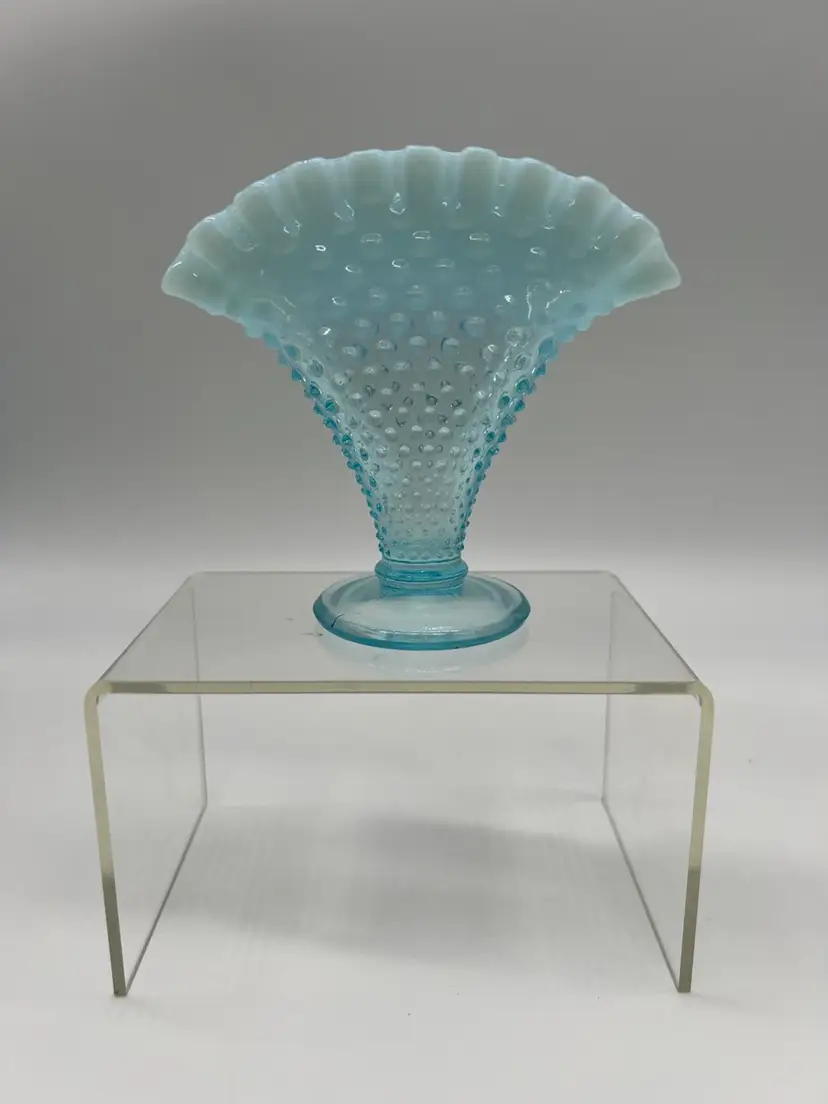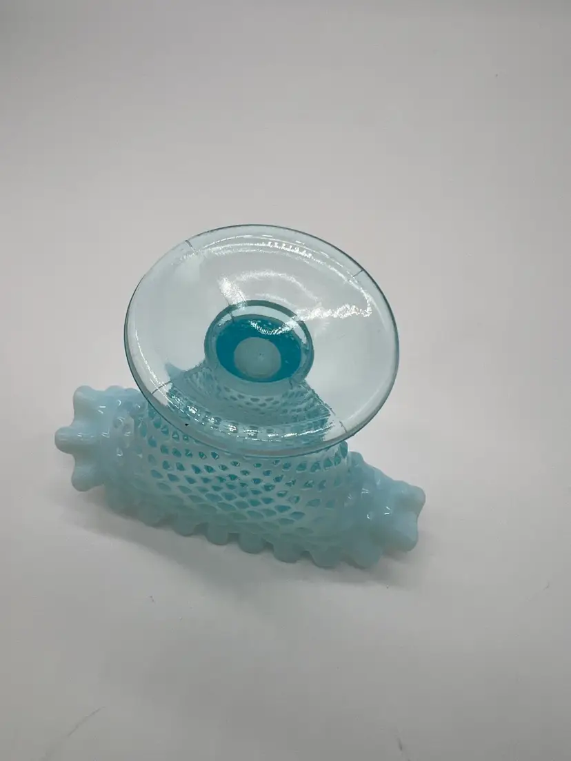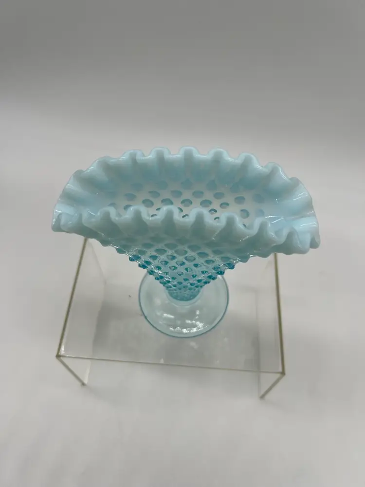 This Vintage Fenton Blue Opalescent Ruffled Hobnail Small Glass Bud Vase is a stunning example of Fenton's craftsmanship, featuring the iconic hobnail pattern that adds texture and charm. The beautiful blue opalescent finish transitions gracefully, capturing light and creating a soft, shimmering effect that enhances any floral arrangement.