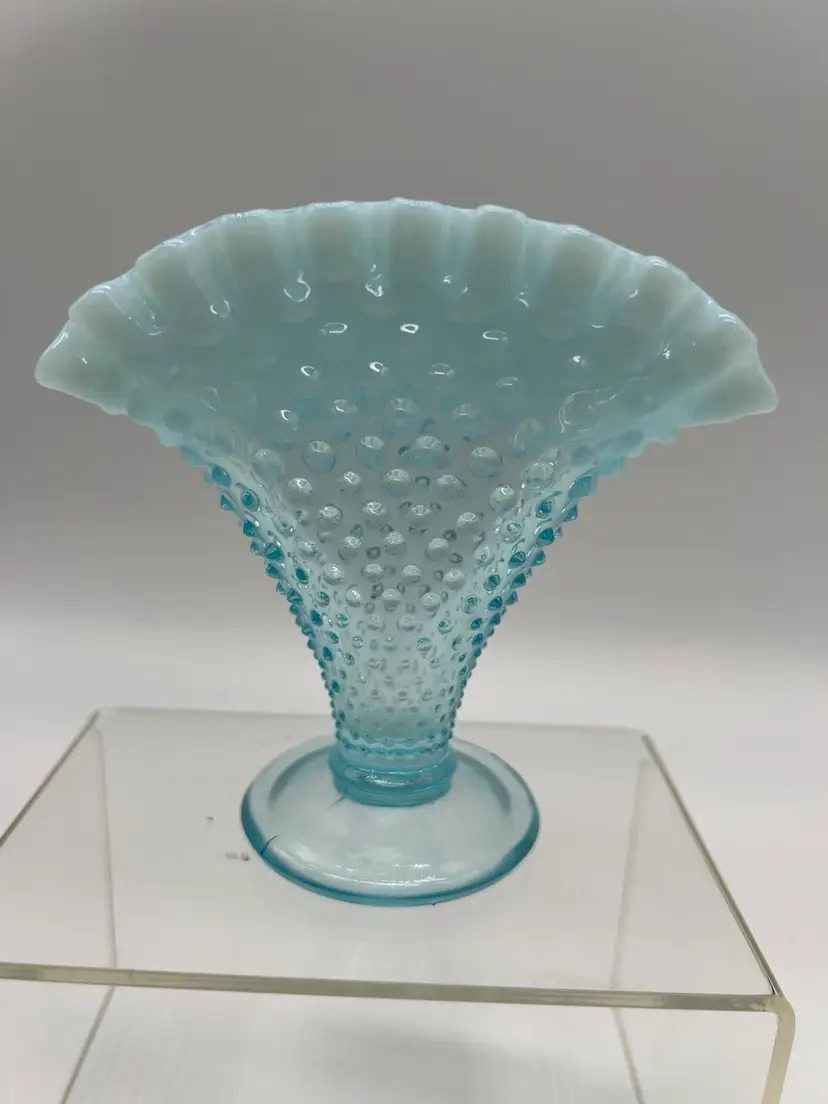 Standing at approximately 4 inches tall, this small vase is perfect for displaying single blooms or small bouquets, making it a versatile addition to your home decor. The ruffled top edge lends an elegant flair, while the hobnail design adds a distinctive vintage touch.