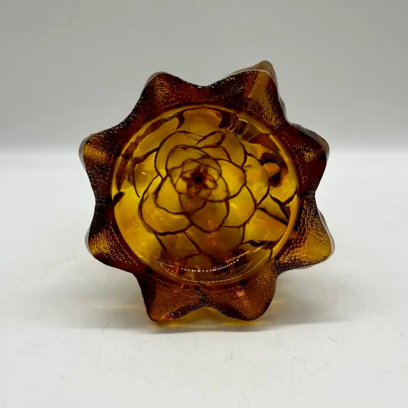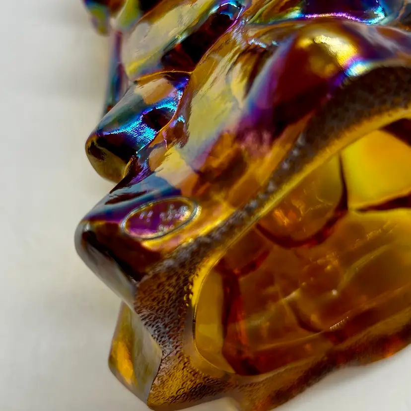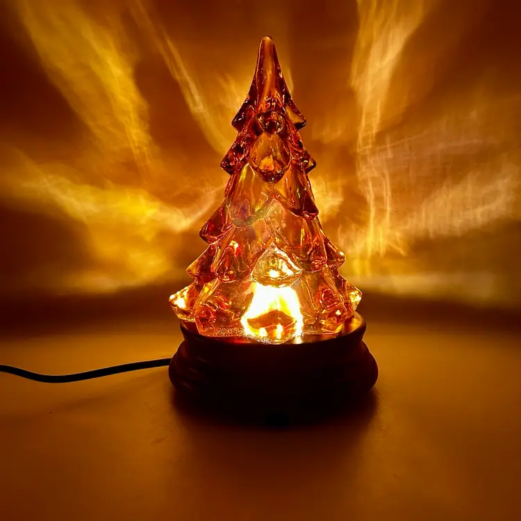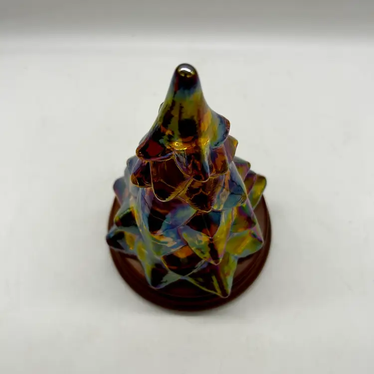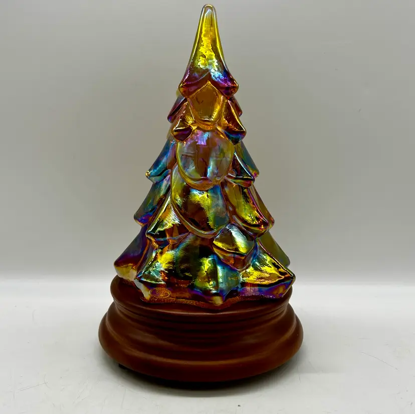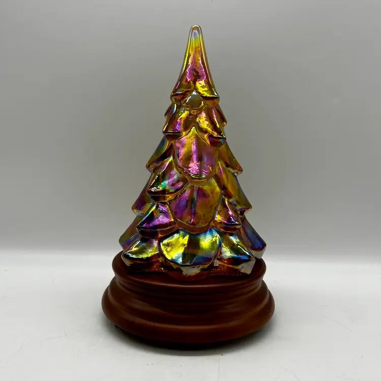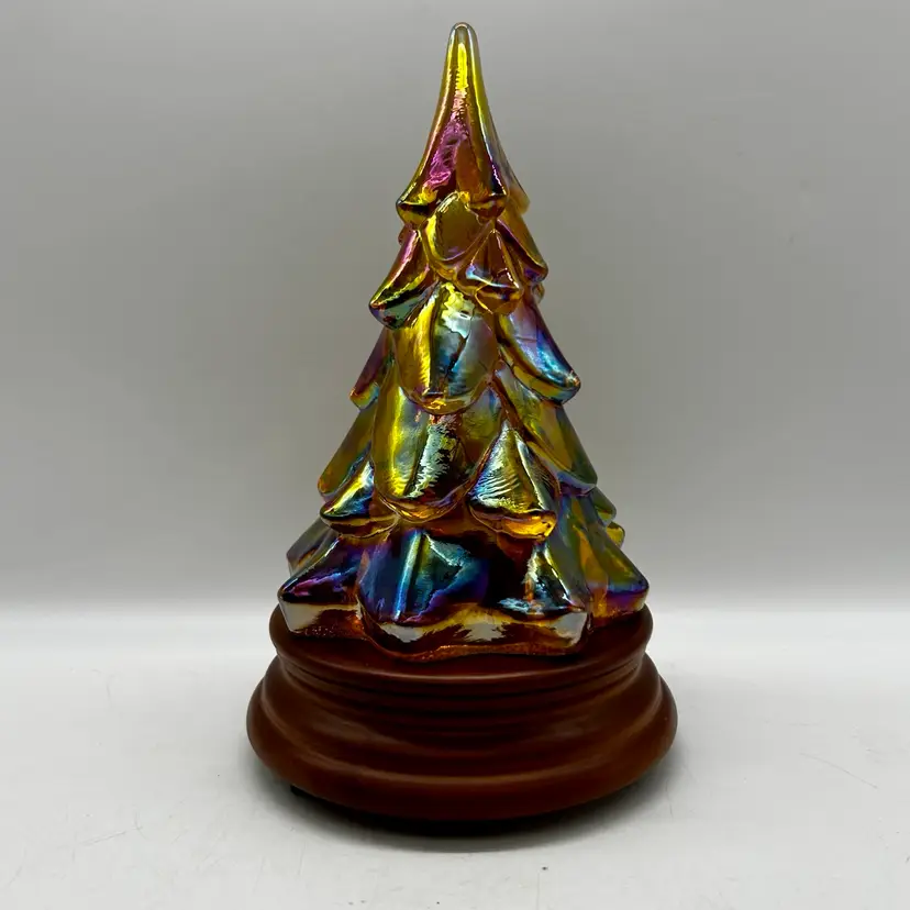 This beautiful Fenton Glass stylized Christmas tree stands at 7 inches tall. The lighted wooden stand illuminates the glass , making it perfect for a festive display.