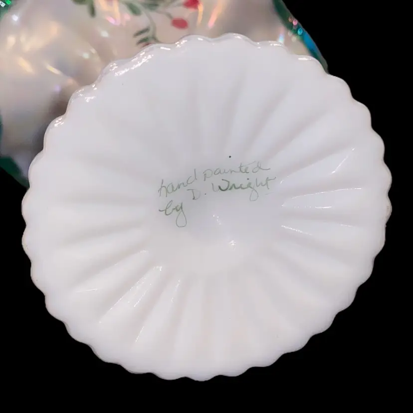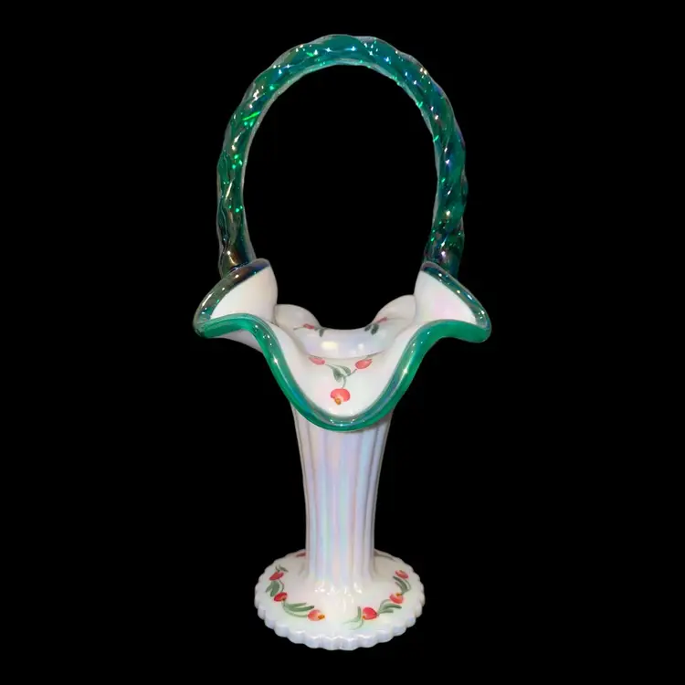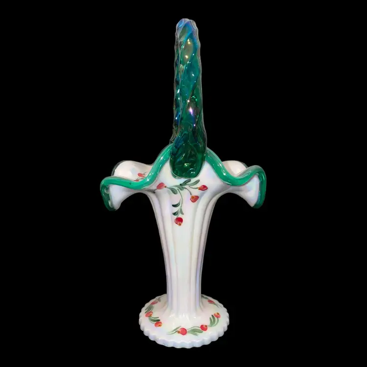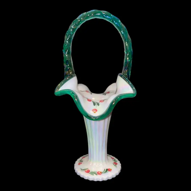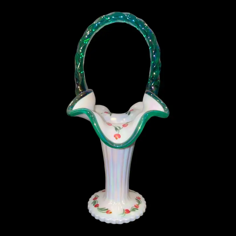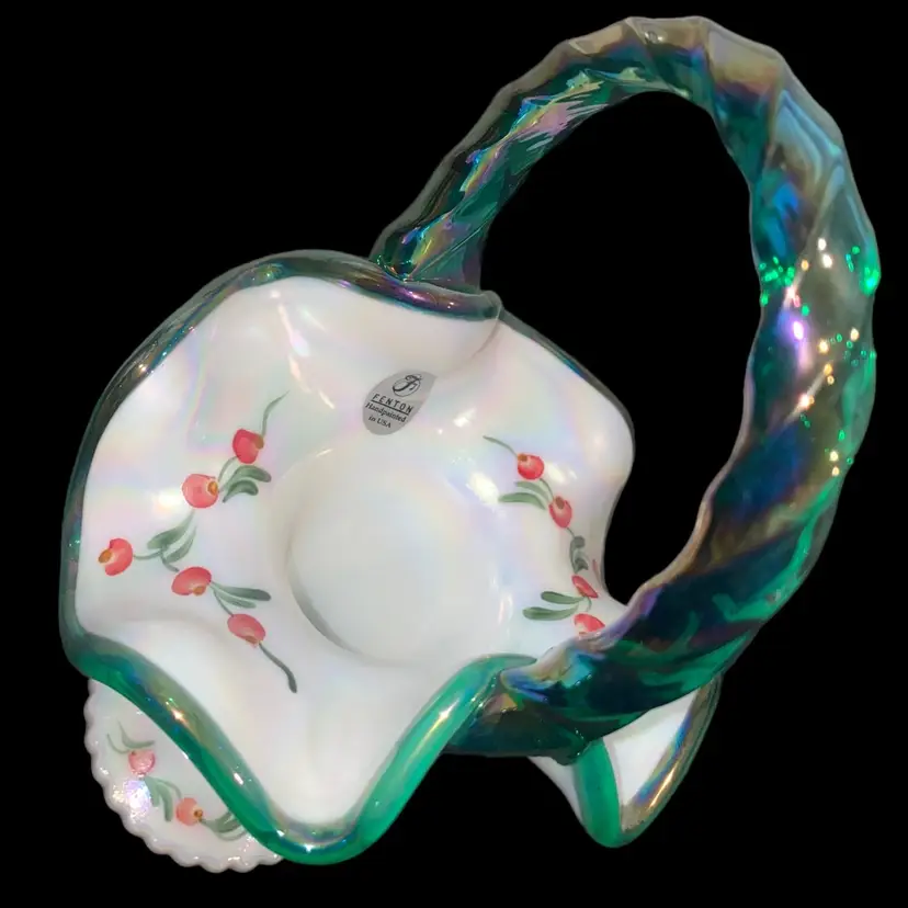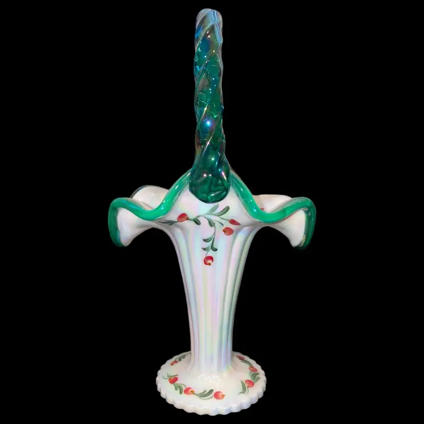 trumpet basket made exclusively for QVC in 2001; iridescent milk glass basket vase w/ iridescent emerald handle & crest, hand painted berry & greenery design by Diana Wright; excellent condition from collector’s (aka my mom) home