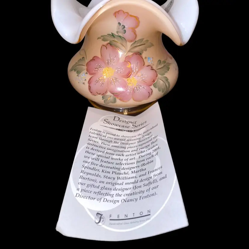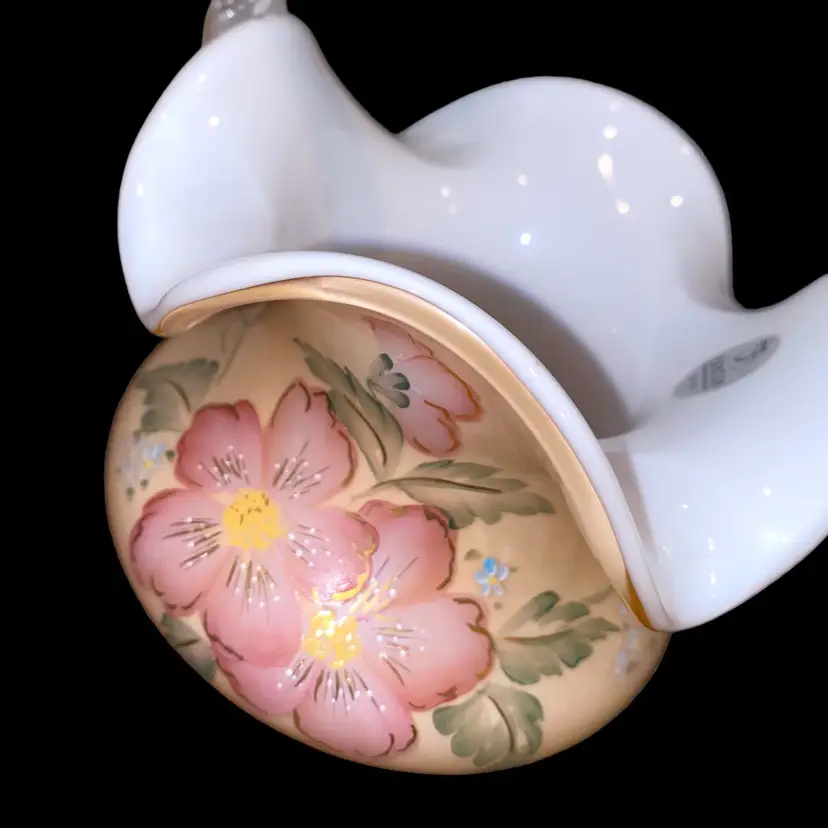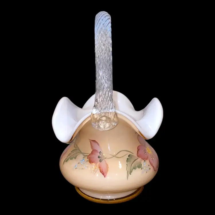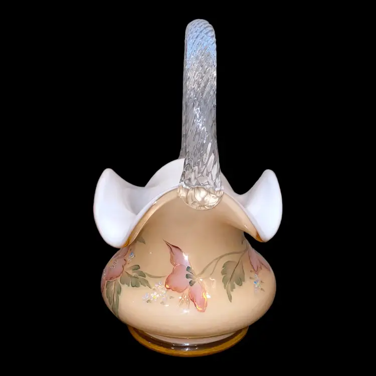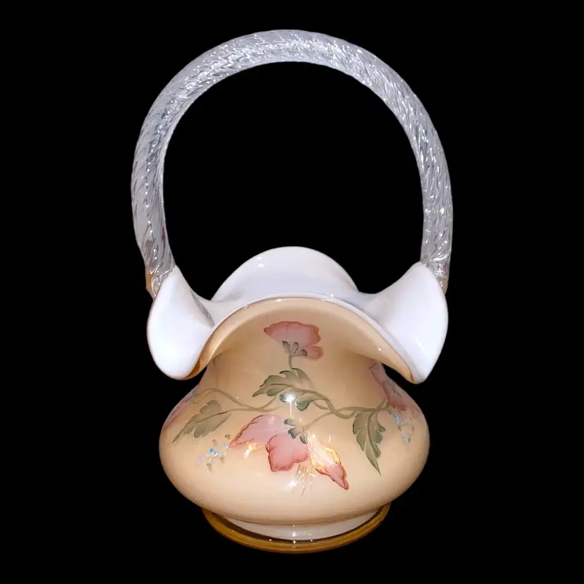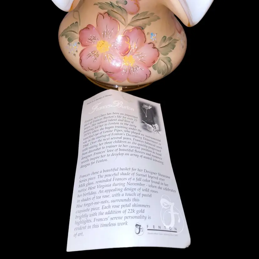 •This basket is Sunset overlay (a peachy orangey color over milk glass) with a wild rose design and 22k gold accents, designed by esteemed Fenton artist Francis Burton.