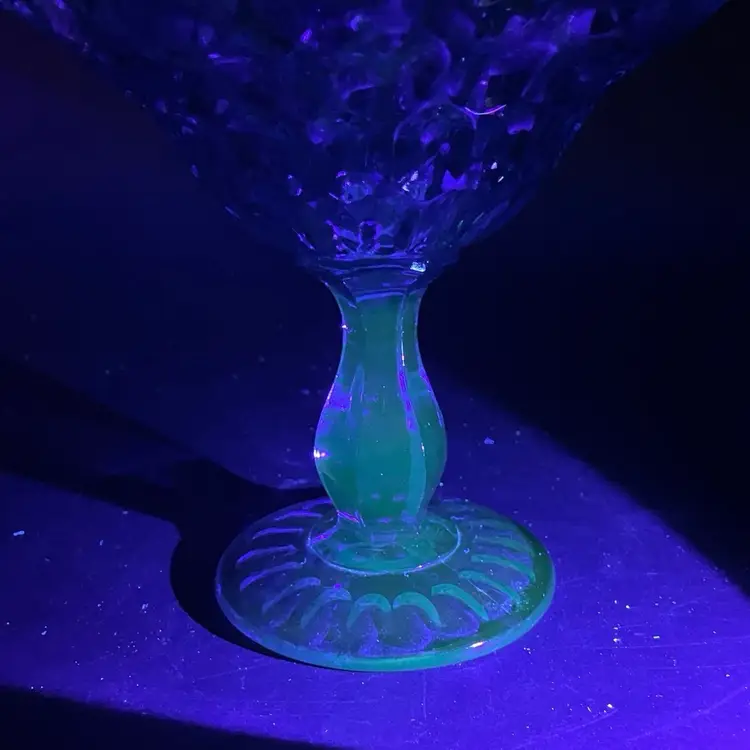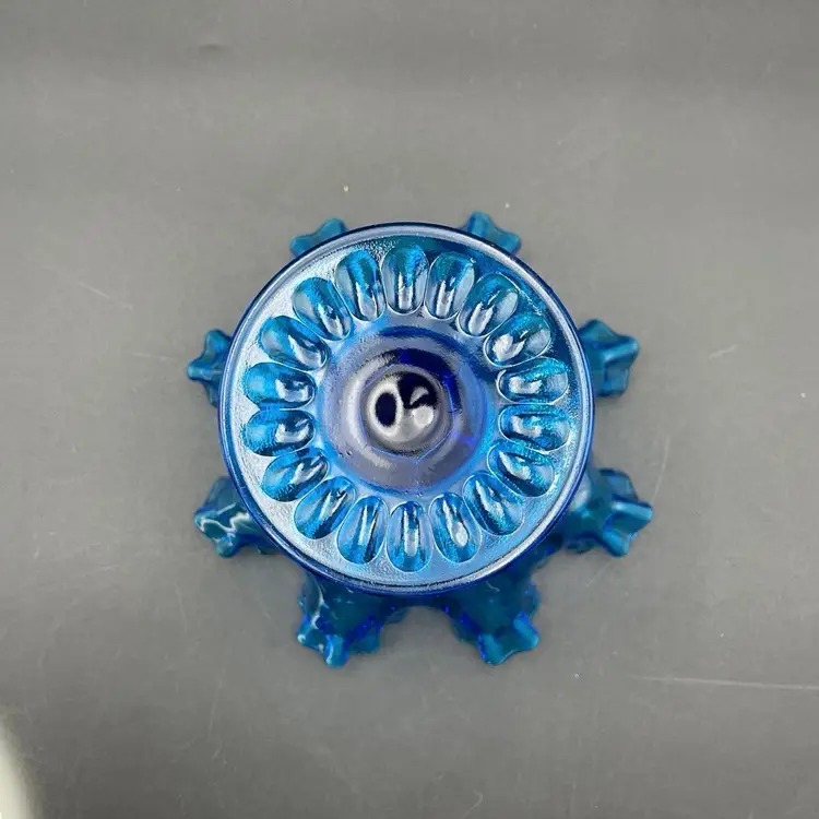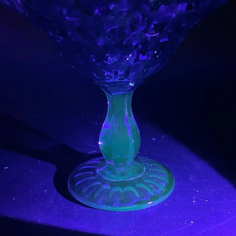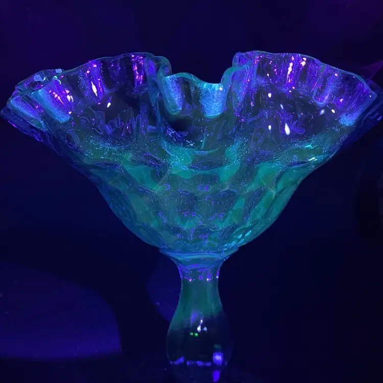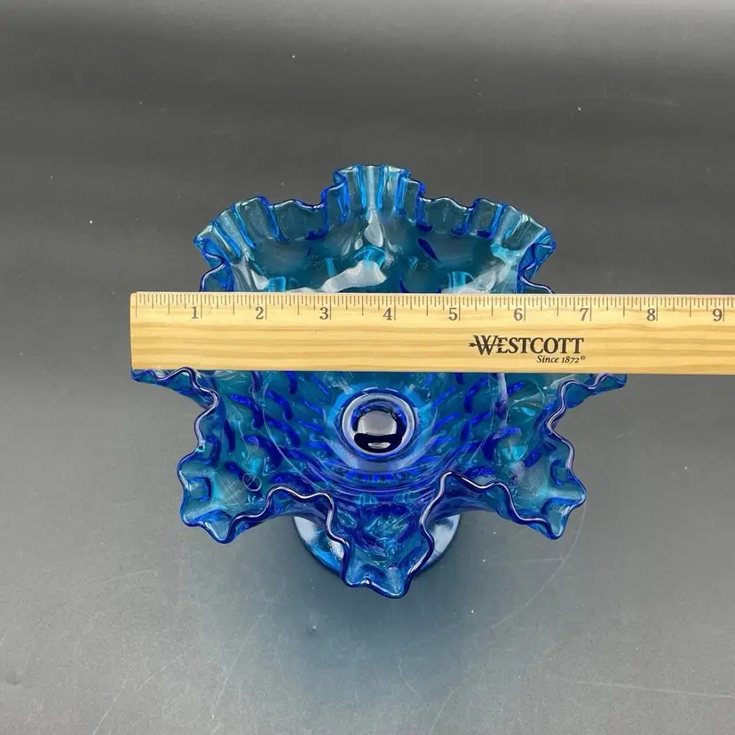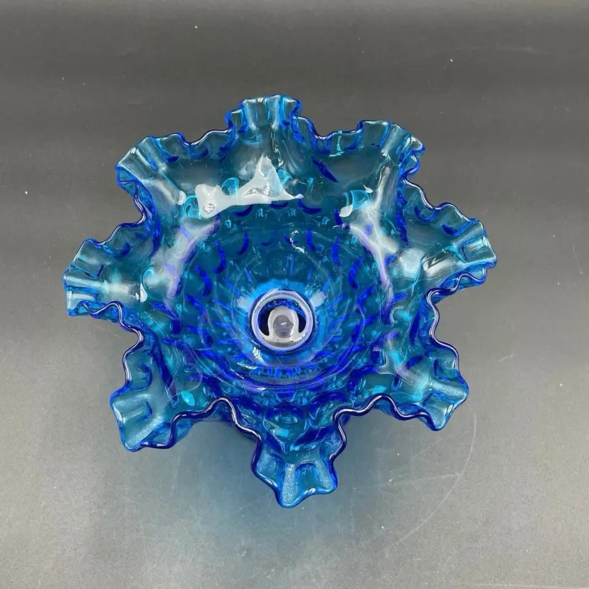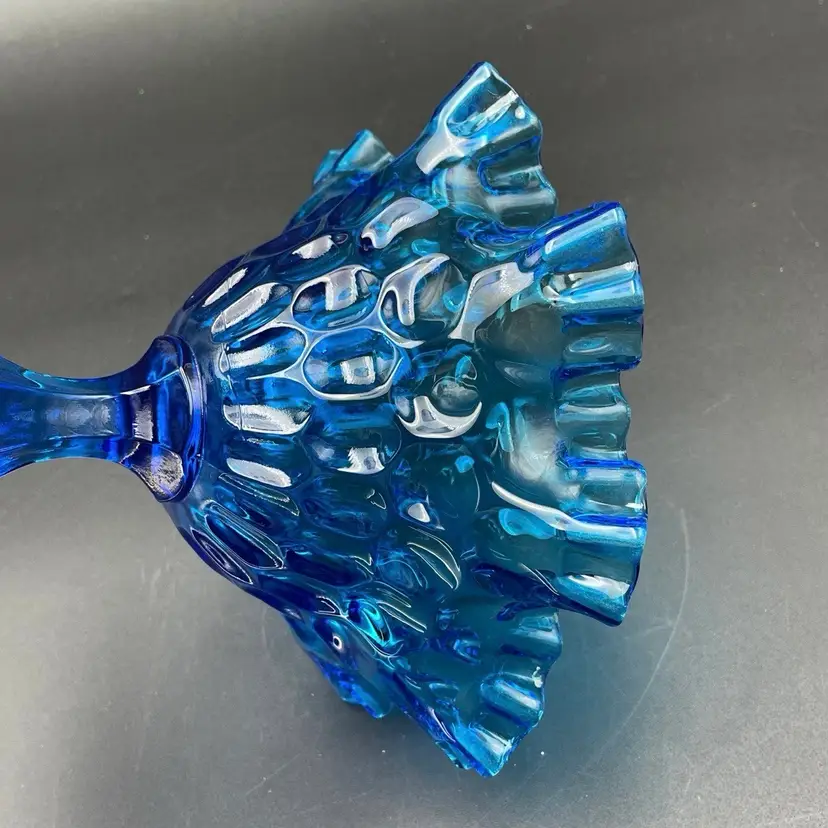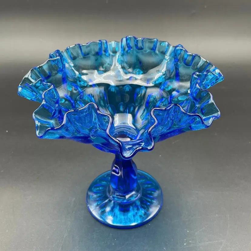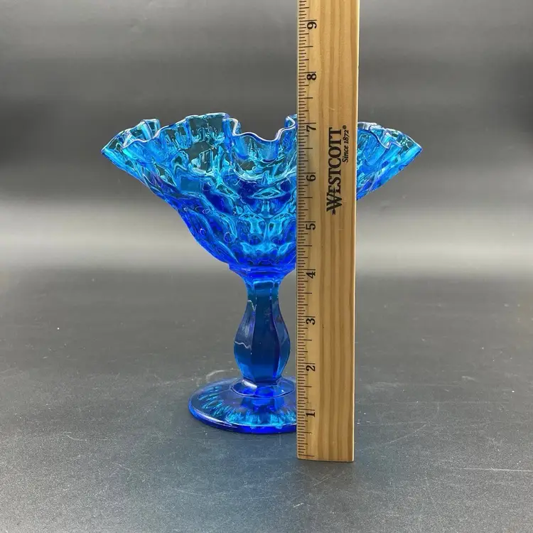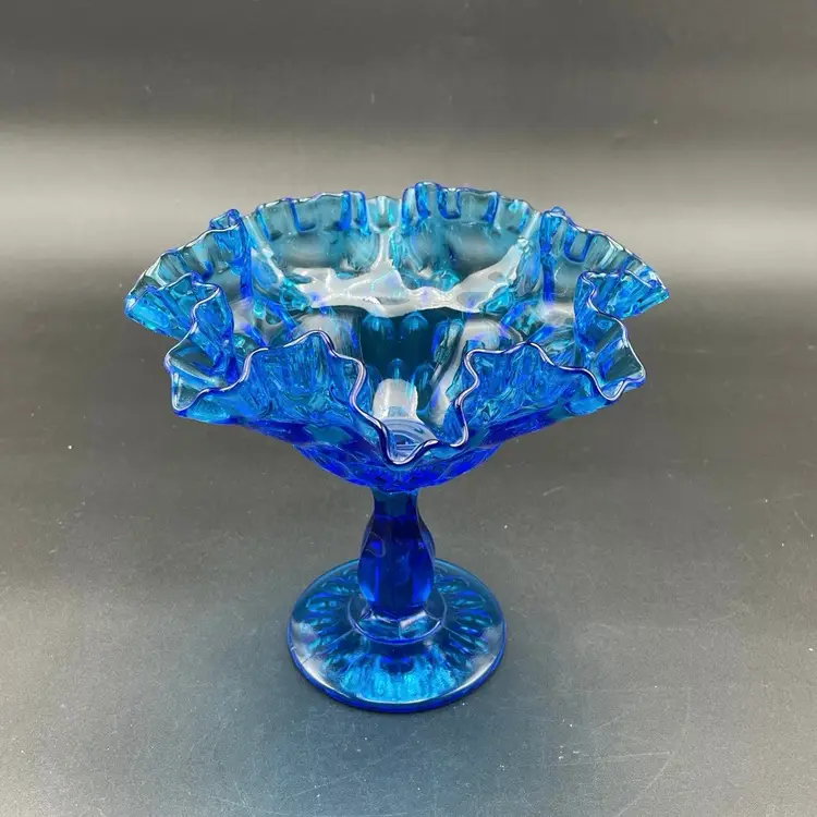 This is a vintage Fenton Glass Colonial Blue ruffled thumbprint pedestal compote. Glows under blacklight. Measures approximately 7" tall x 7" across the top. No chips or cracks.