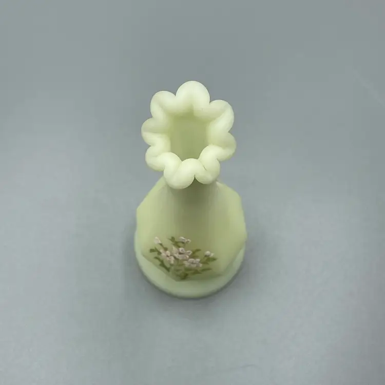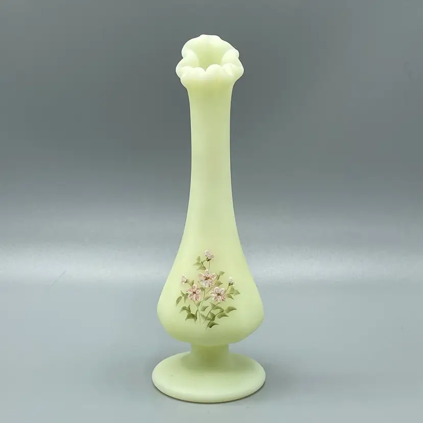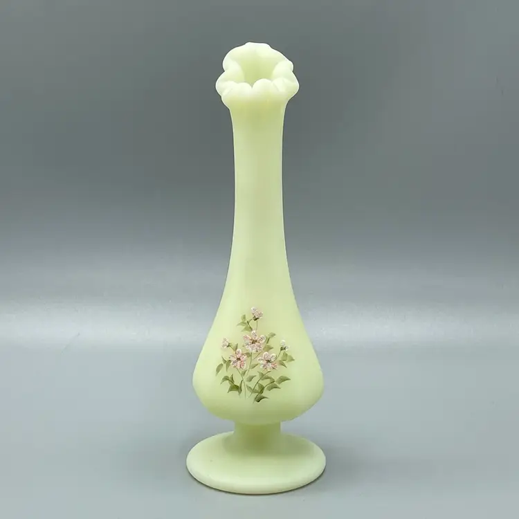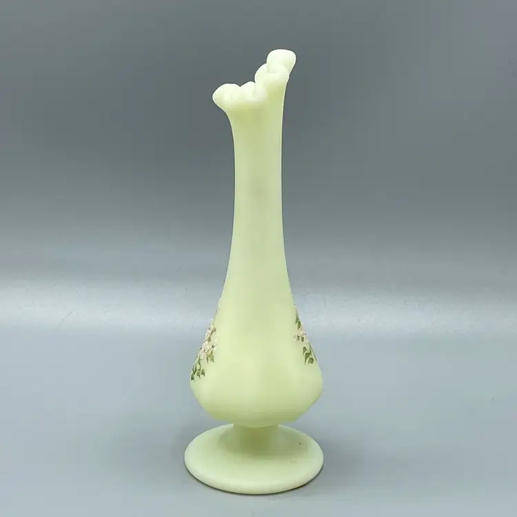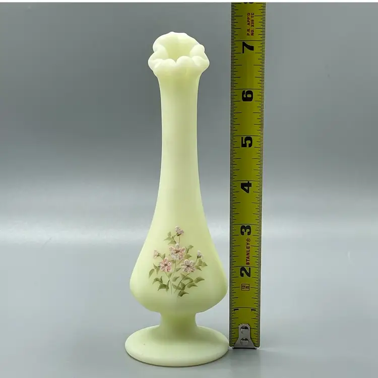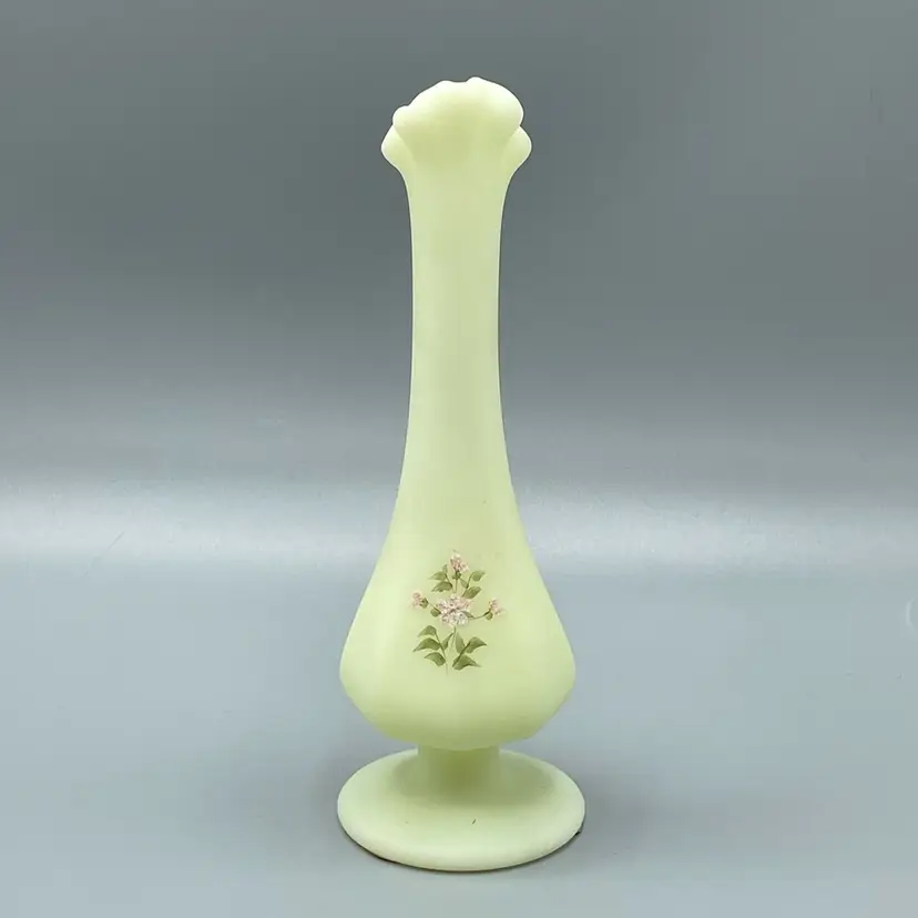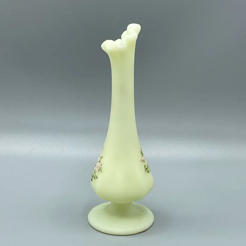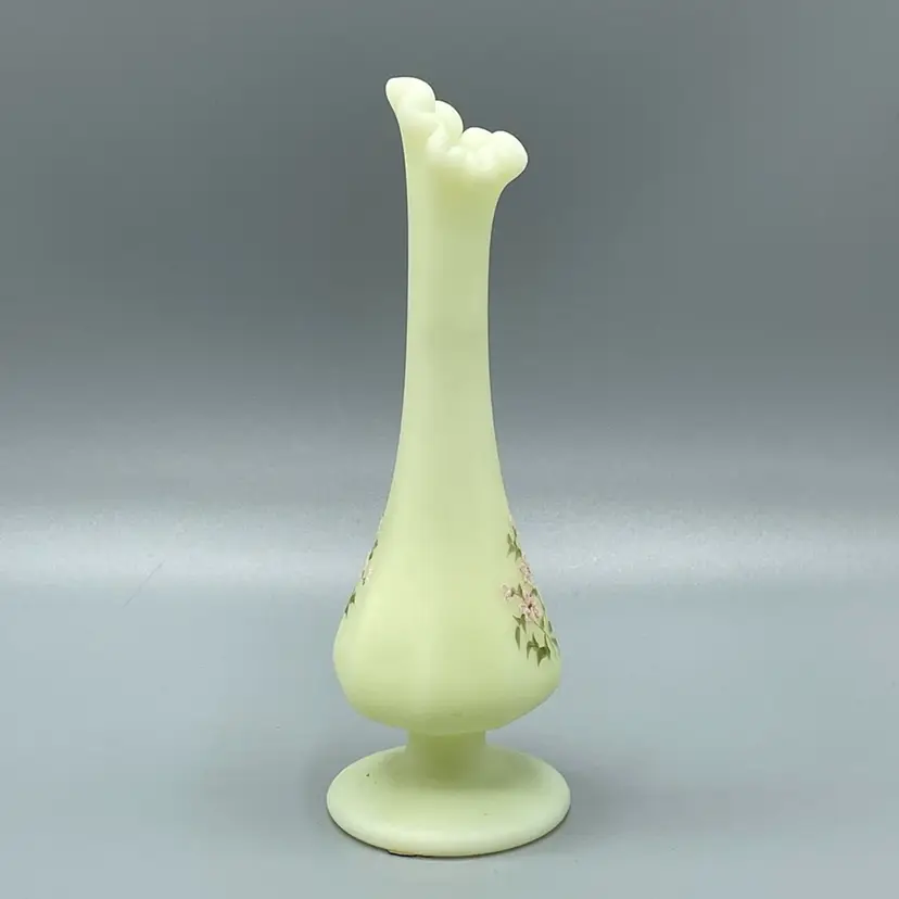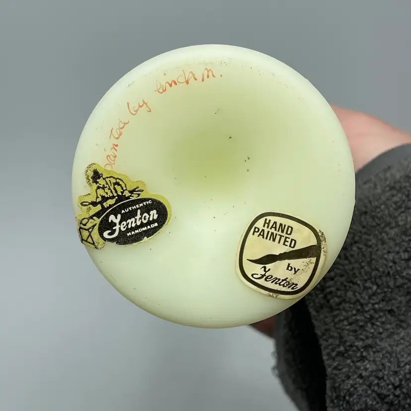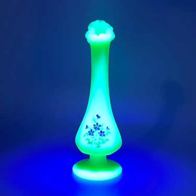 No chips or cracks. This Fenton vase glows INTENSELY green under UV light. This was hand painted and is signed by the decorator. There is also the original paper sticker labels. It stands about 7-1/4 inches tall.