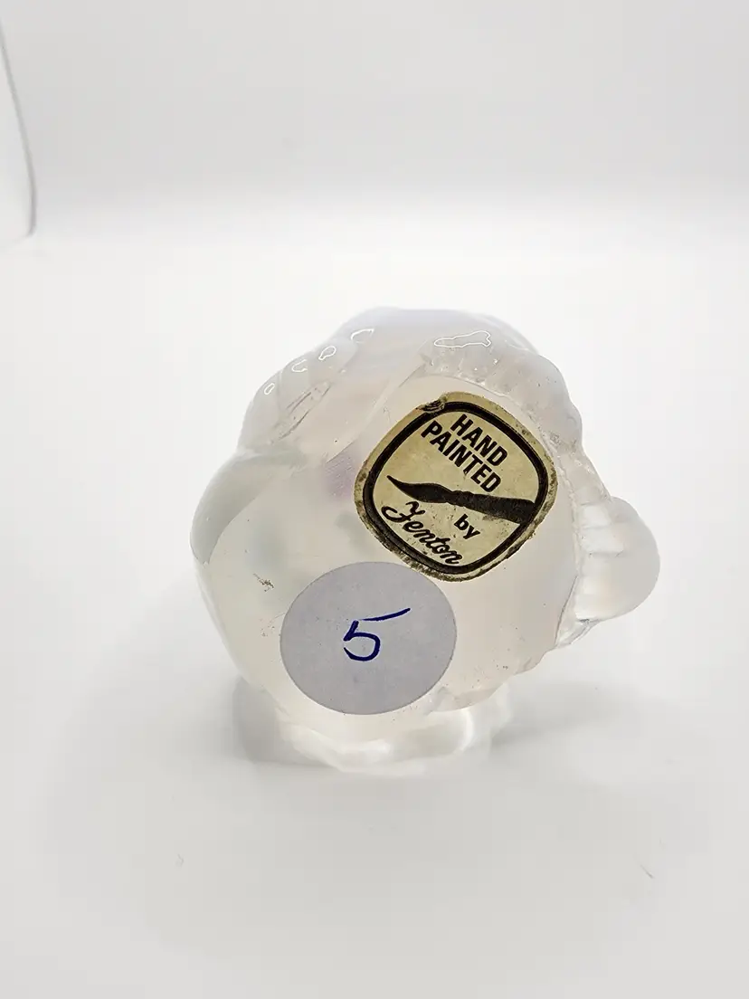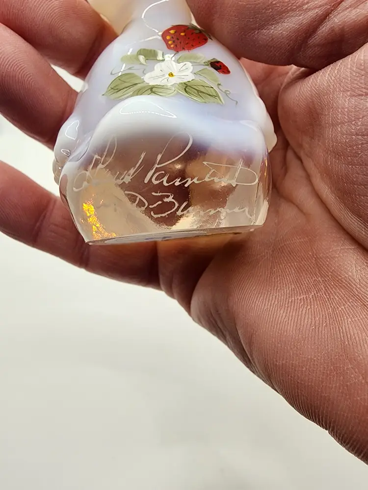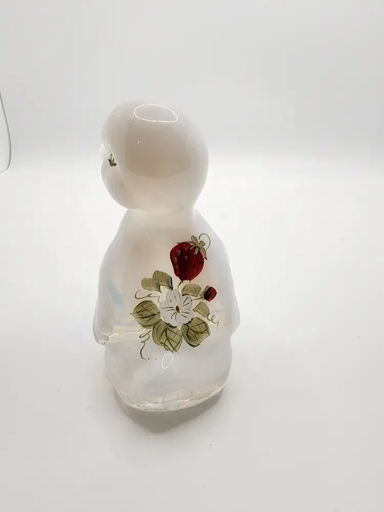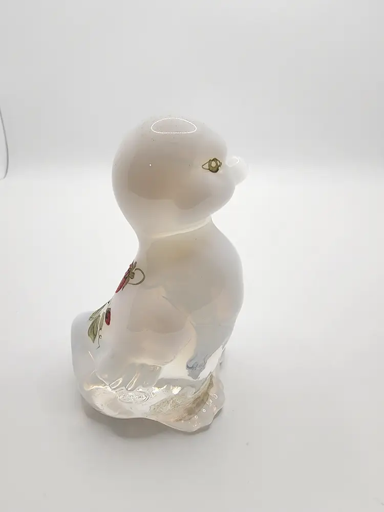 Charming Fenton glass duck figurine with a clear, glossy finish. Perfect for collectors or as a cute decor piece. This duck has painted strawberries. 3.5 inches tall