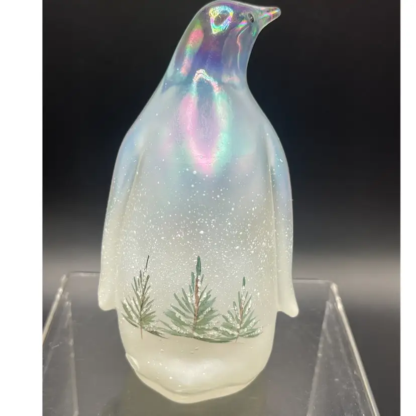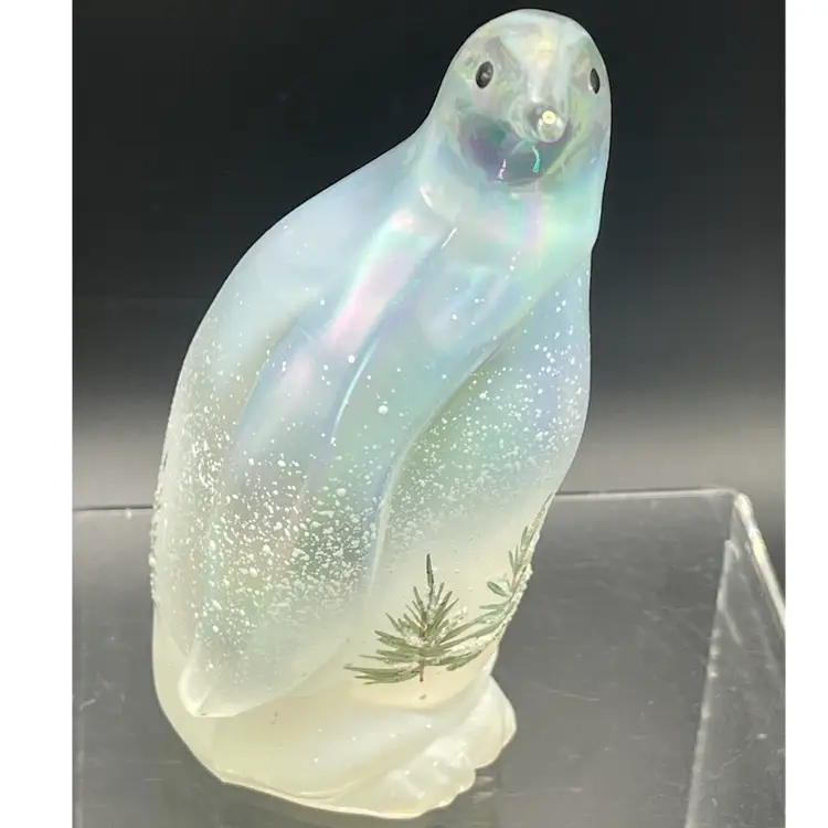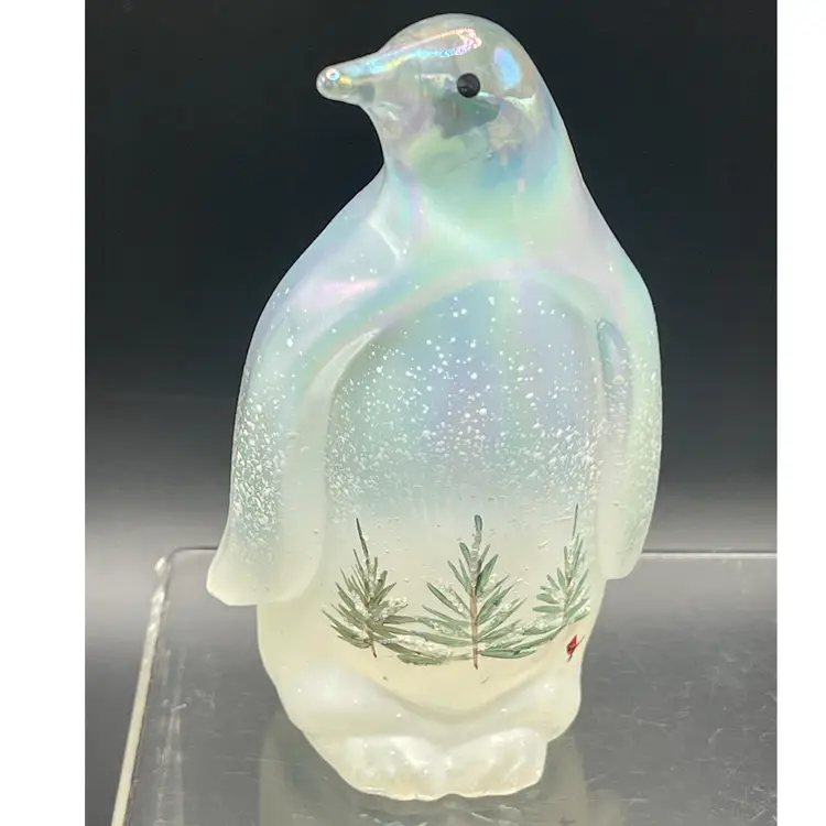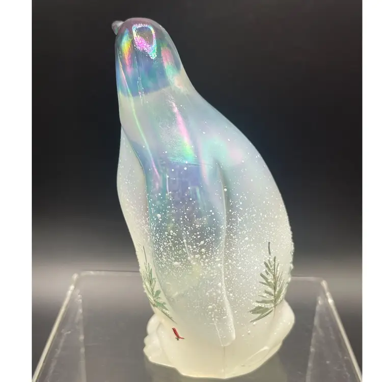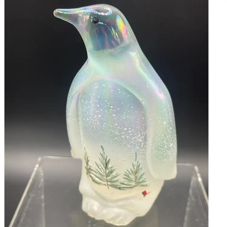 This charming Fenton art glass penguin is a beautifully hand-painted piece from the Woodland Frost collection. Crafted from French opalescent carnival glass, the penguin features a cardinal in a delicate winter scene with crushed glass trees and snowflakes, adding texture and depth to the design. The figure is approximately 4 1/2 inches tall and is marked with Fenton item number 5267 FE. It was made in 2000 and is hand-signed by the artist: V.Williams