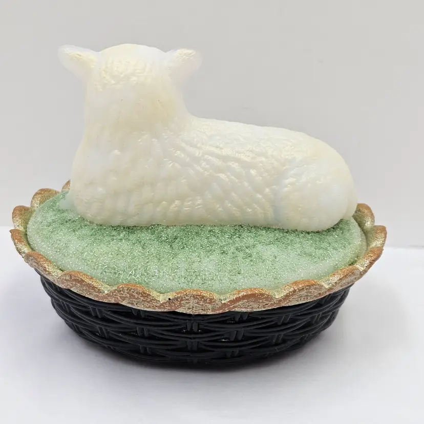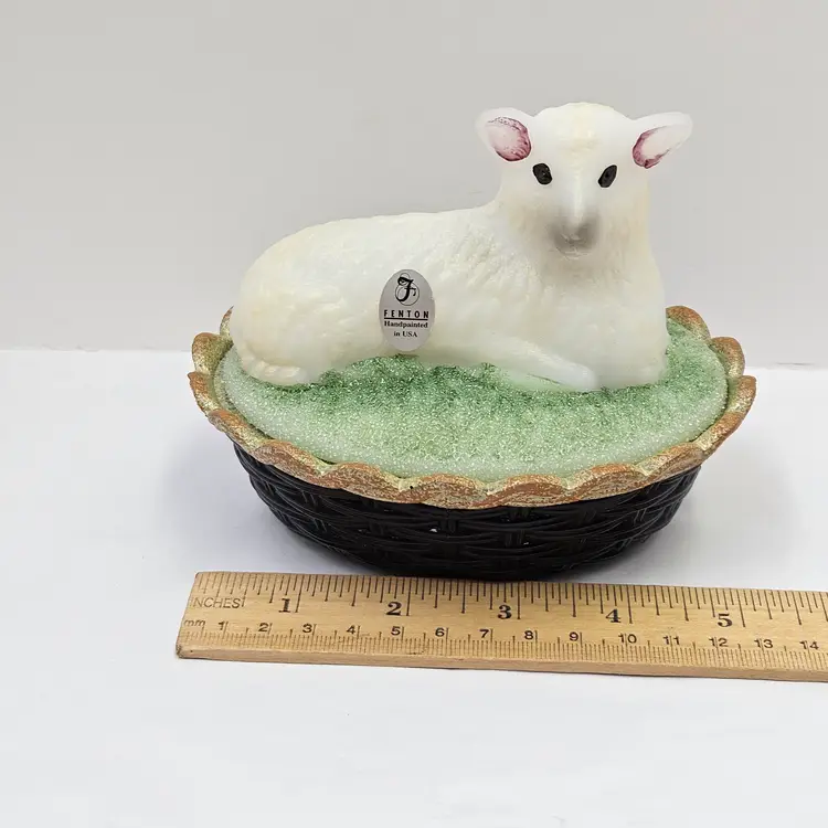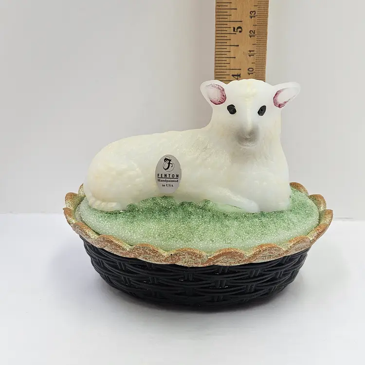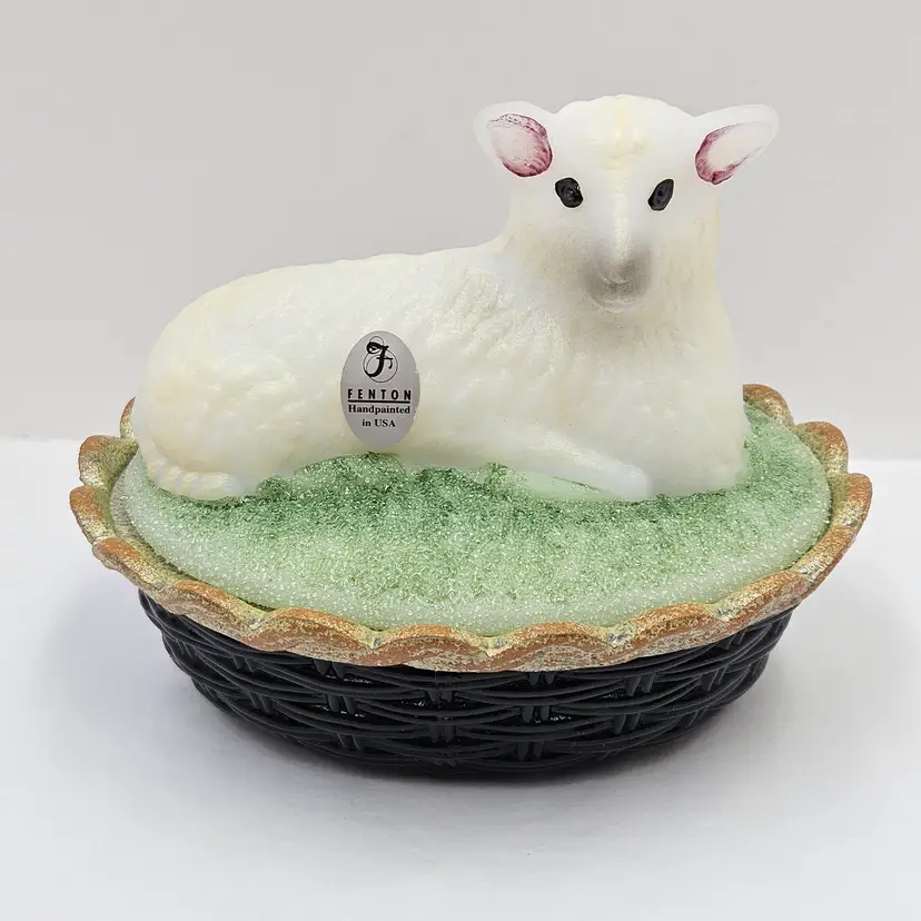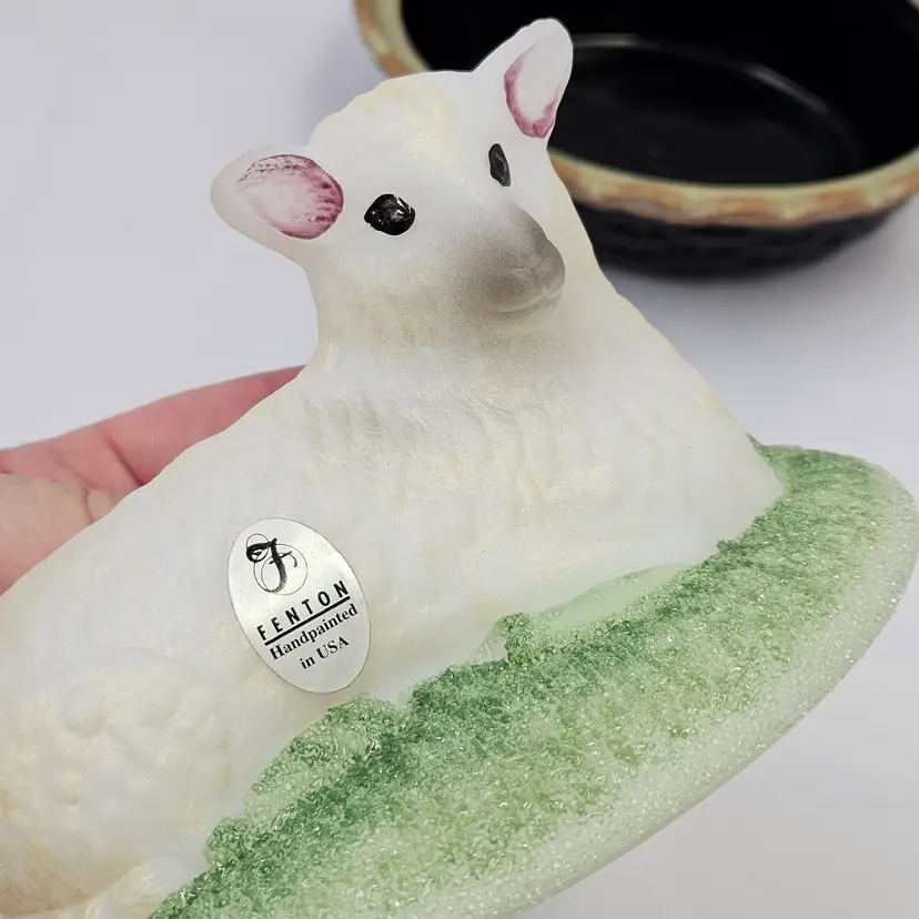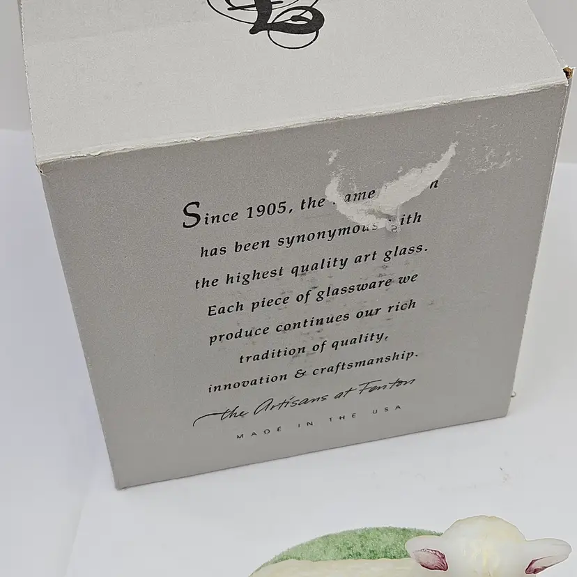 Fenton "Folk Art Collection" Lamb on Nest, hand painted & signed, with original box (box has shelf wear and marks), NO damage to glass.