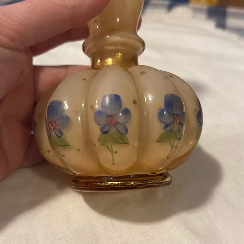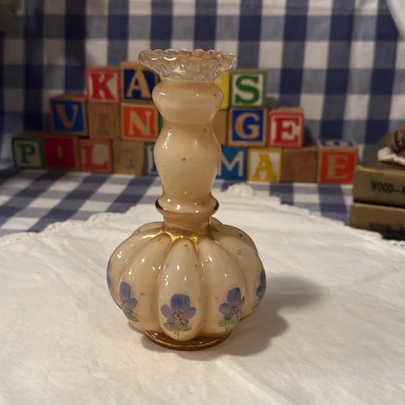 Fenton Glass Pink Opaline Colored Charleton Vanity Perfume Bottle Hand-Painted With Light Blue/Purple Florals (no stopper).