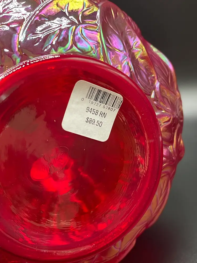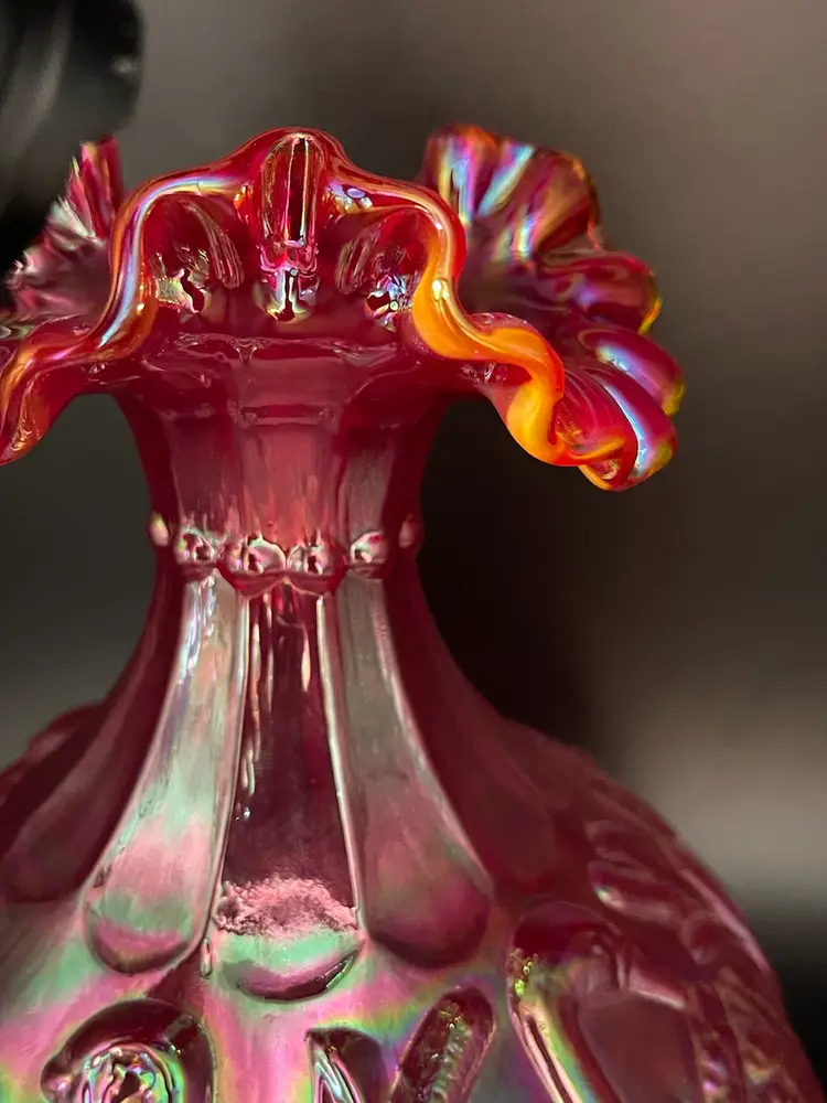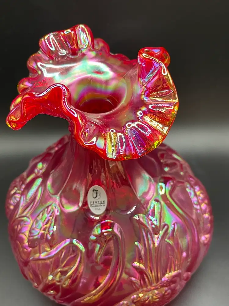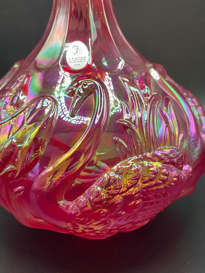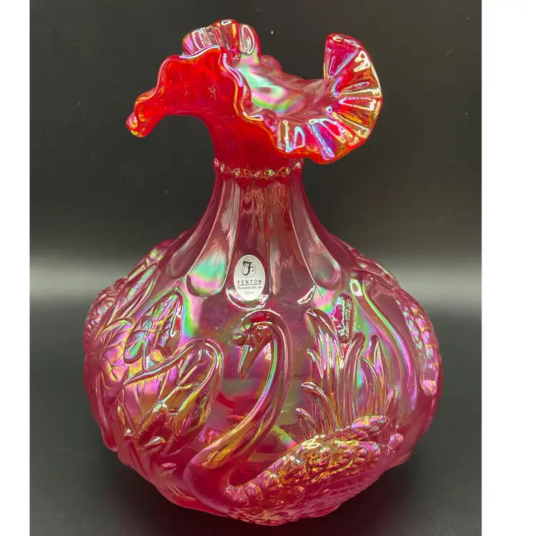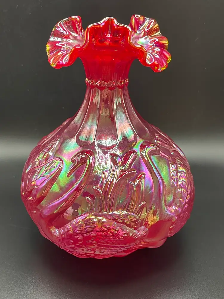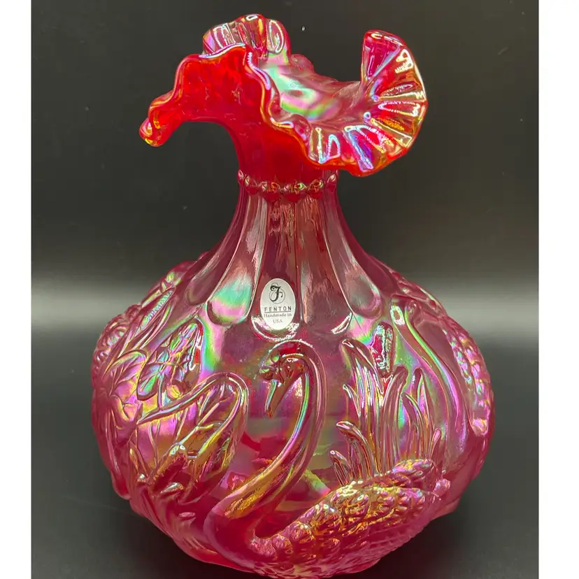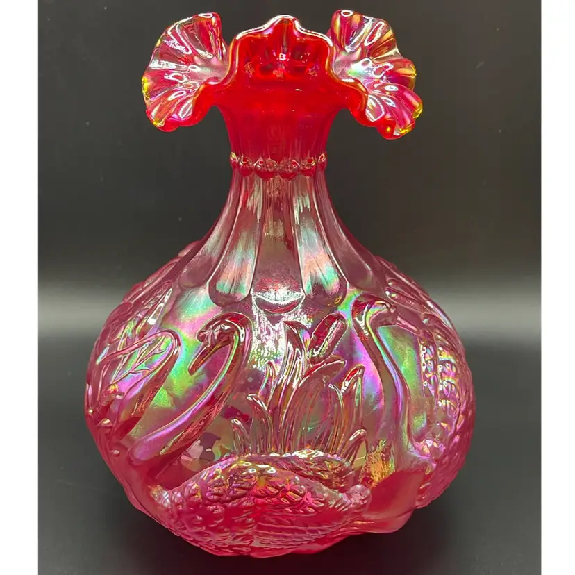 This stunning Fenton Swan Vase is a true masterpiece, handcrafted by the skilled artisans at Fenton. Made from rich ruby red carnival glass, it features a beautiful iridescent finish that adds a captivating sparkle. The vase is adorned with an intricate swan motif in sculptural bas-relief, gracefully encircling the piece. The top edge is finished with a delicate tri-crimp design. Standing 8 inches tall, this vase is a gorgeous addition to any collection, with its vibrant color and elegant design shining beautifully in any light.