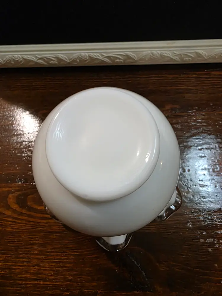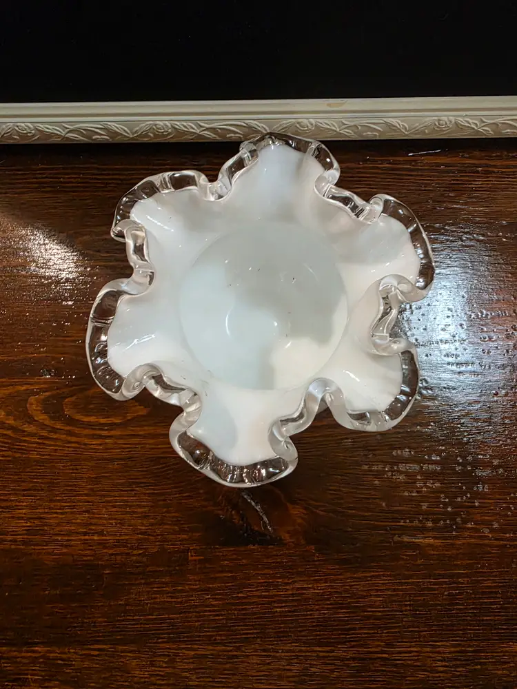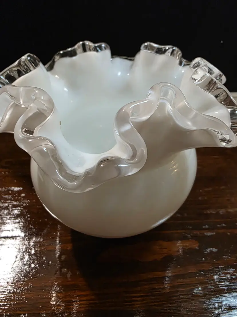 Vintage Fenton Glass Silver Crest Rose Bowl with Ruffled edge. Piece is in excellent condition with no chips or cracks. Rose Bowl is white in color with a clear Ruffled Edge. Piece is approximately 4 inches height and 5 inches round diameter width. Very nice collective piece of Fenton.