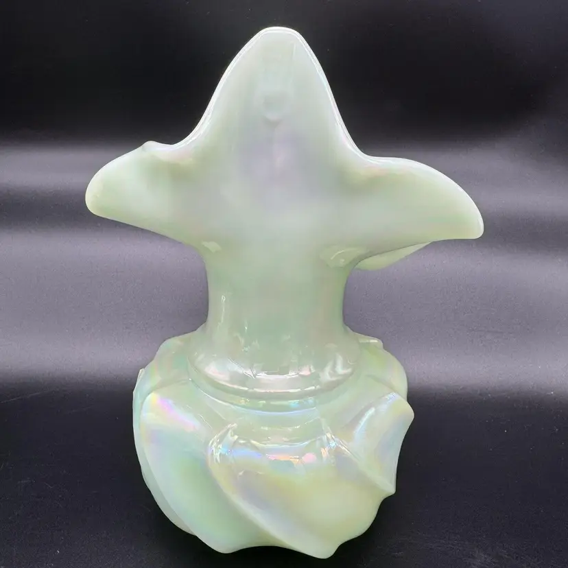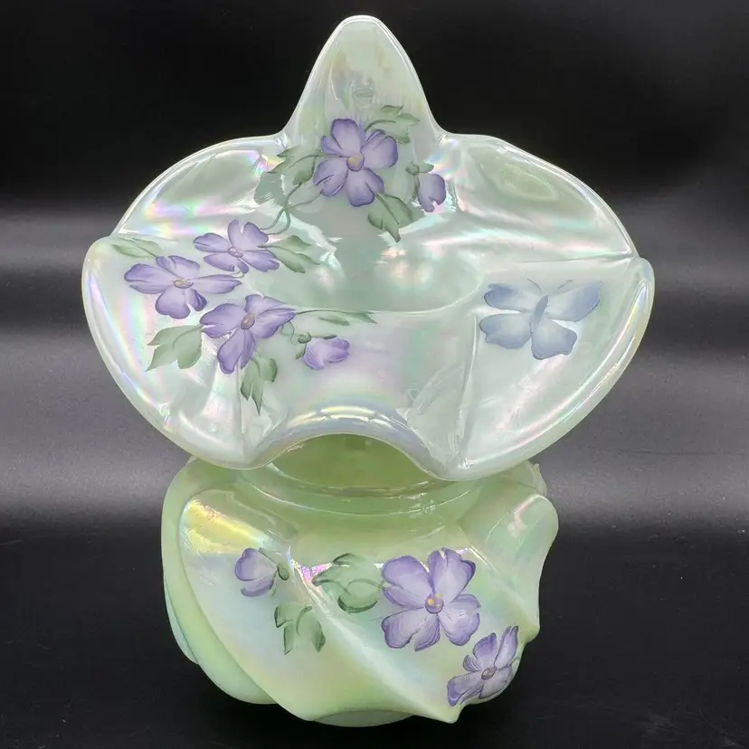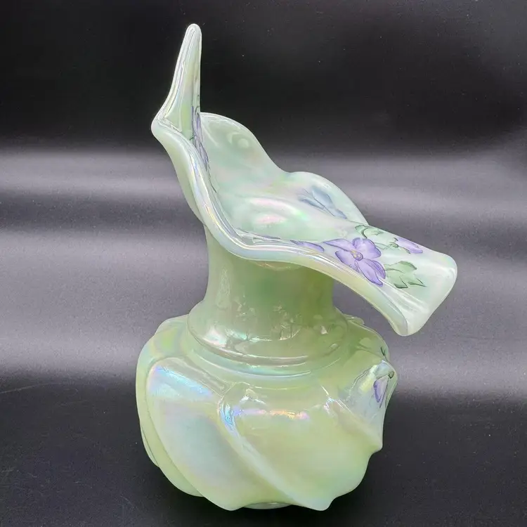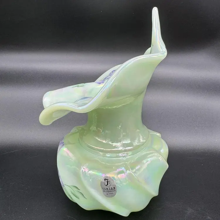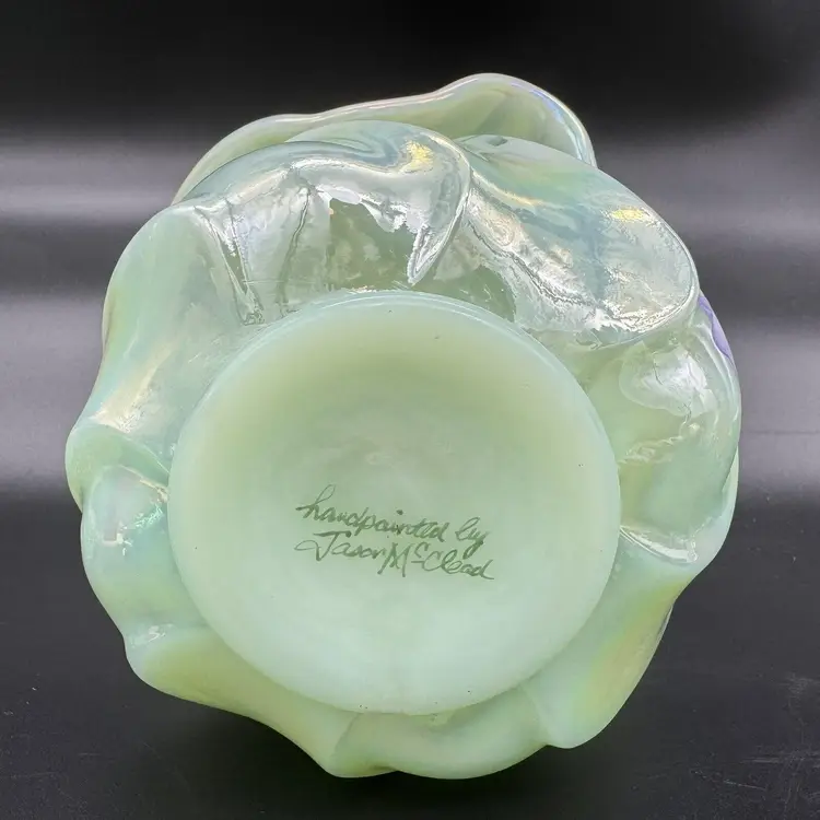 Fenton art glass vase Jack-in-the-pulpit form Green with iridescent / iridized finish Hand painted purple flowers and butterfly Hand signed on the bottom by Jason McCleod Original Fenton sticker Made in the USA Approximately 7 " tall x 5.5 " wide No cracks or chips