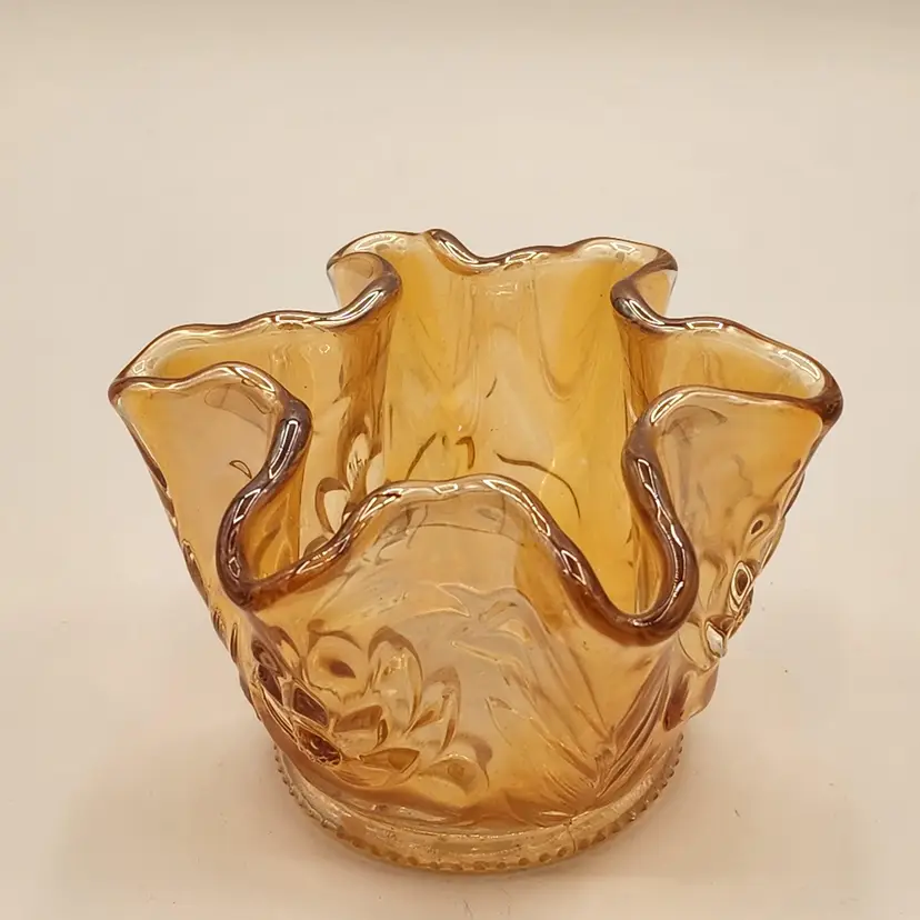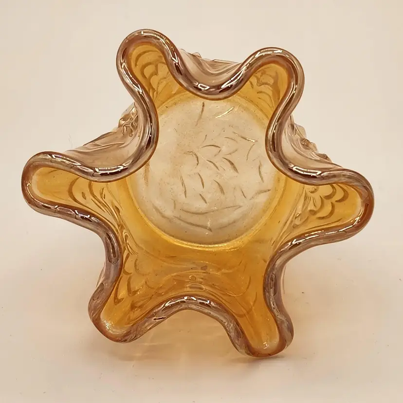 Fenton "Golden Sunset" Carnival Glass "Water Lily & Cattails" Whimsey Bowl. This pattern contains water lilies and cattails. It is heavy & well made. All over metallic iridescent luster. Cute little pulled up vase with unusual crimping at the rim. This is a bit small for a vase and tall for a toothpick holder. Coud be used as a match holder. Condition is excellent without chips cracks or staining.