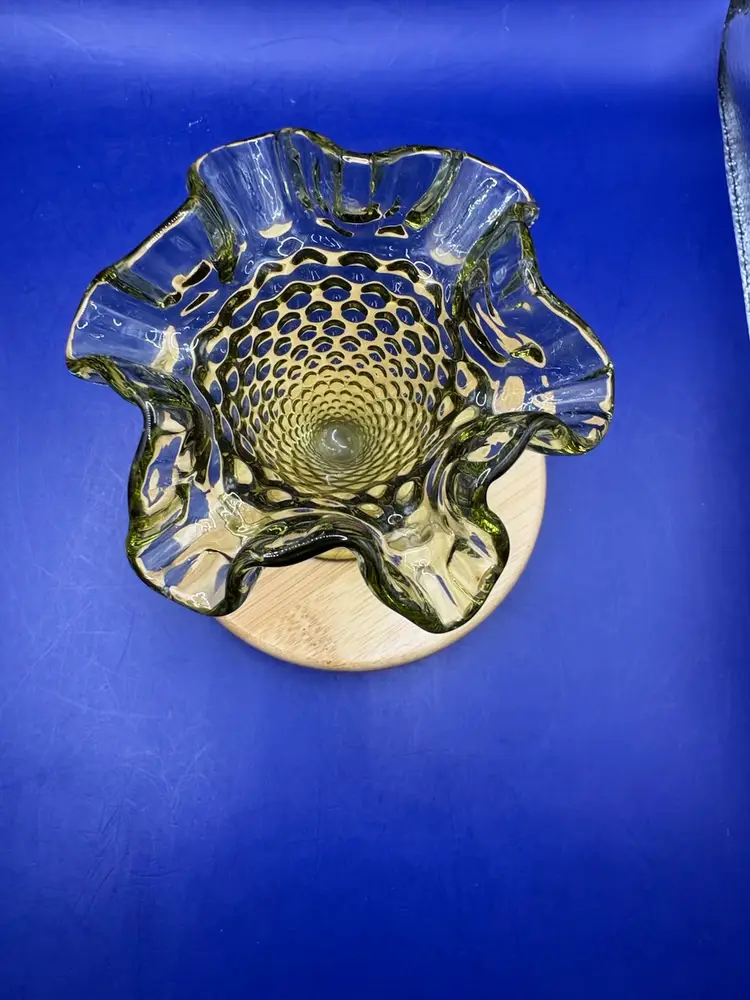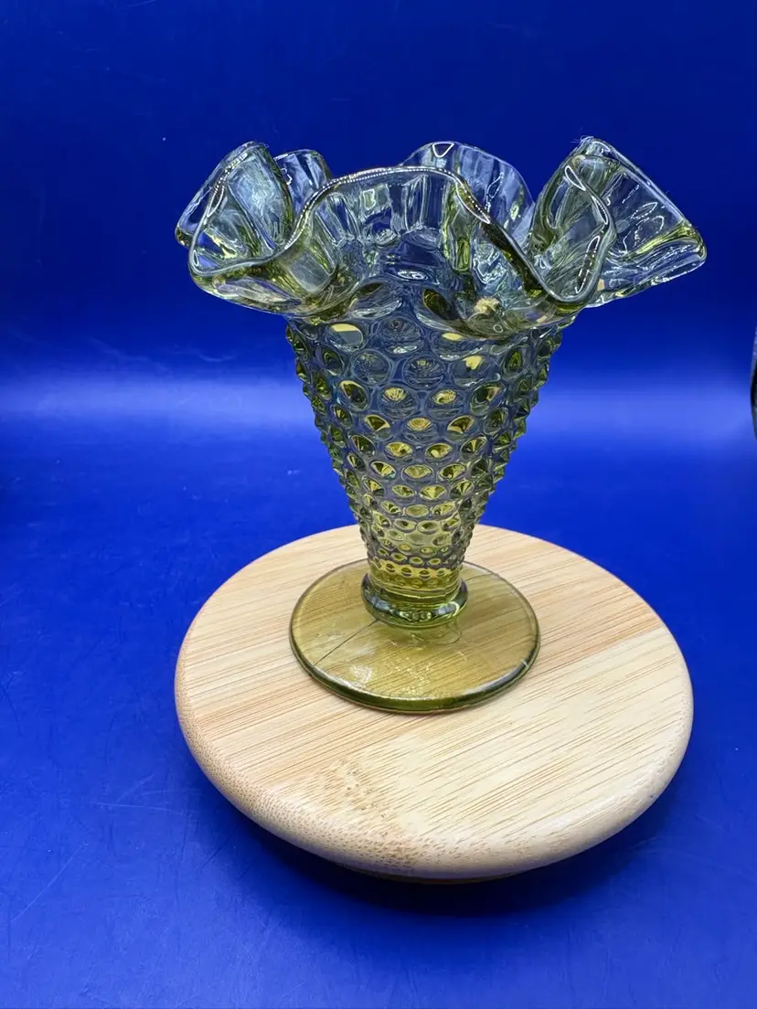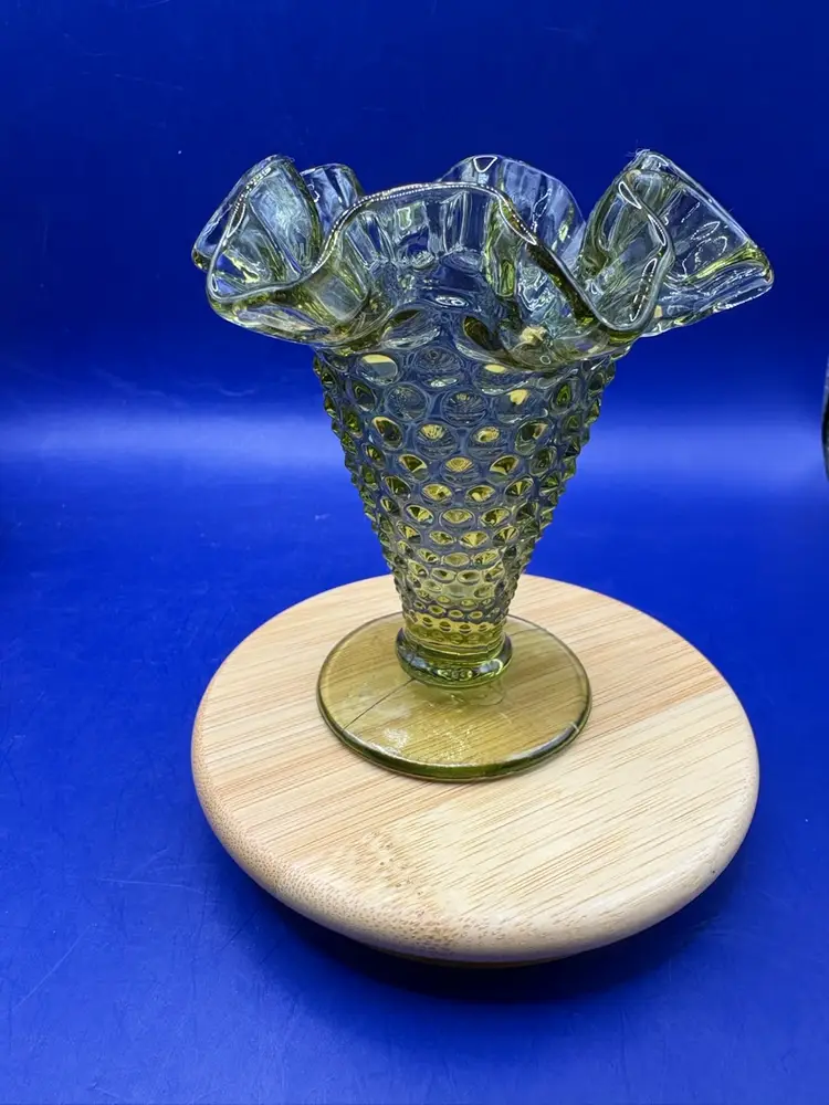 Fenton Hobnail Ruffled Edge Vase Green also called avocado or colonial green Measures 3 3/4 inches tall and wide Inexcellent condition