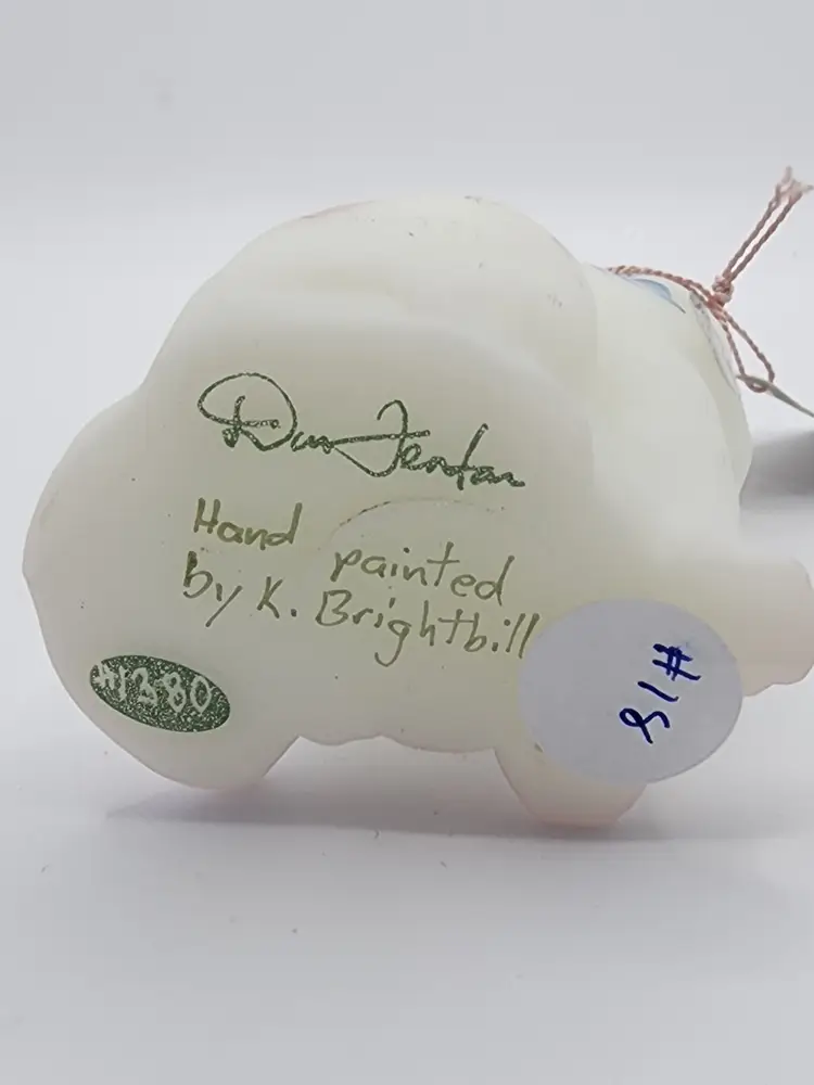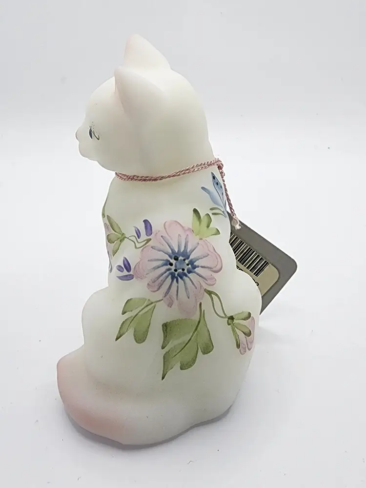 Charming Fenton cat figurine with delicate hand-painted floral details. Perfect for collectors and cat lovers alike. This piece was made for crackers barrel. Its in white satin with flowers