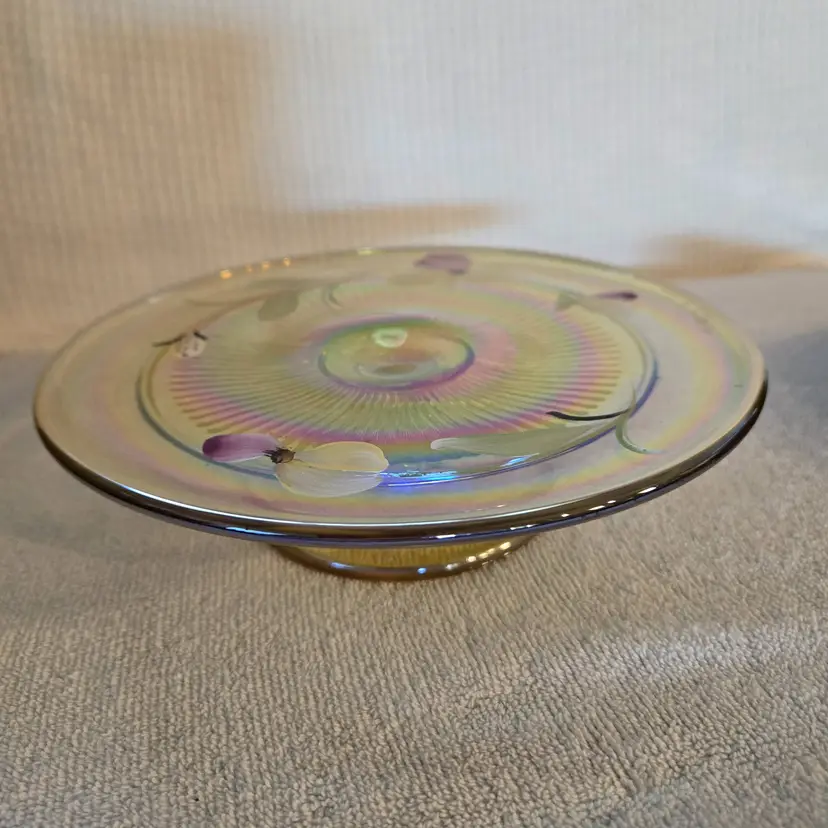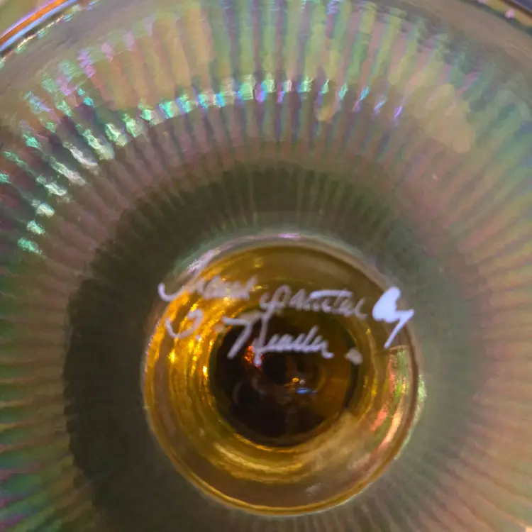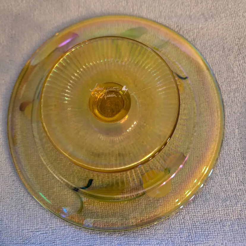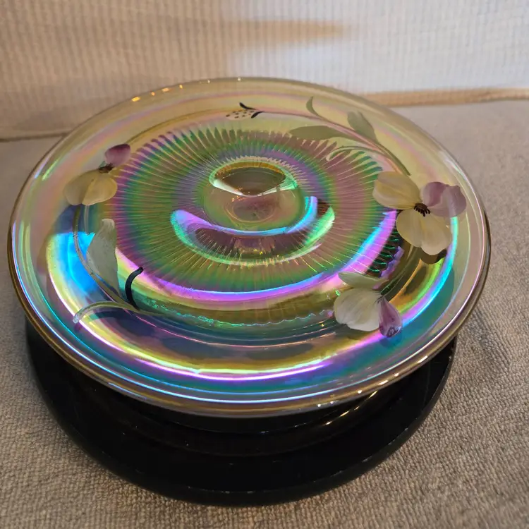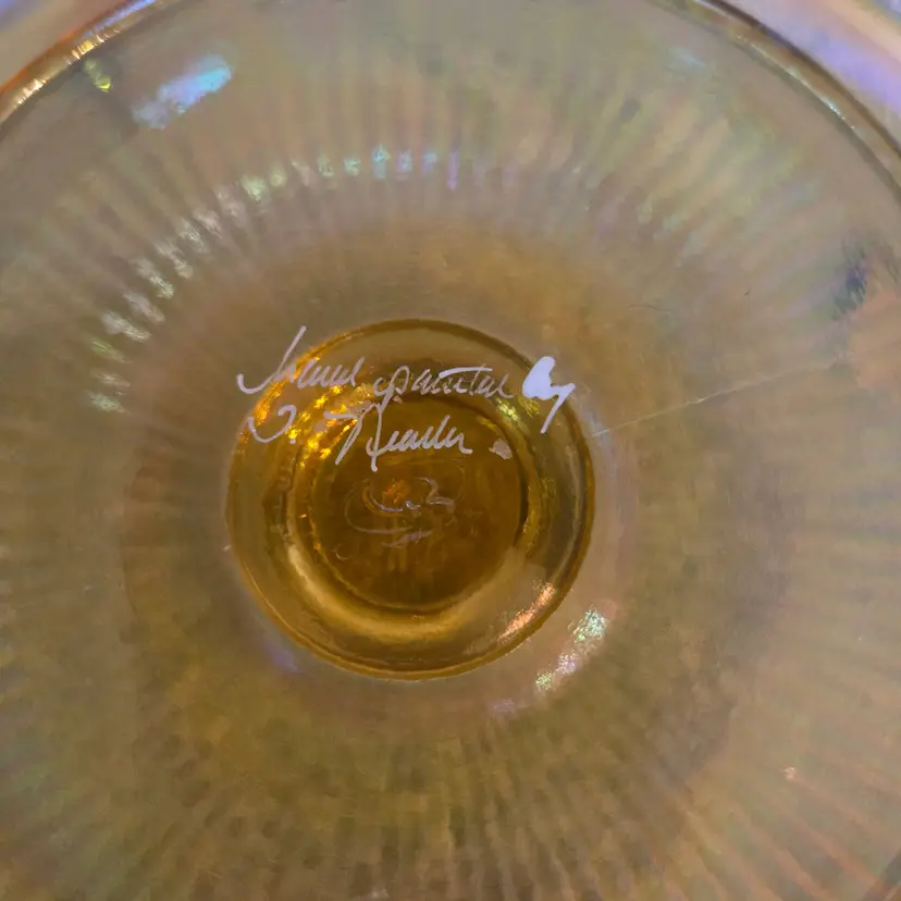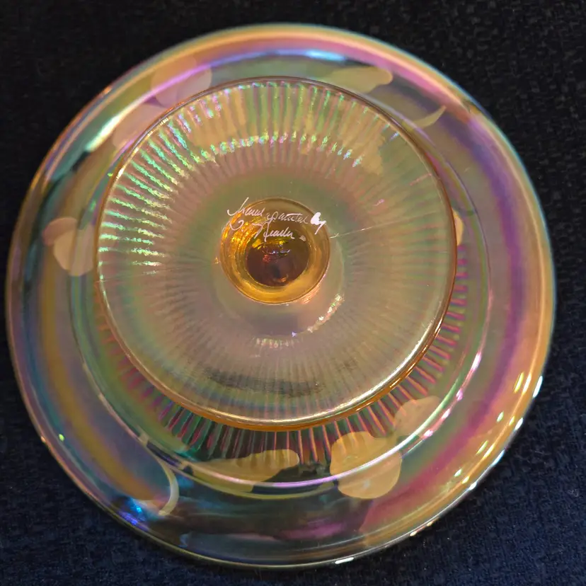 This is part of Fenton's "Autumn Gold" collection. It is Fenton's 100 year 2005 floral edition. Hand painted and signed by the artist. Measures 7 " around the top, 3 1/2" around the base and is 1 3/4" tall. This is a stunning piece of Fenton. No chips, cracks, or repairs.