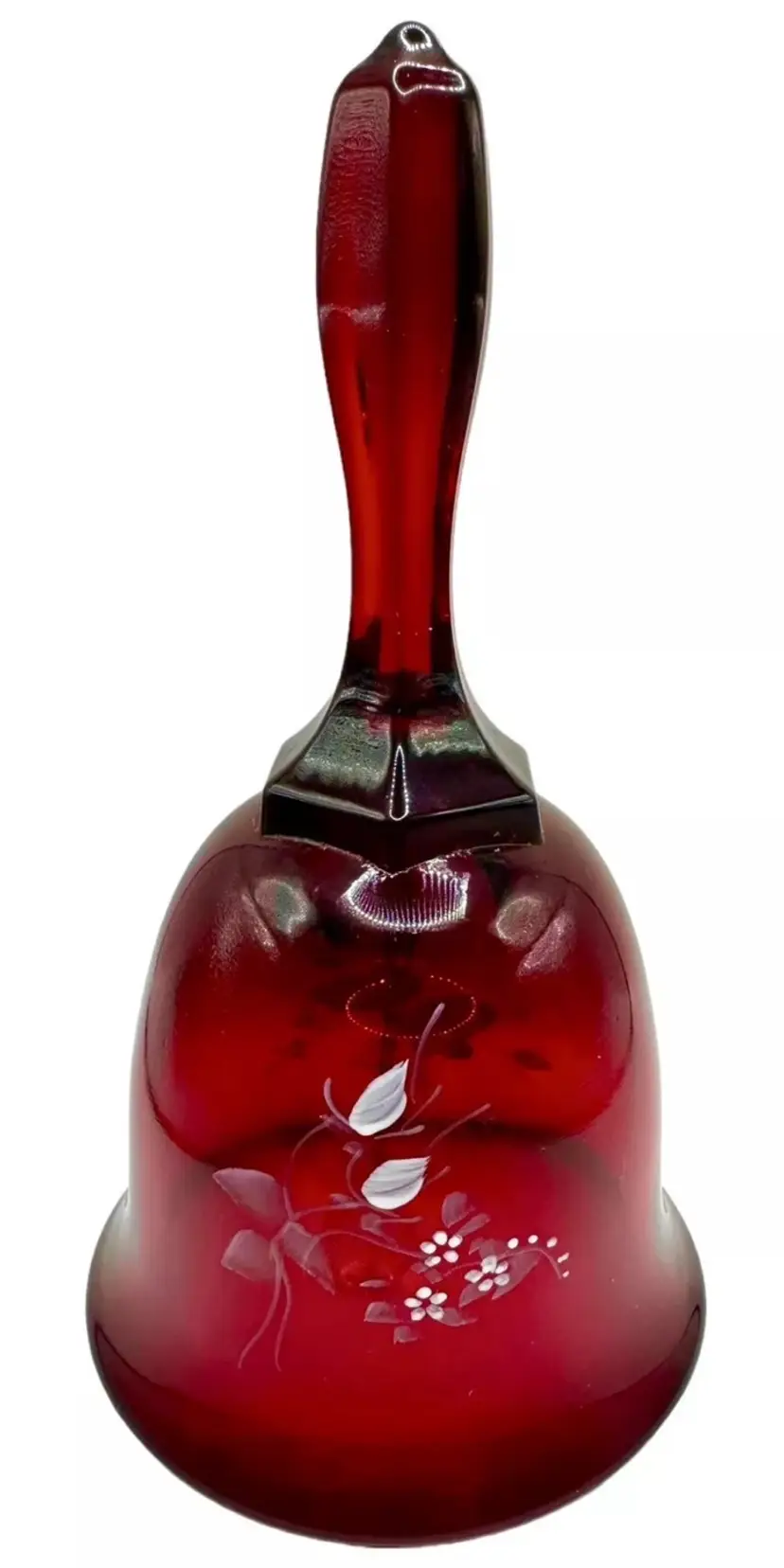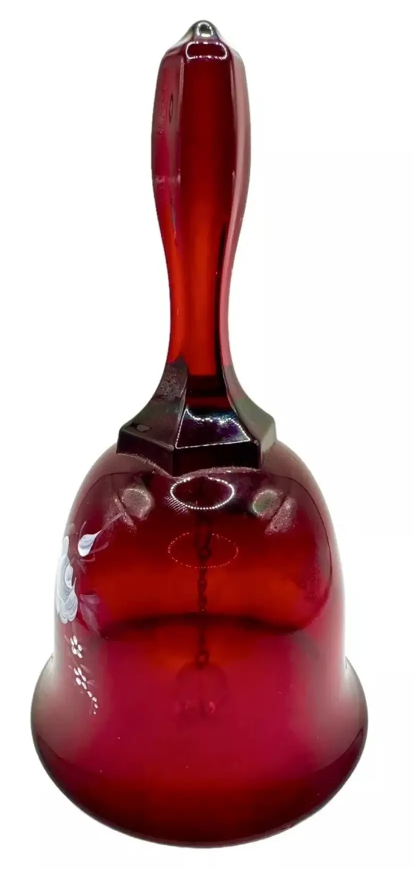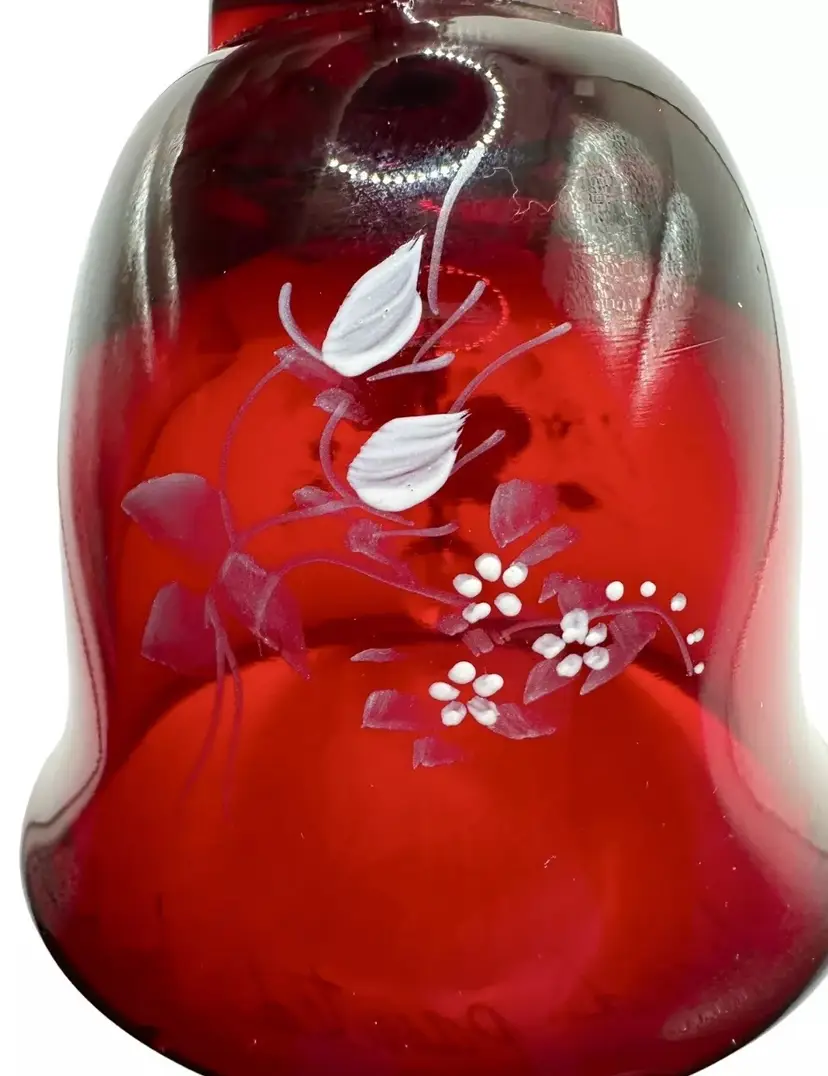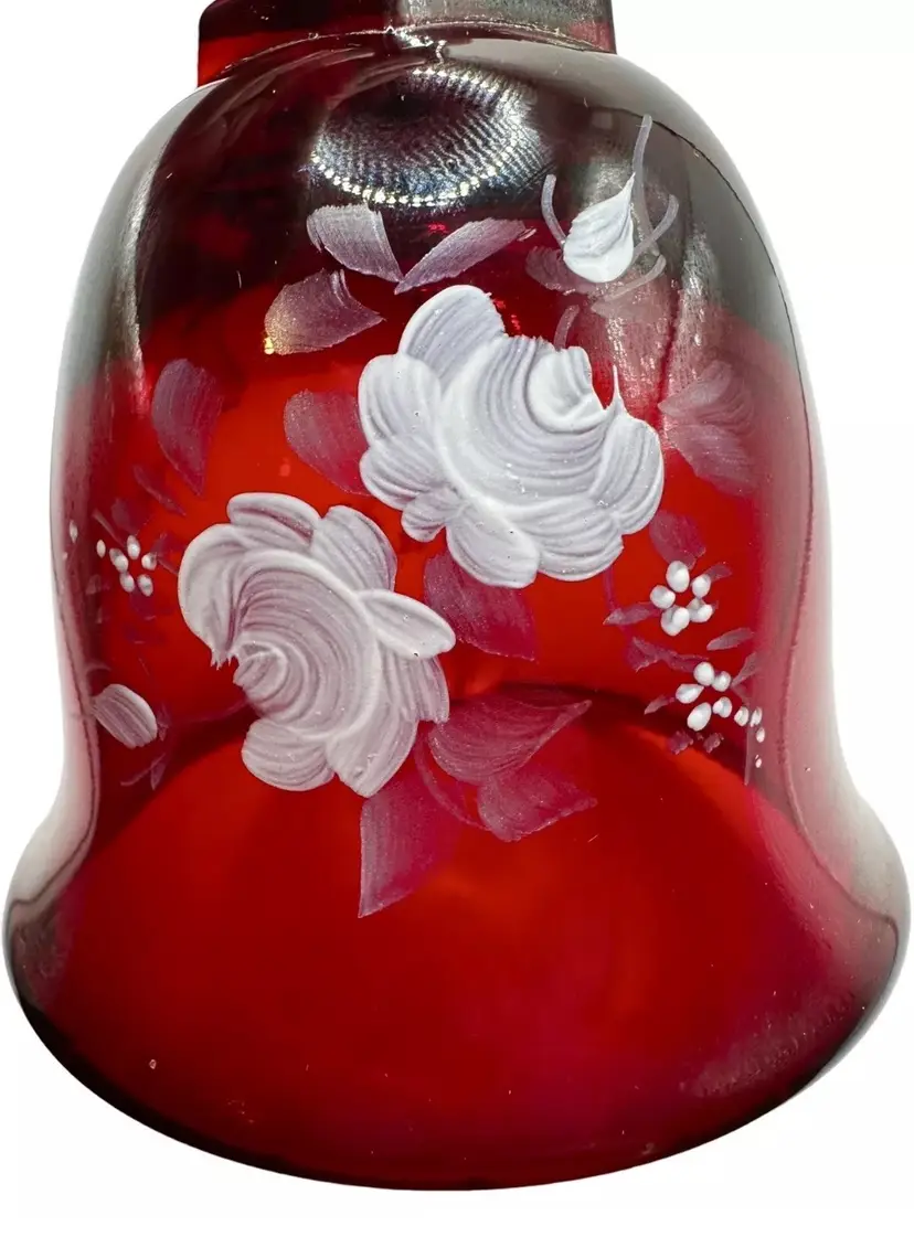 Gorgeous vibrant ruby red bell, handpainted with white roses and small daisies on one side and rose buds and daisies on the other. Signed L. Watson.