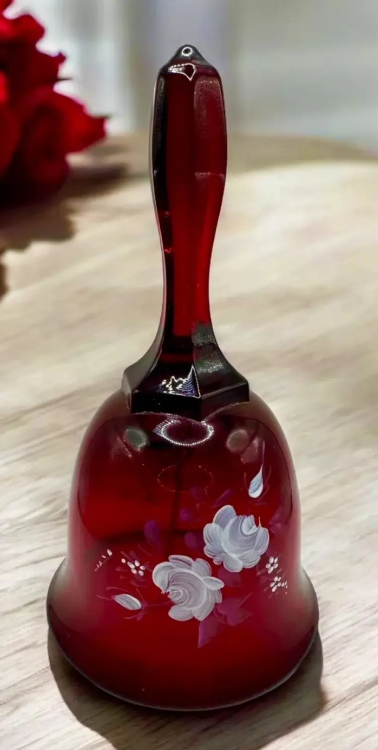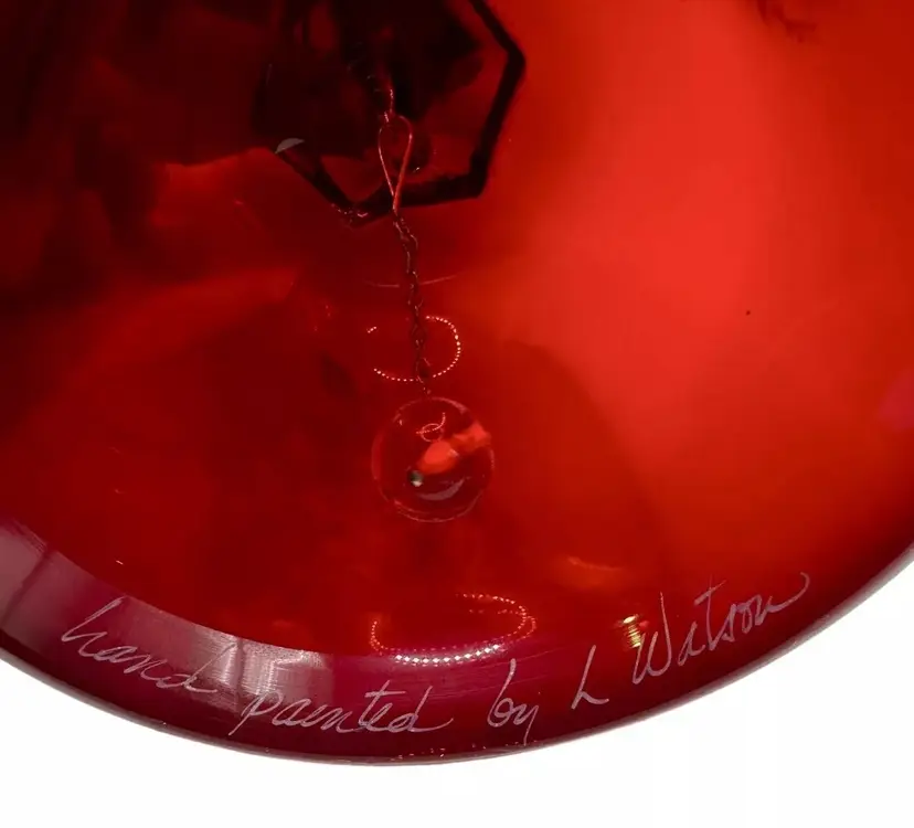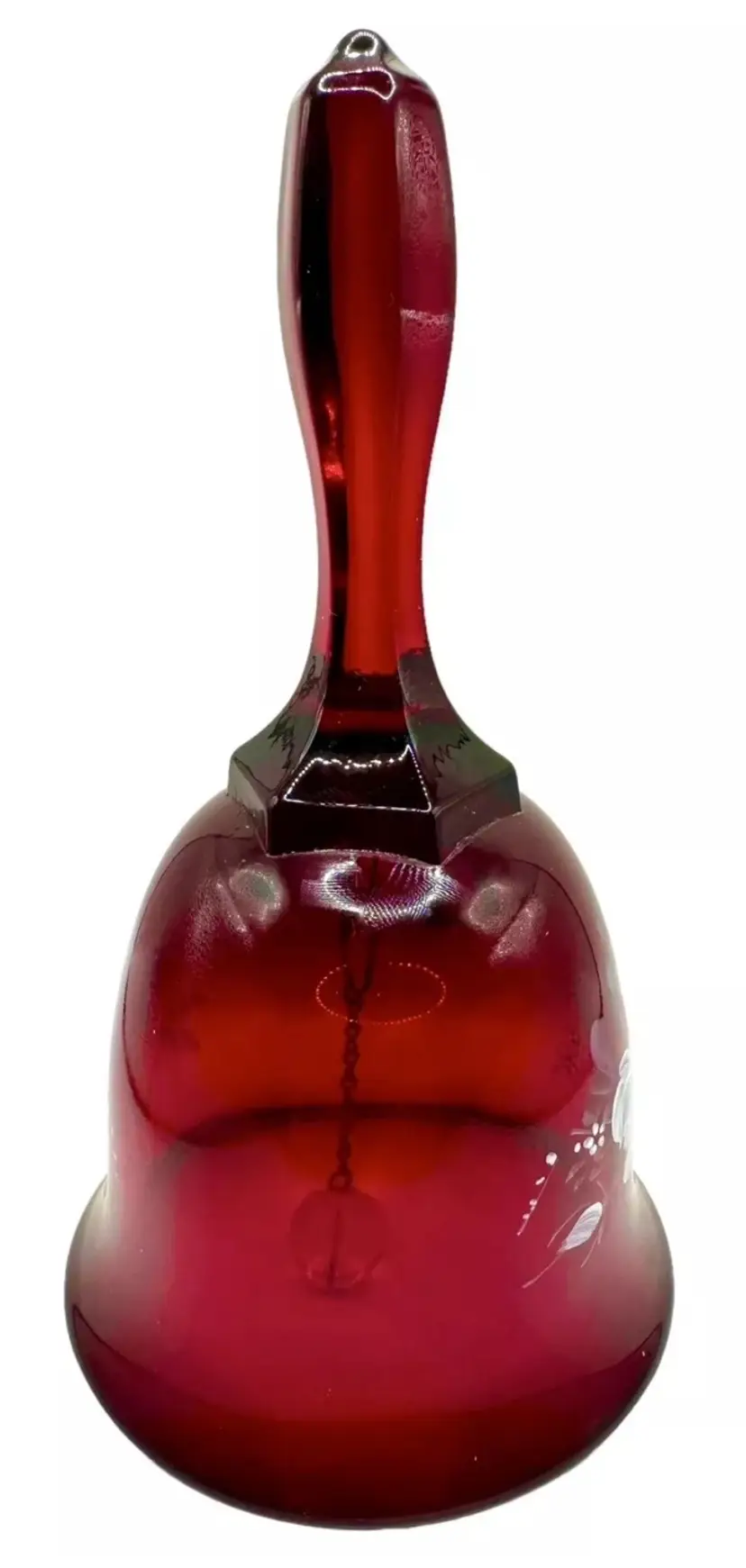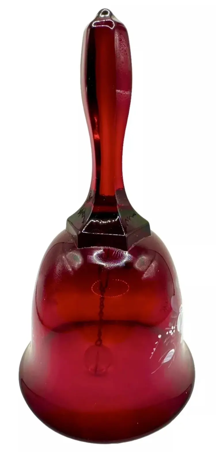 Gorgeous vibrant ruby red bell, handpainted with white roses and small daisies on one side and rose buds and daisies on the other. Signed L. Watson.