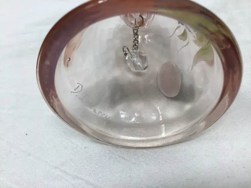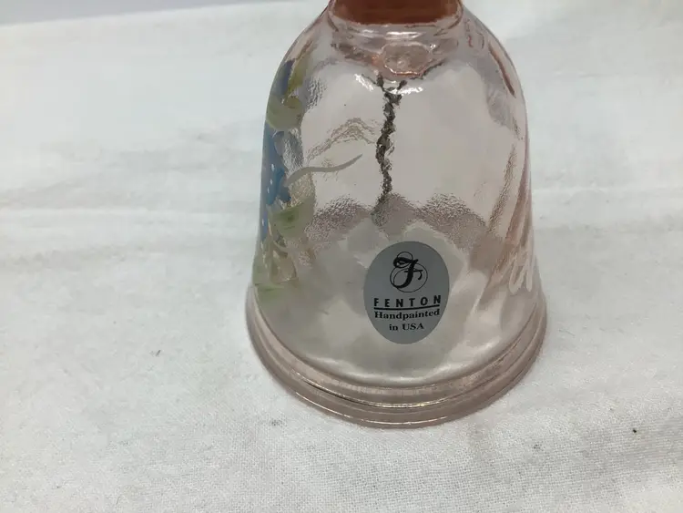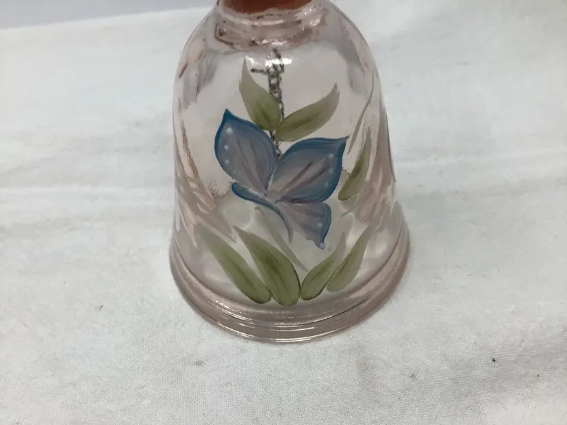 Fenton Hand Painted Signed Glass Bell. It is pink glass bell with a butterfly painted on it. It is signed by the artist D Irizarry. It is in great condition with no chips or cracks. It measures approximately 4 1/2” tall, and 2 1/2 in diameter.