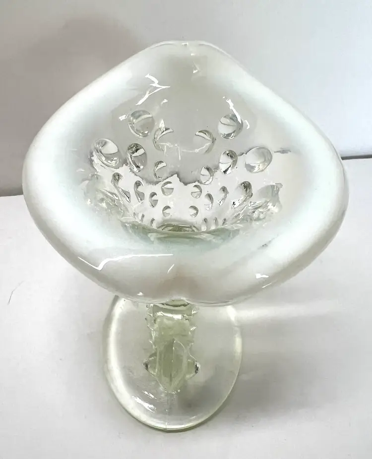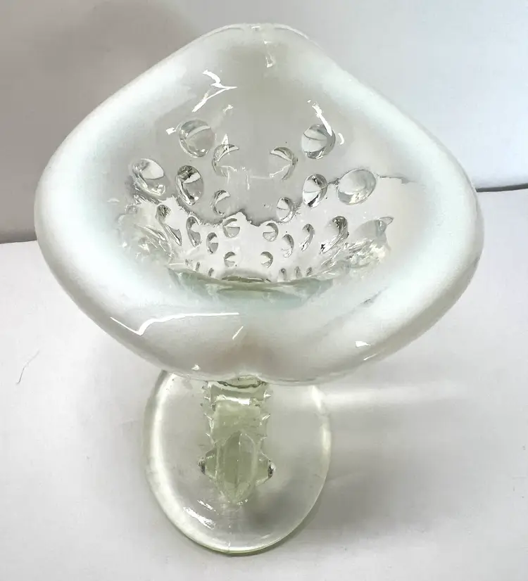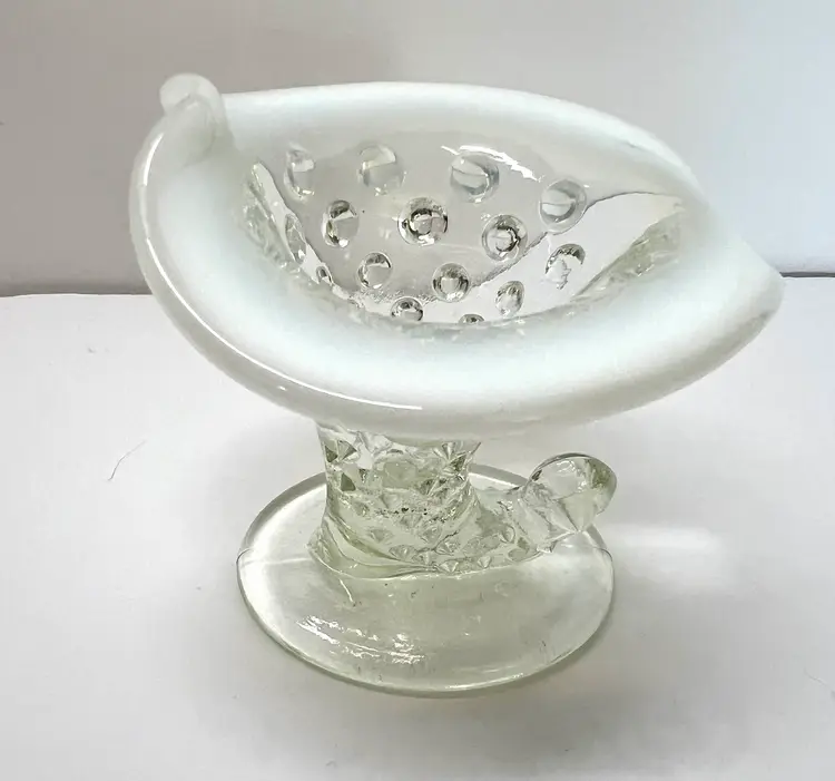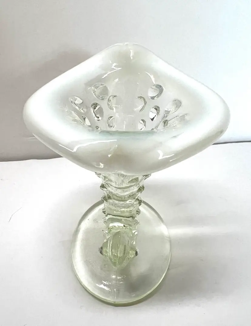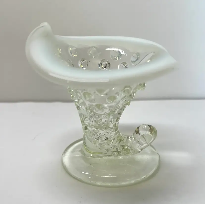 This fabulous Fenton collectible candle holder is featured in the psttern of hobnail opalescent glass. Featuring white this piece would be a grand wedding gift to the lover of vintage. . Made during the 60's and highlighted by a surface of hobnails, this piece would also make a great addition to your collection. Hallmark: unsigned but identified as Fenton Size: 3 1/2 inches tall by 3 inches wide by 3 inches deep Condition: vintage excellent - no chips cracks or damage