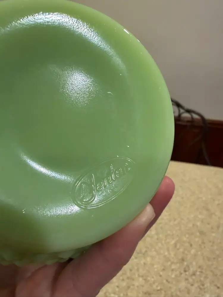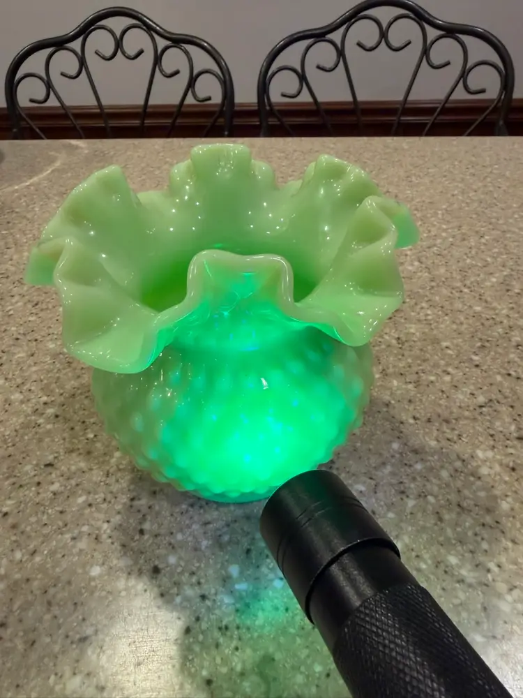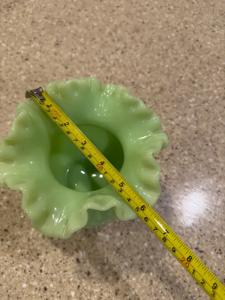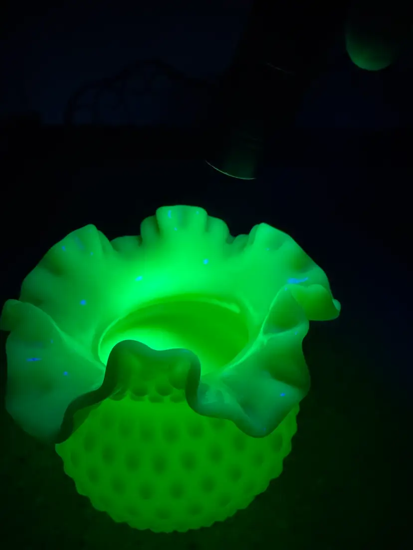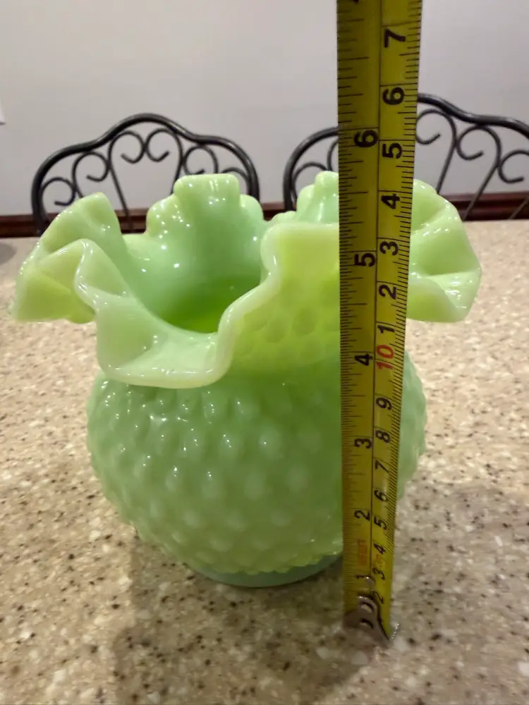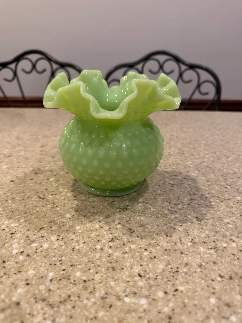 Offered today is one apple green overlay bowl vase from Fenton Art Glass. This vase is in the hobnail pattern with a double crimped ruffle edge. The apple green color is hard to capture in photos. The Apple Green glass contains uranium and will glow under black light. In excellent condition.