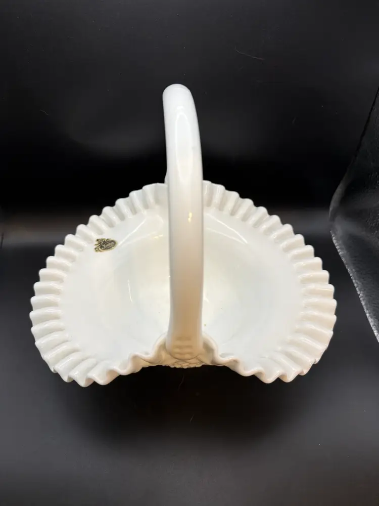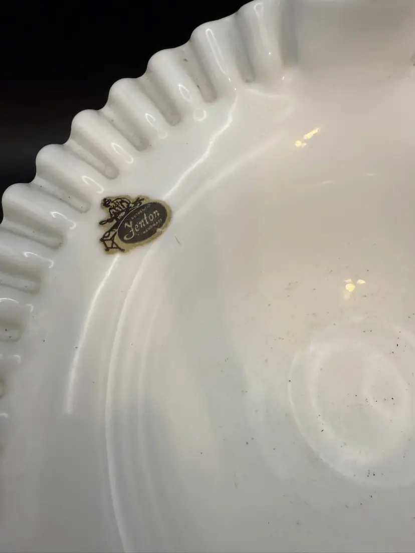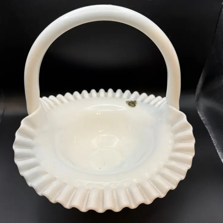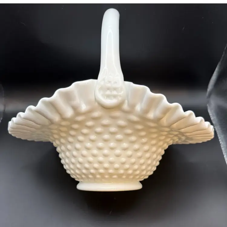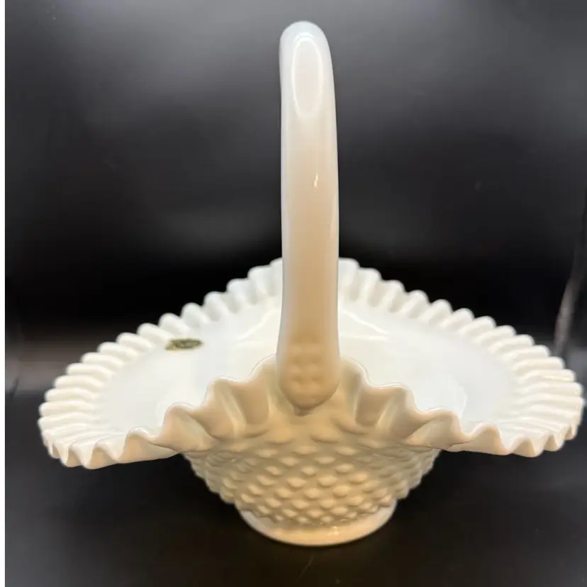 Vintage Fenton Hobnail Milk Glass Basket. Distinctive Features: It features a hobnail pattern, a ruffled or crimped edge, and an applied handle.These baskets can be used for decor, as a planter, to hold fruits or candies, as a wedding basket, or as a table centerpiece. It is 9 in high and 9.75 in at widest point