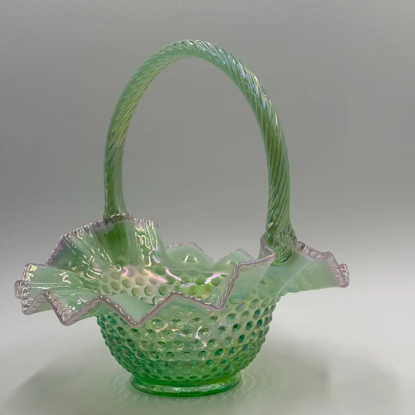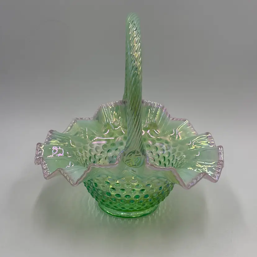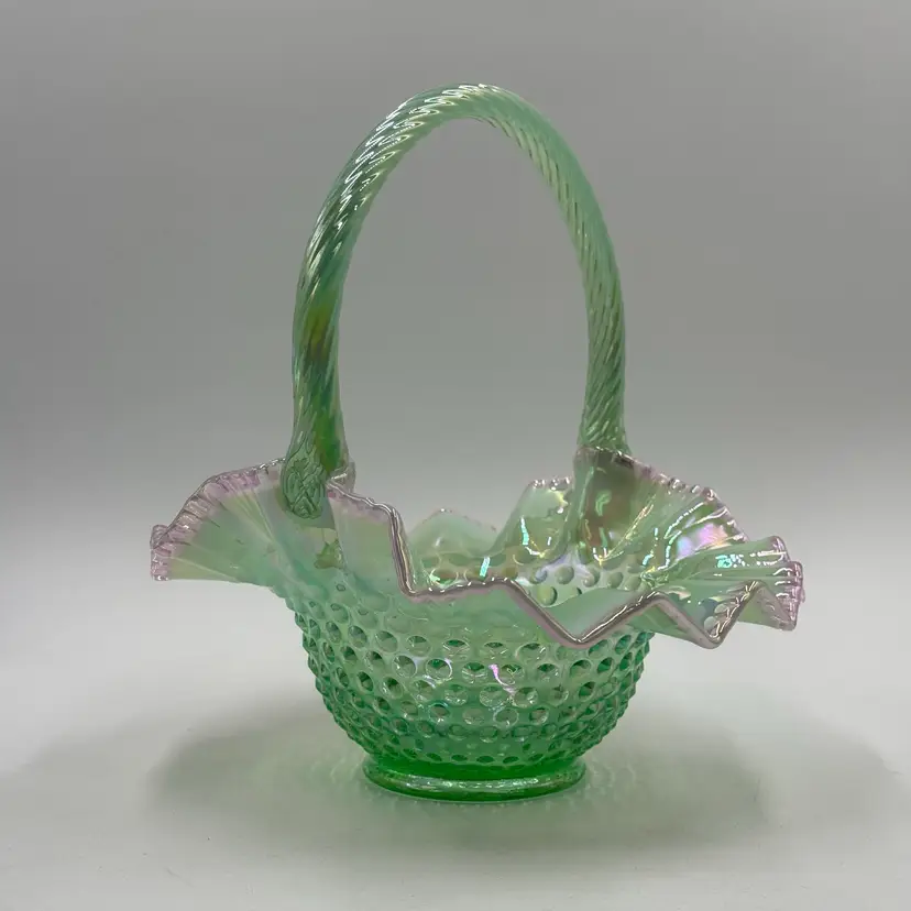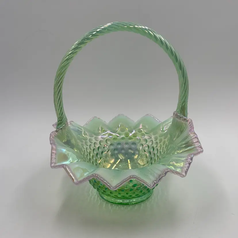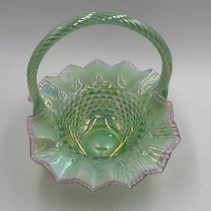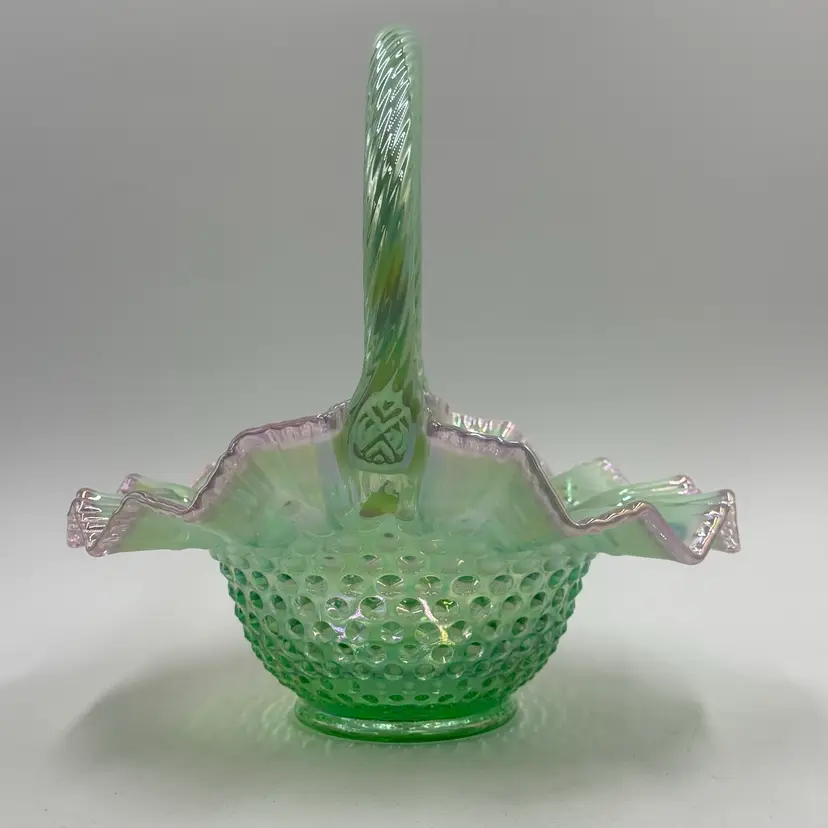 FACTORY SECOND There is a block style letter F on the bottom indicating that this basket is a factory second. Meaning, this mark was applied to pieces that had minor manufacturing defects, such as small air bubbles, color variations, or faint internal lines This would date this basket to 1998-2011.