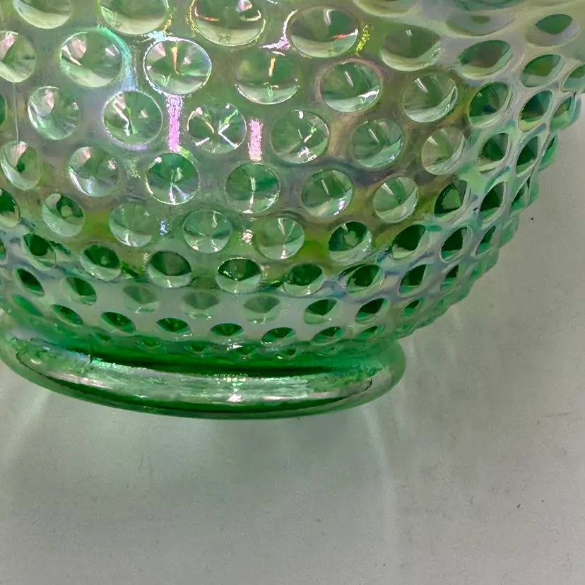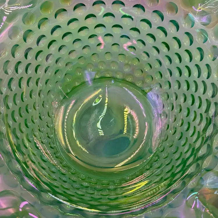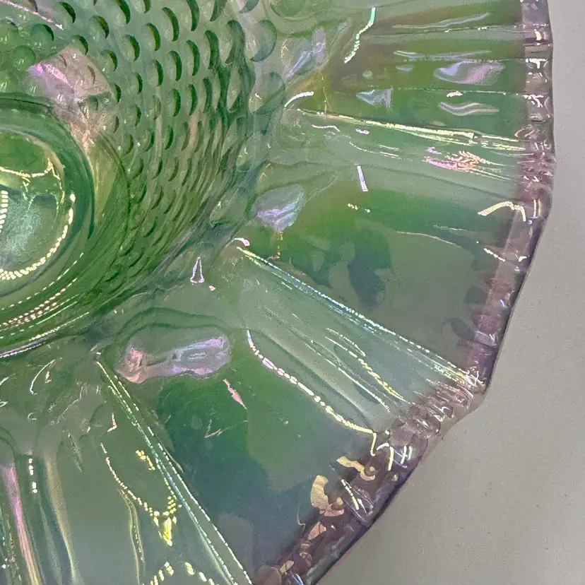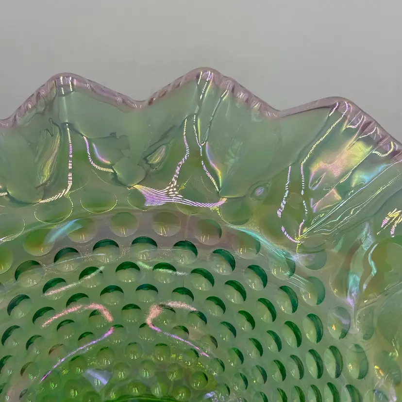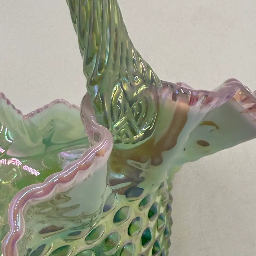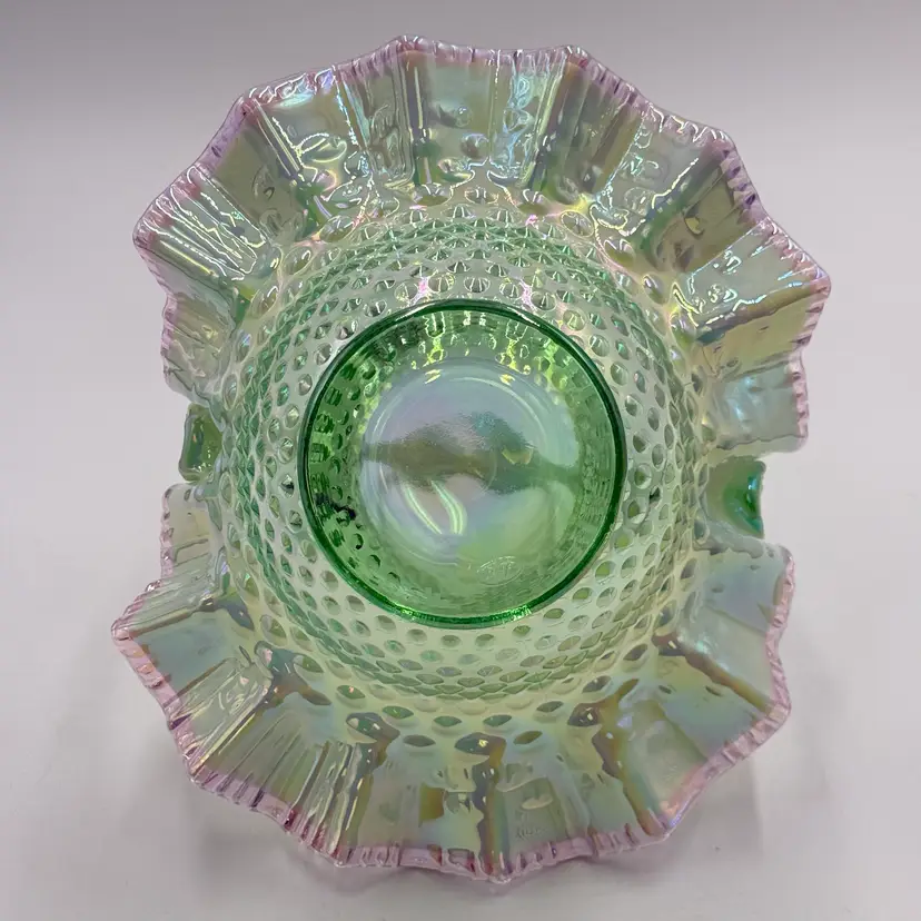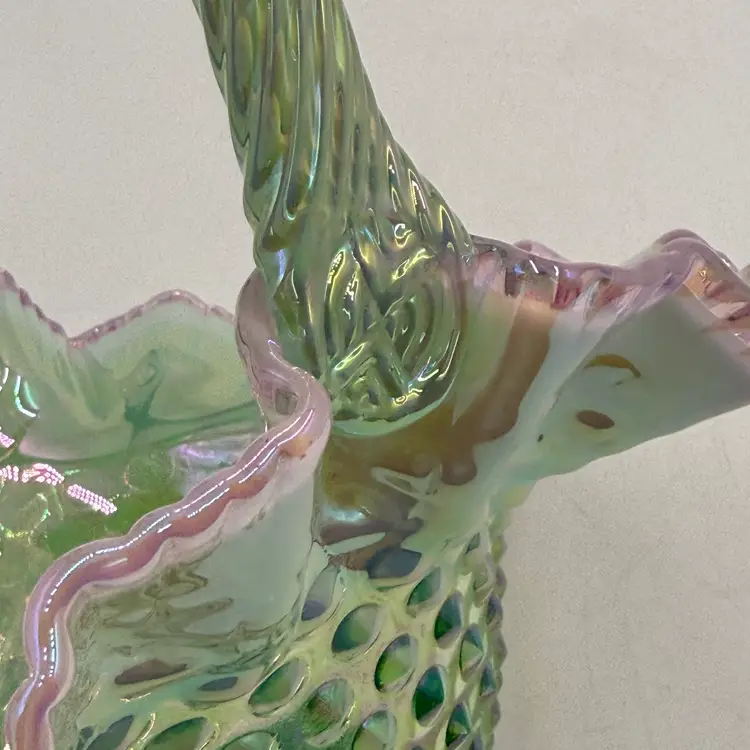 FACTORY SECOND There is a block style letter F on the bottom indicating that this basket is a factory second. Meaning, this mark was applied to pieces that had minor manufacturing defects, such as small air bubbles, color variations, or faint internal lines This would date this basket to 1998-2011.