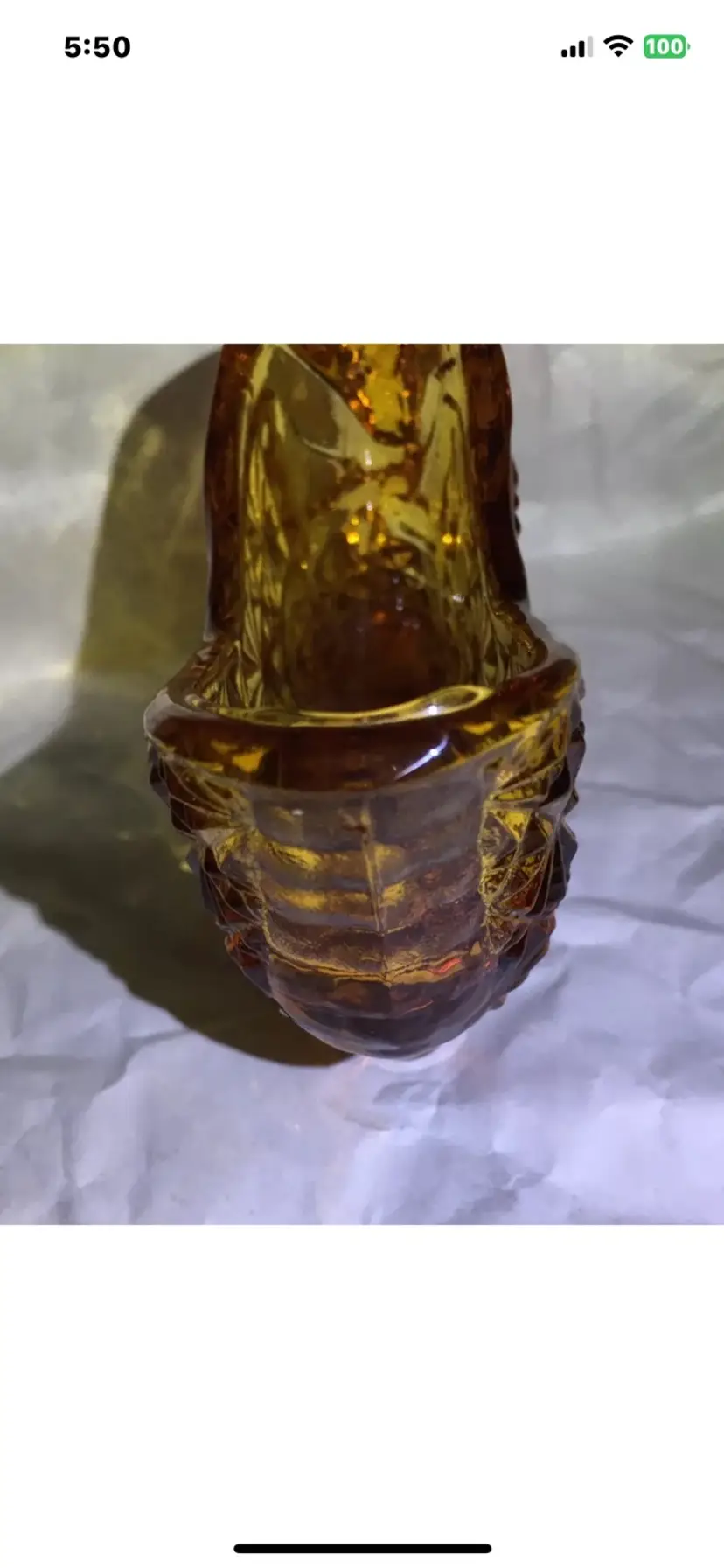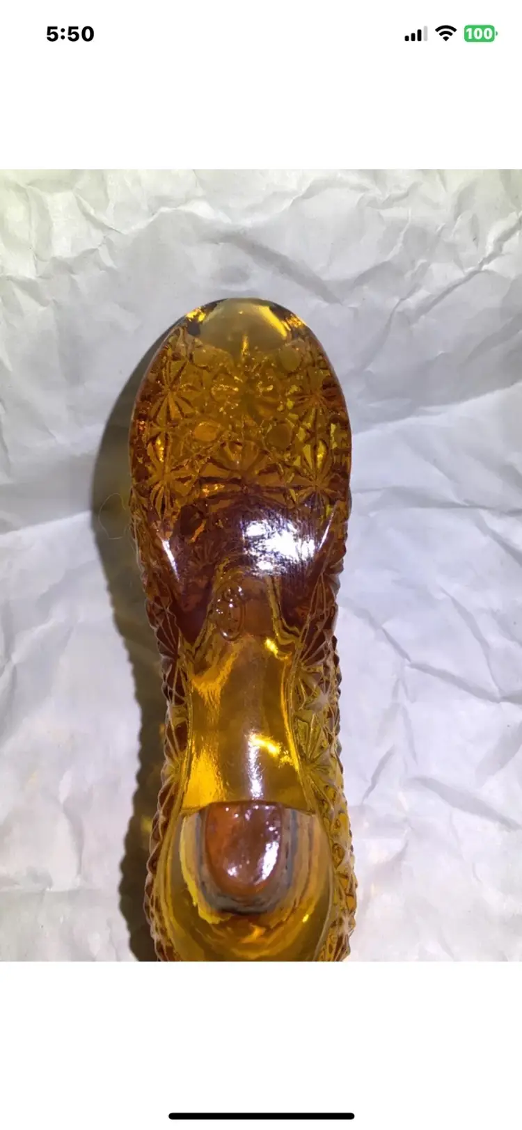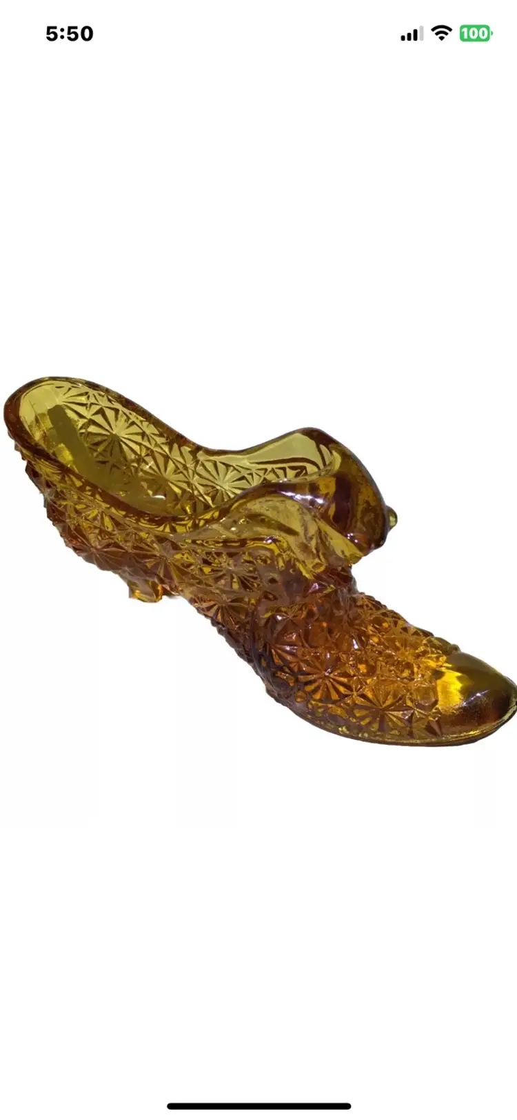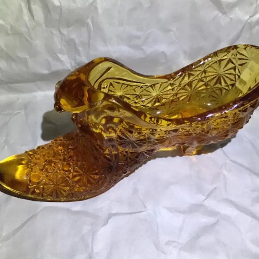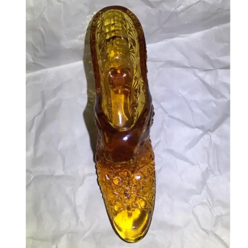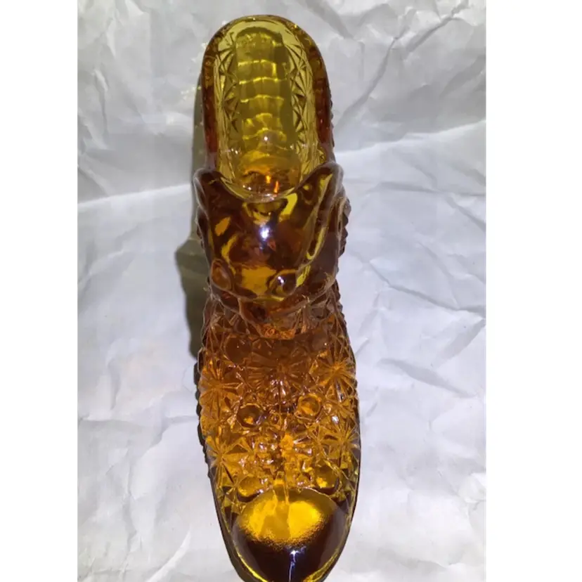 Add a touch of vintage charm to your decor with this beautiful slipper shoe from Fenton. The shoe features a glossy finish in shades of honey gold amber and is decorated with a daisy, button, and puma cat pattern. Measuring 5.5 inches in length, 2.5 inches in height, and 1.5 inches in width, this decorative piece is perfect for collectors and lovers of fine art glass. Crafted with care and attention to detail, this slipper is made in the United States using molded art glass production techniques, this shoe is a unique and special addition to any collection. With its intricate design and beautiful colors, it is sure to be a conversation starter and a cherished piece for years to come. Great condition. No chips or cracks. Great gift and collection item. Nice home decor.