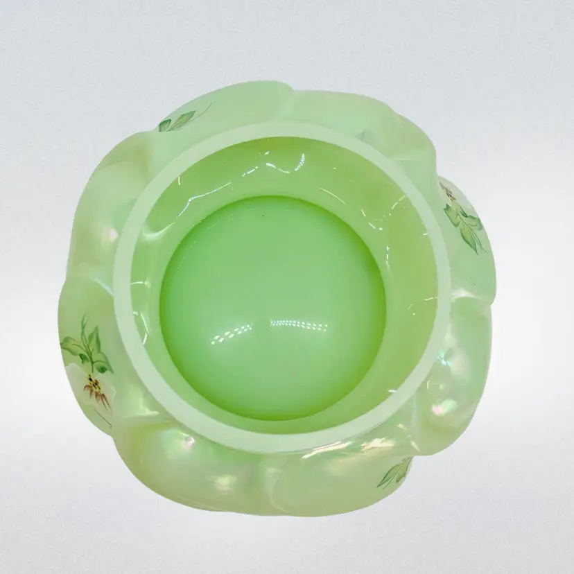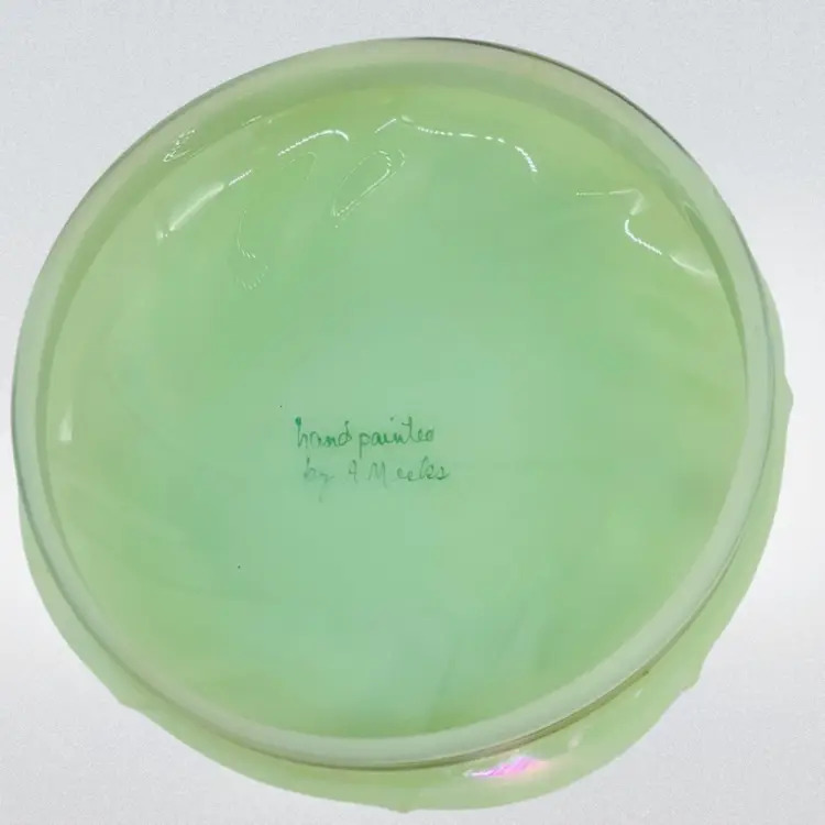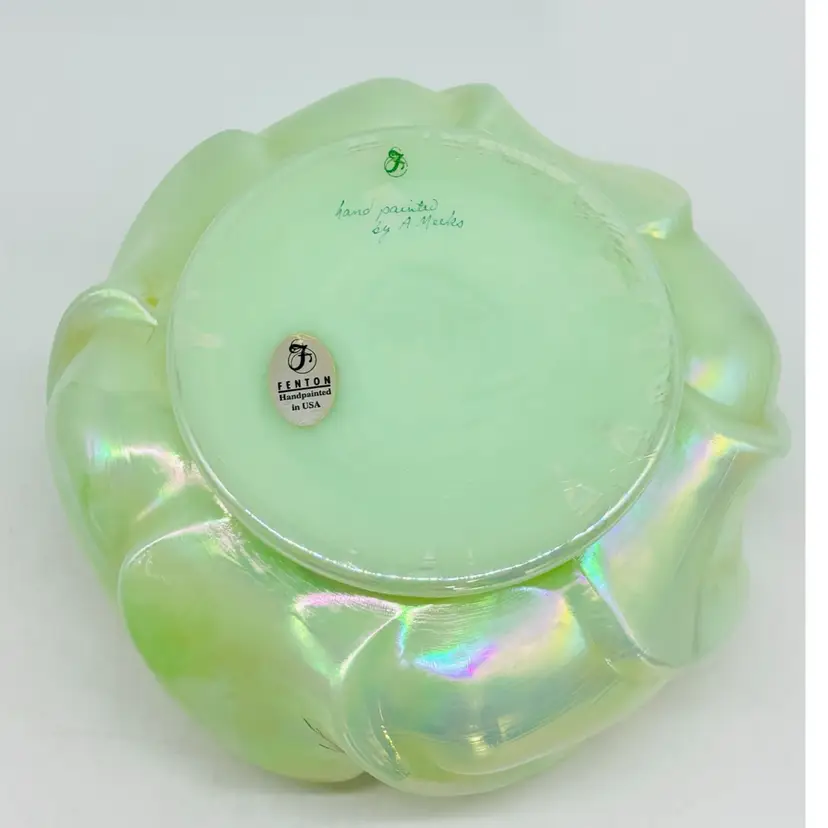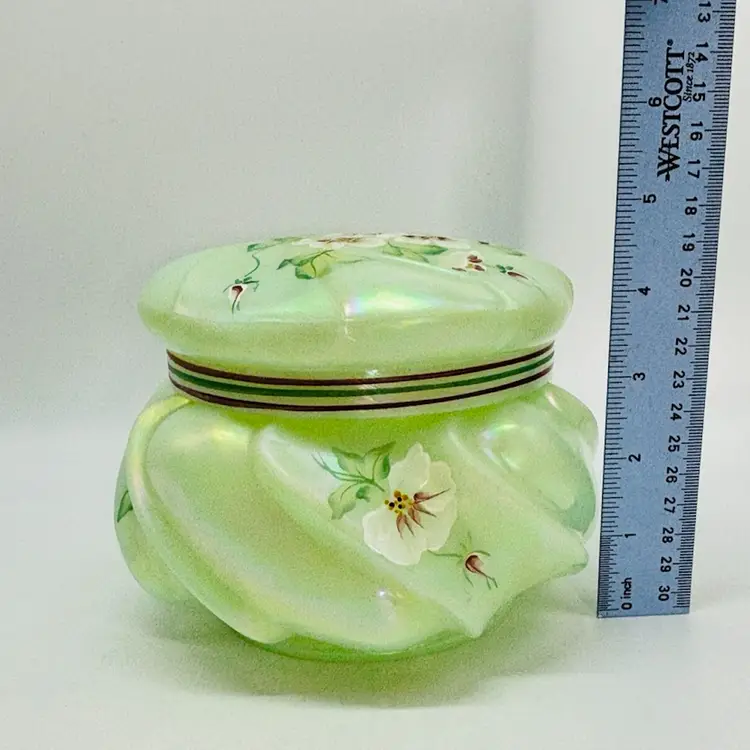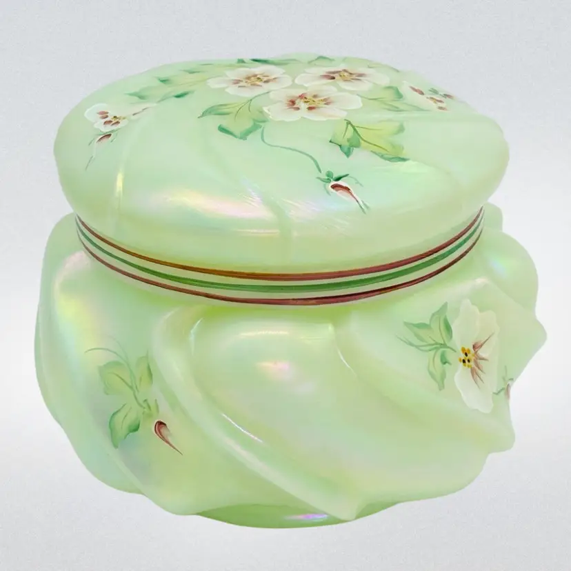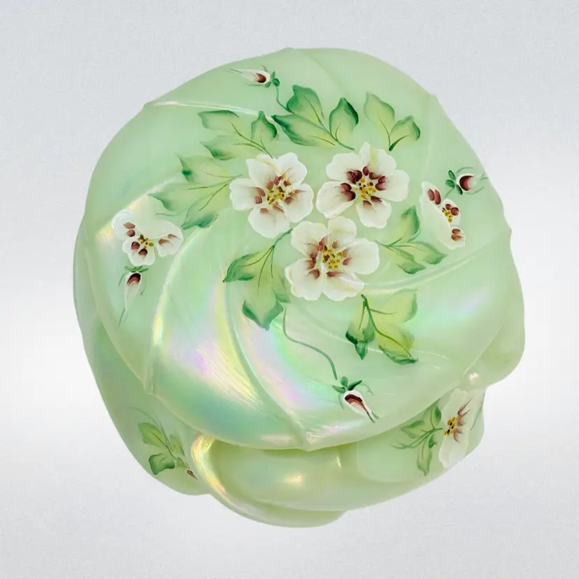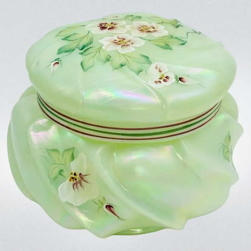 Fenton WaveCrest dresser box all hand painted over the loveliest iridescent Sea Mist green. Banded design around rim of lid and signed by the artist on both the lid and the base. This piece is in excellent condition with no damage or paint loss. Stands approximately 4” tall and 5” wide.