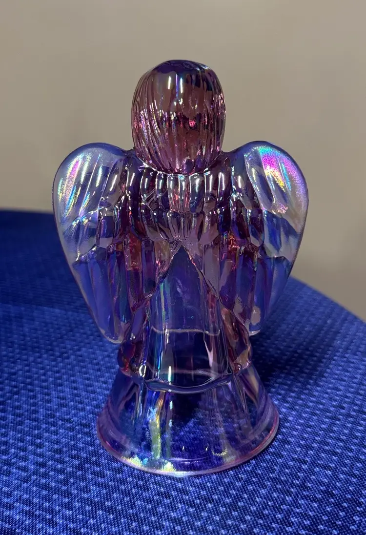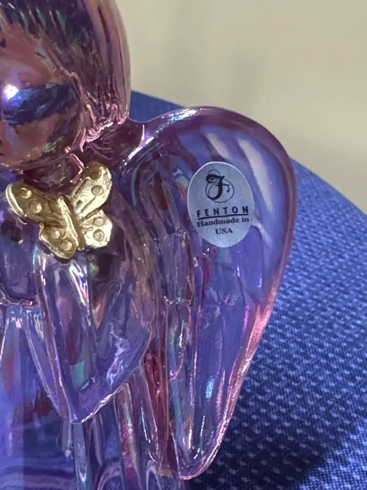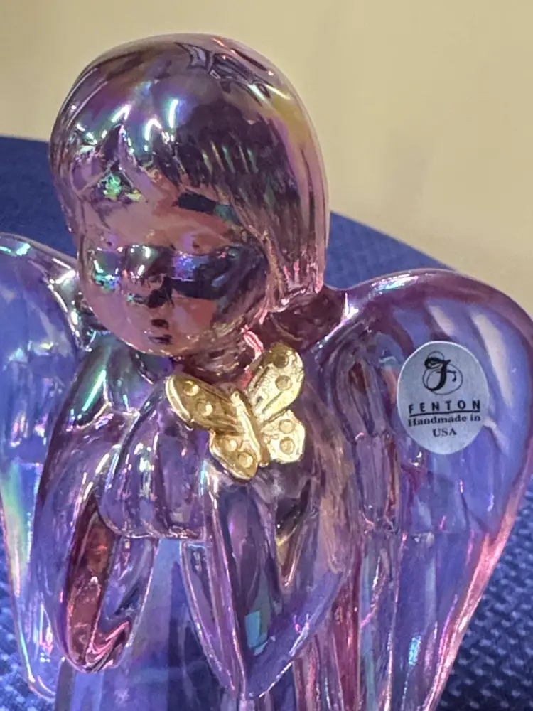 Pink Iridescent Fenton Praying Angel Figurine with gold butterfly and original sticker 6” tall Adorable Excellent condition no breaks or chips (10761072515)
