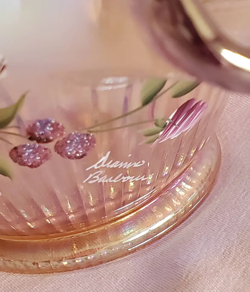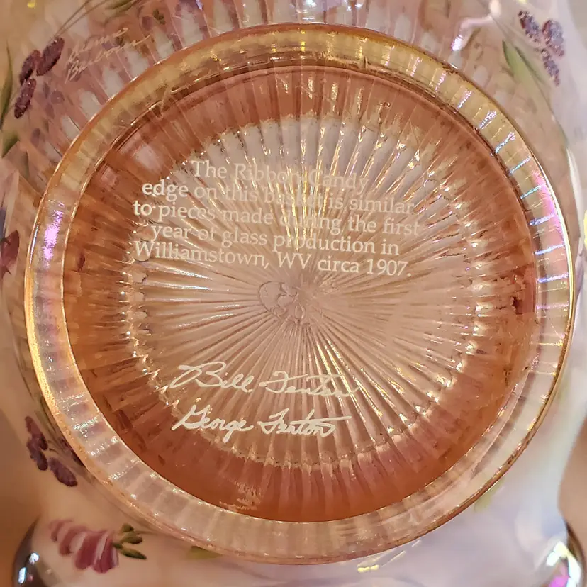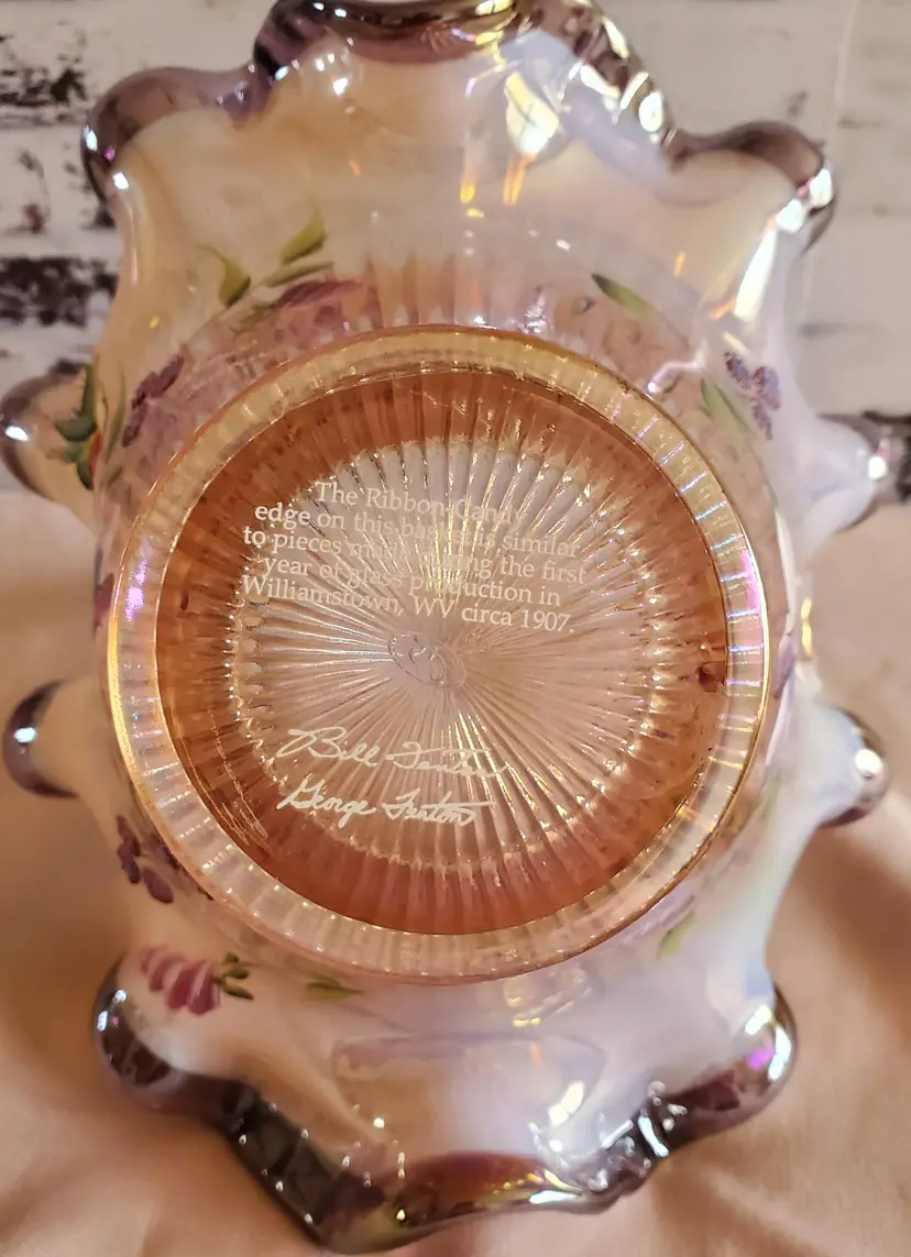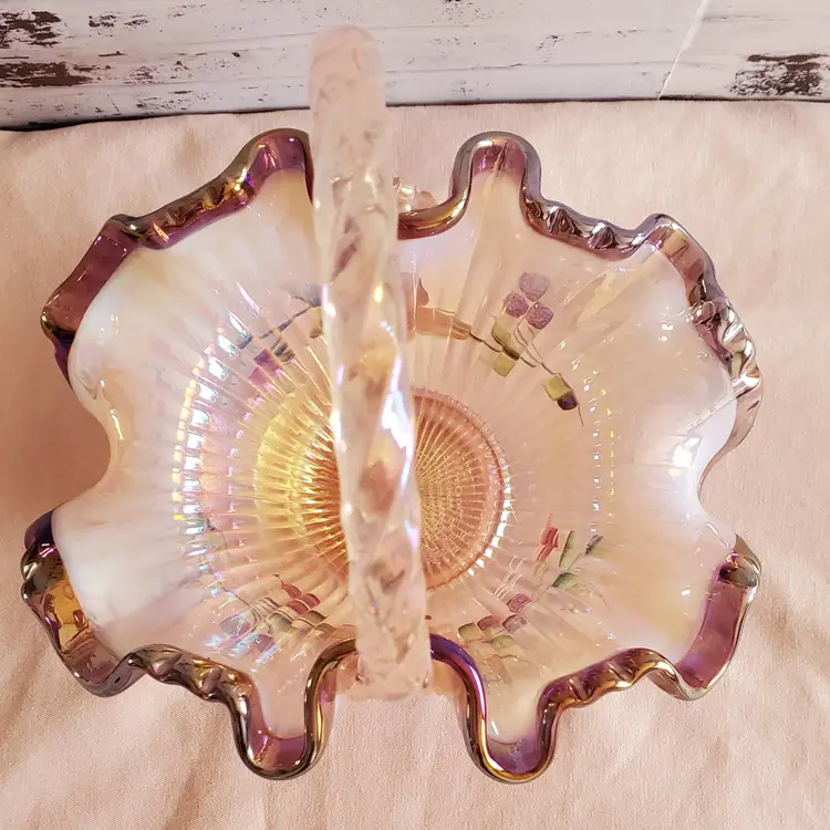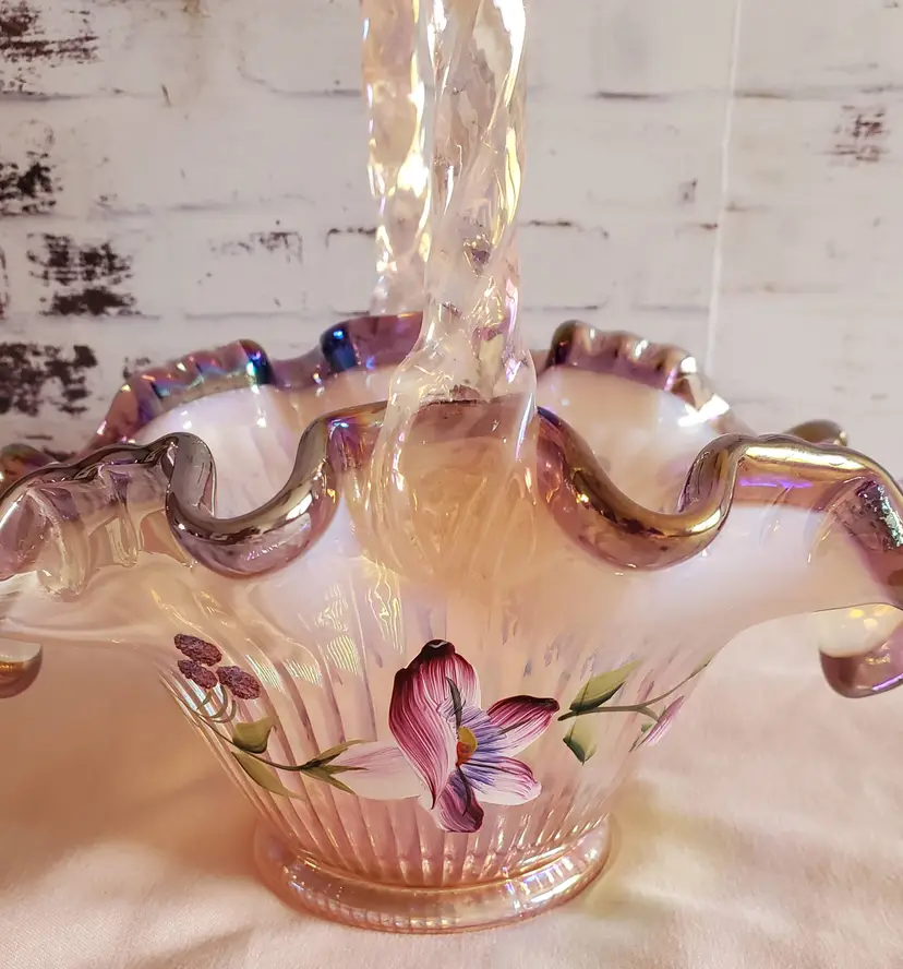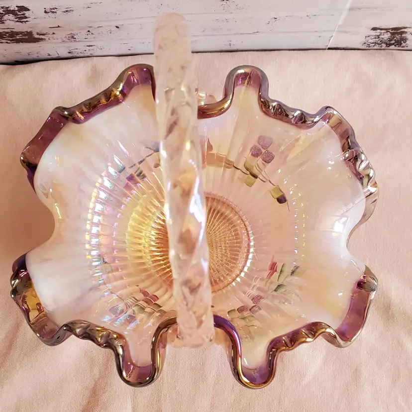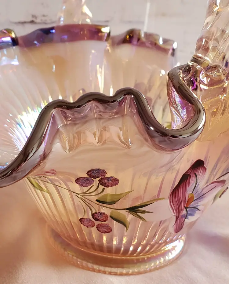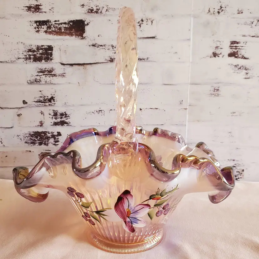 Absolutely STUNNING Fenton Champagne Iridescent Hand Painted Morning Glory Hummingbird Basket, Ribbon Candy Edge, Signed by Bill & George Fenton. Very nice condition, no chips or cracks-Please see all photos. Approx 8" wide and 8.5" tall.